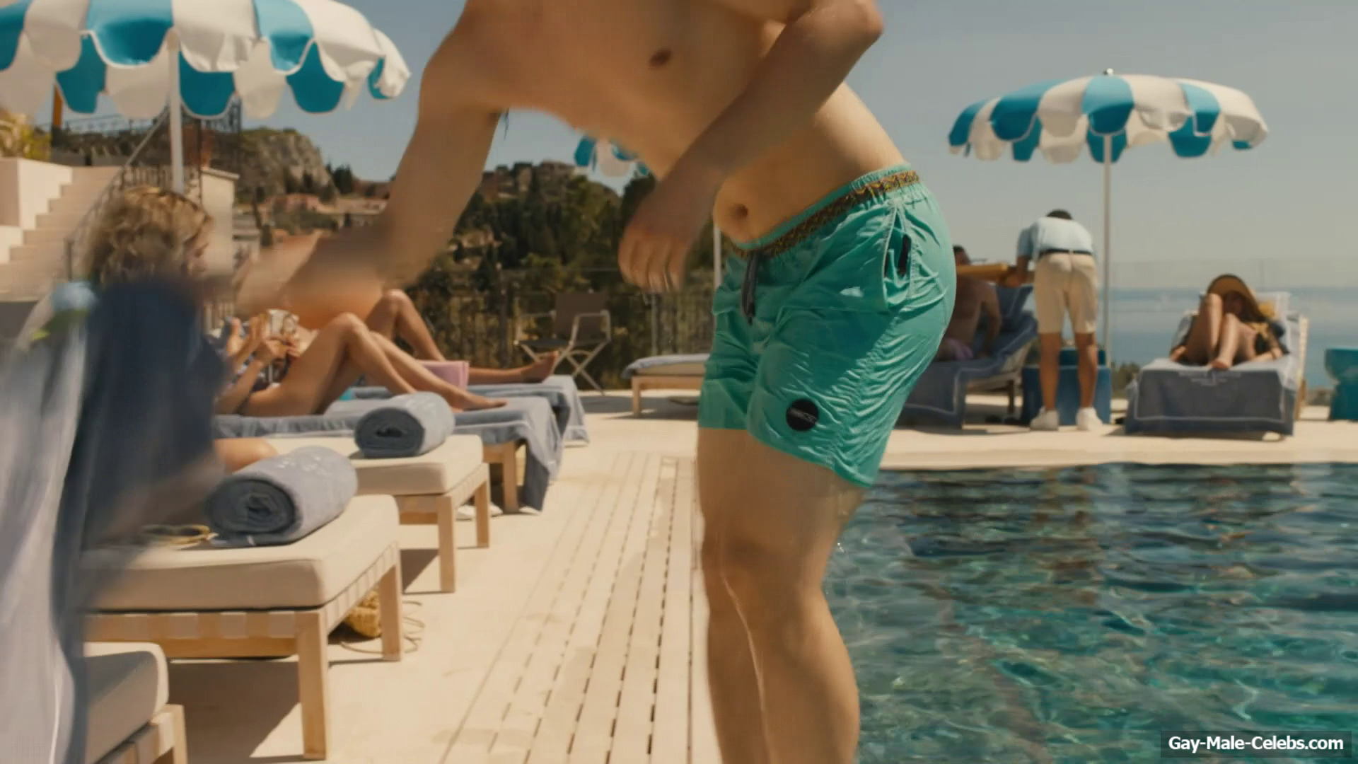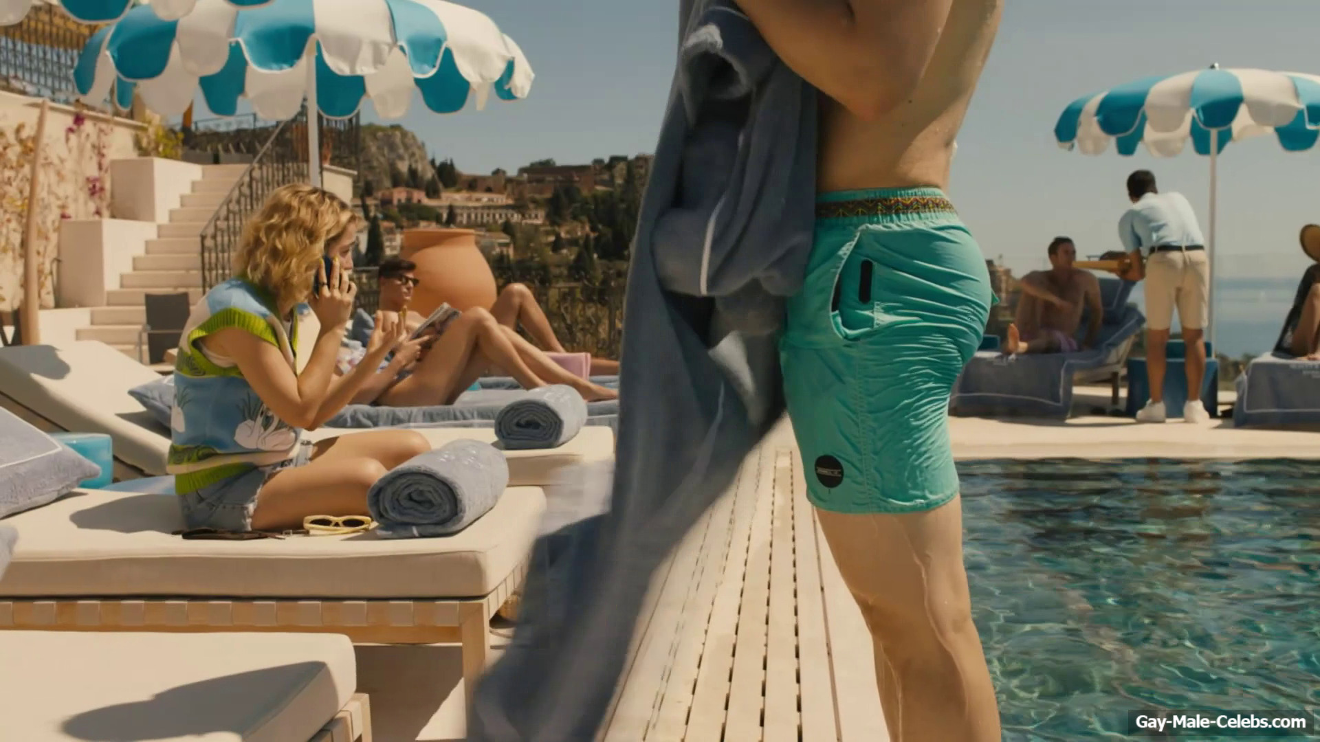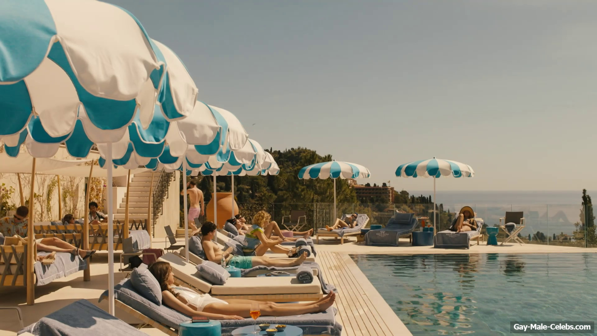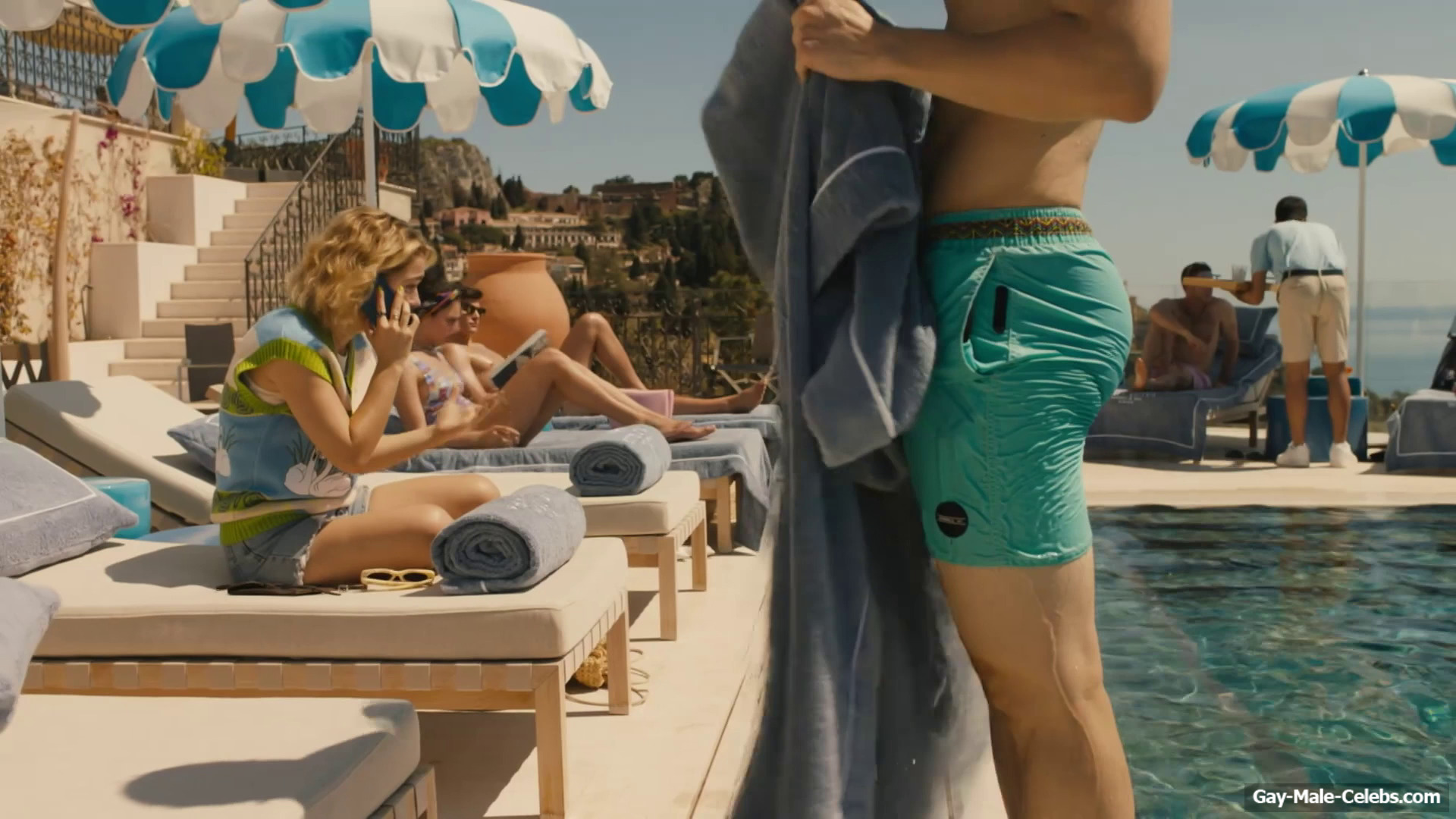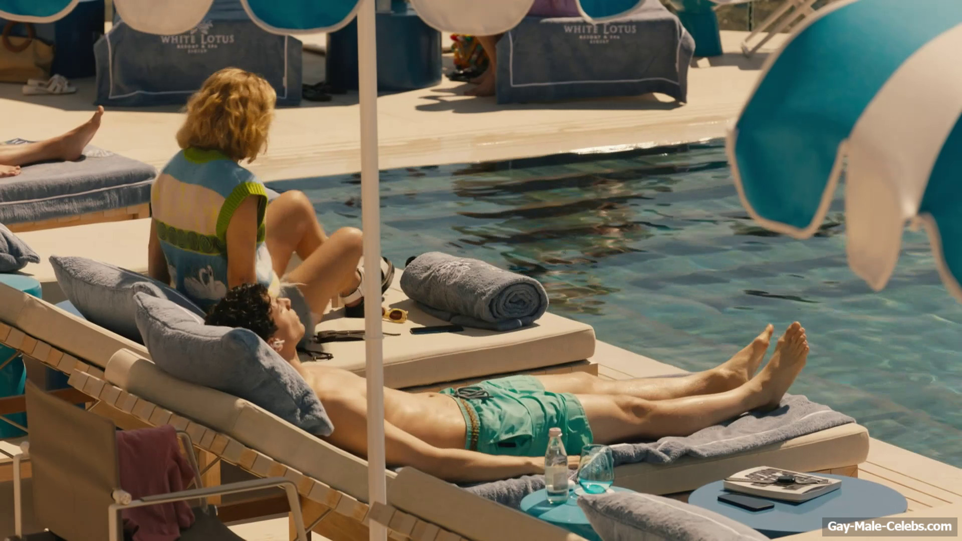 Adam DiMarco sets pulses racing in “The White Lotus”. This guy is relaxing by the pool wearing only turquoise swim trunks that clearly outline his butt. But what really catches our attention is his pumped-up muscular torso, which looks divine when he’s lying on a sun lounger.