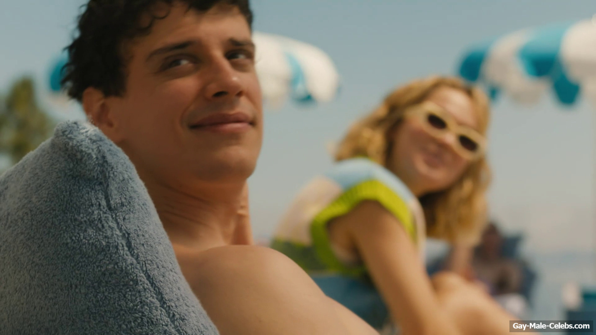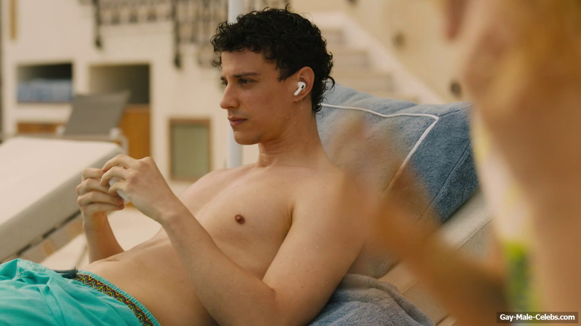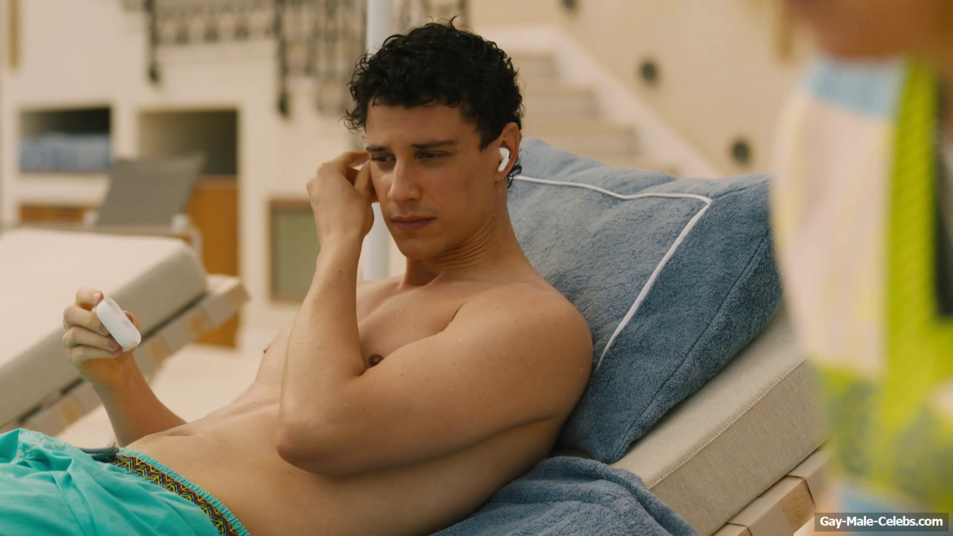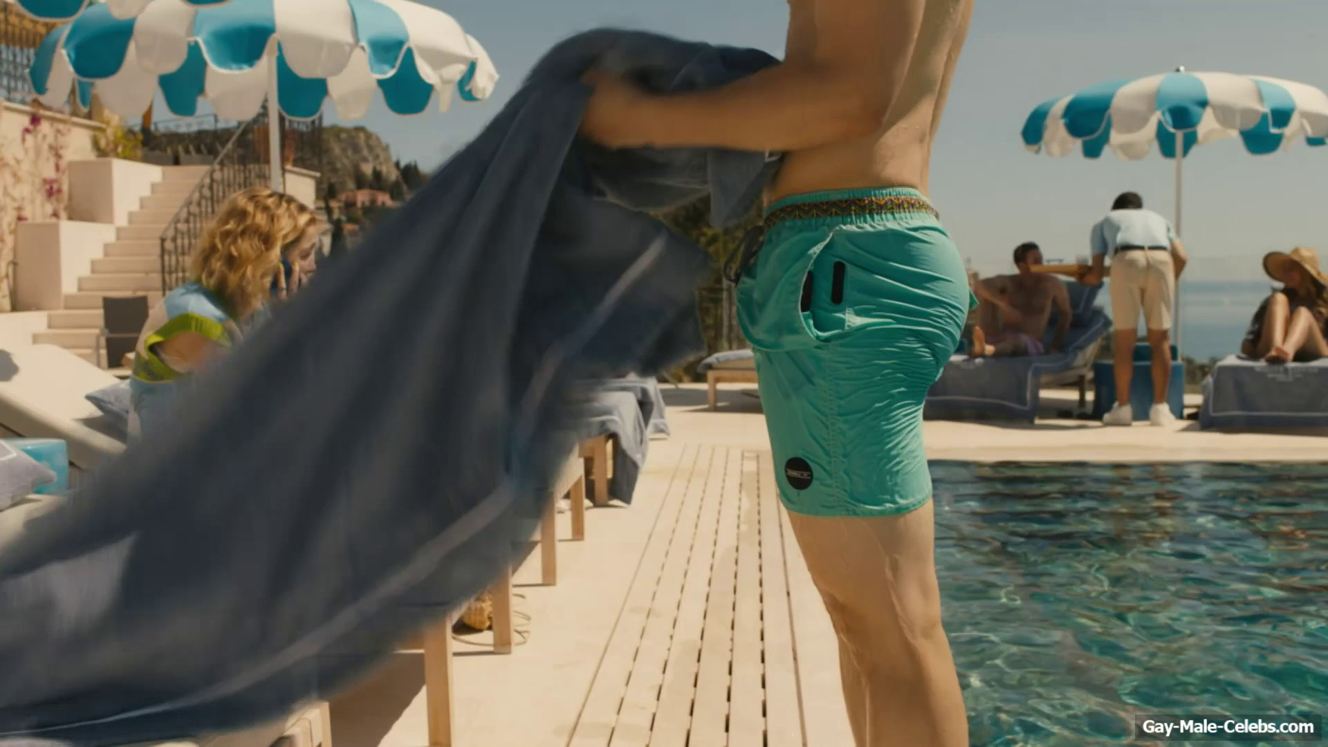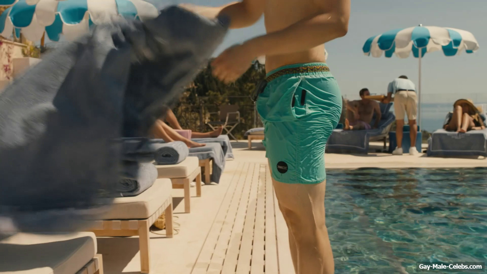 Adam DiMarco sets pulses racing in “The White Lotus”. This guy is relaxing by the pool wearing only turquoise swim trunks that clearly outline his butt. But what really catches our attention is his pumped-up muscular torso, which looks divine when he’s lying on a sun lounger.