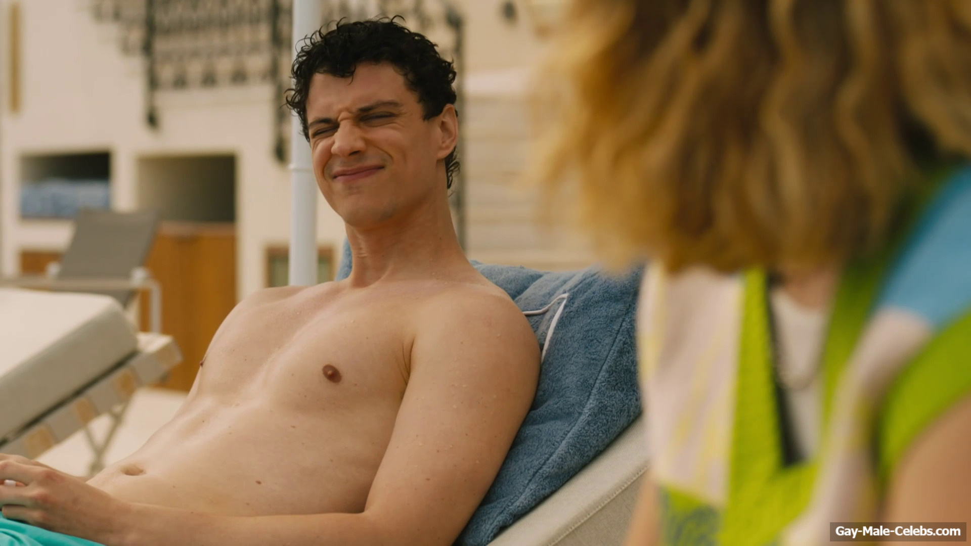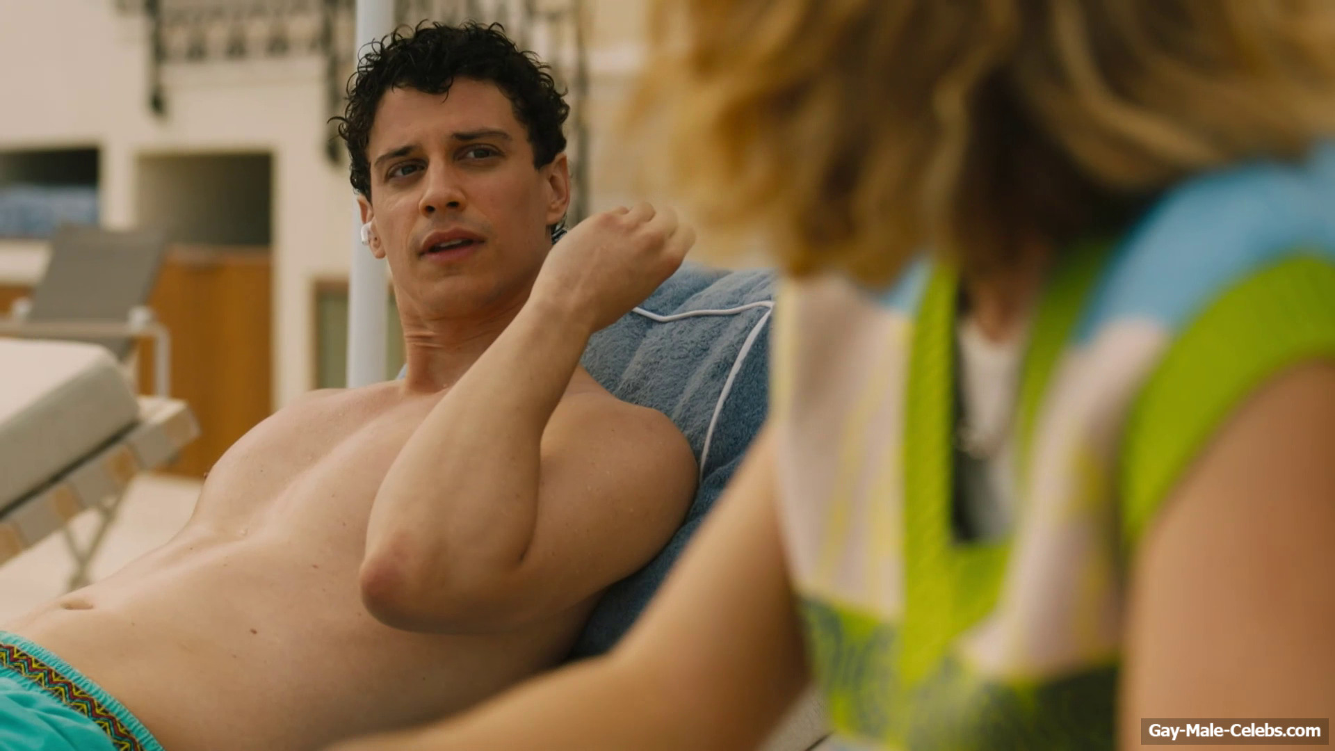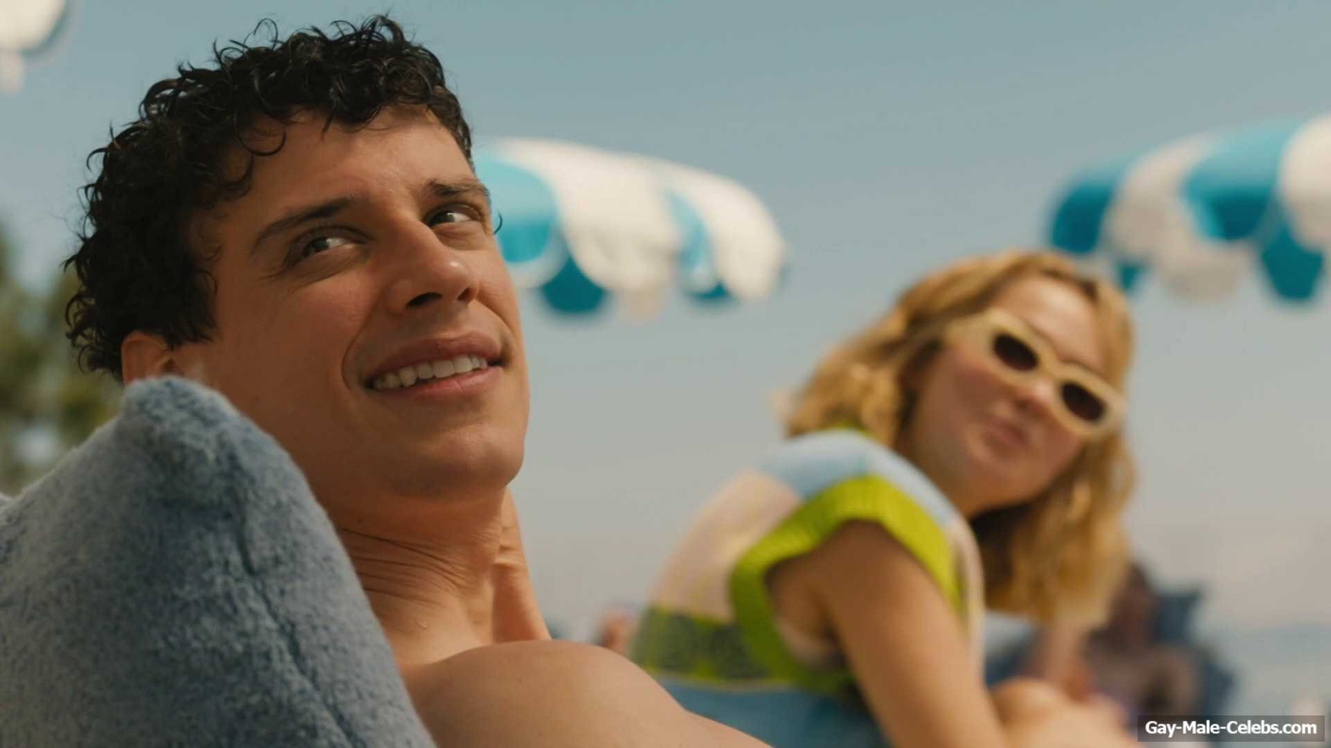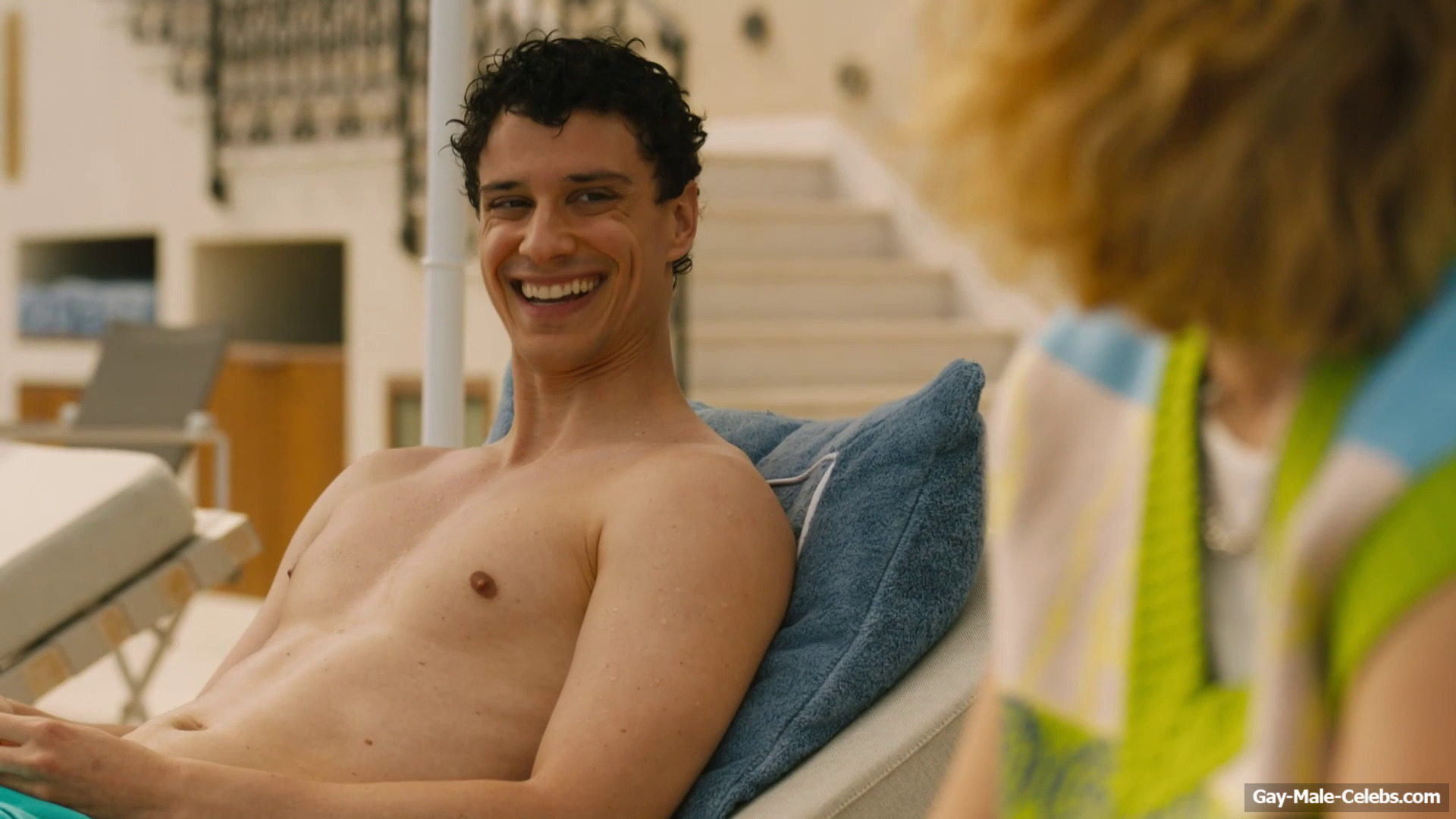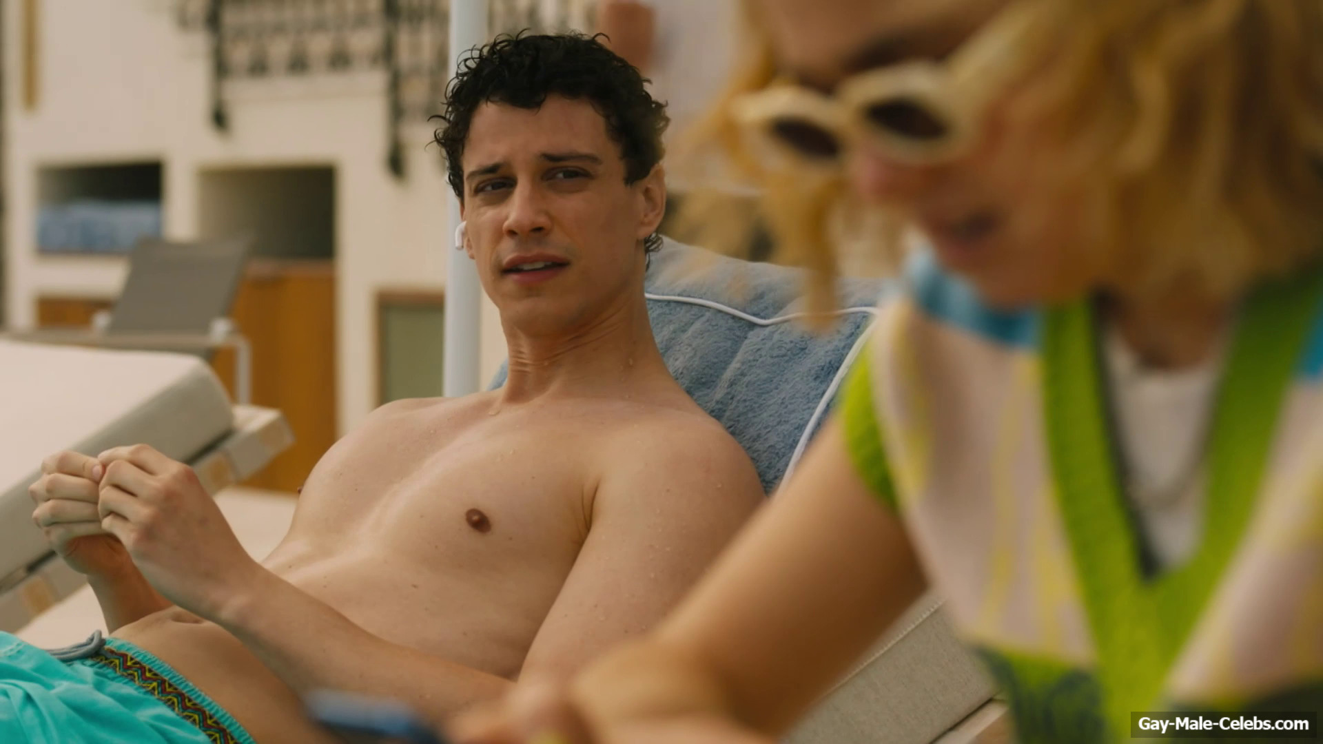 Adam DiMarco sets pulses racing in “The White Lotus”. This guy is relaxing by the pool wearing only turquoise swim trunks that clearly outline his butt. But what really catches our attention is his pumped-up muscular torso, which looks divine when he’s lying on a sun lounger.