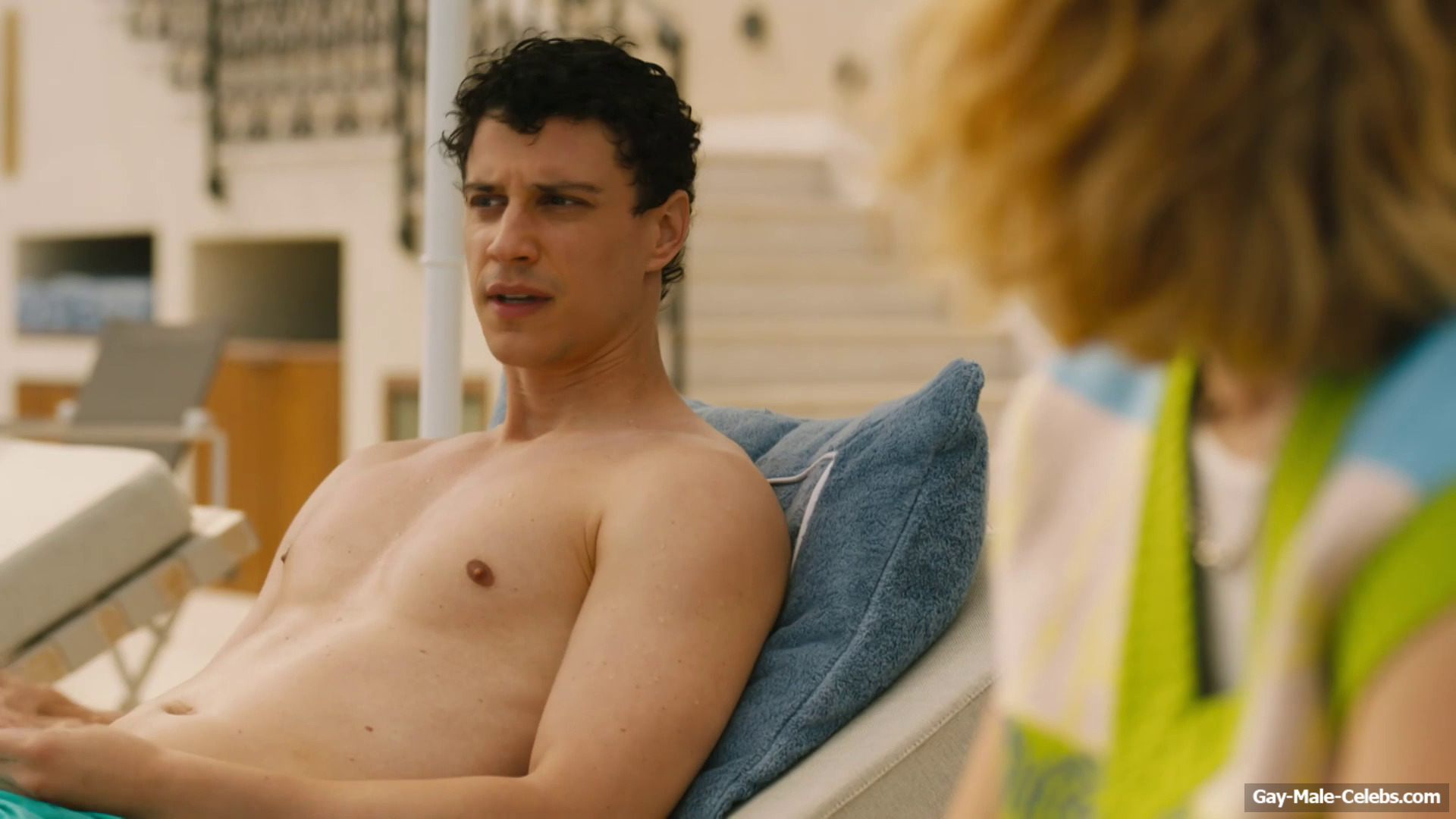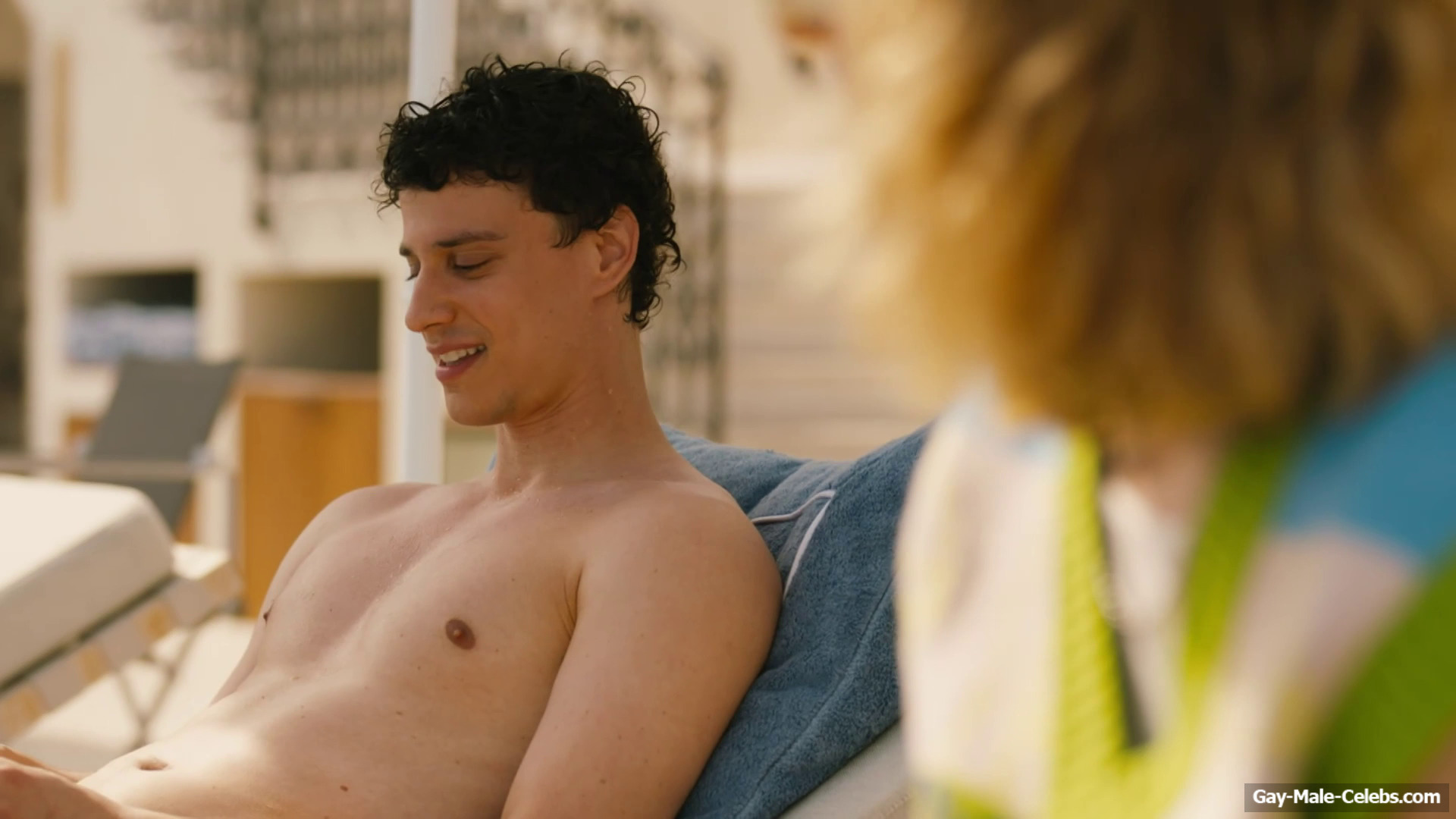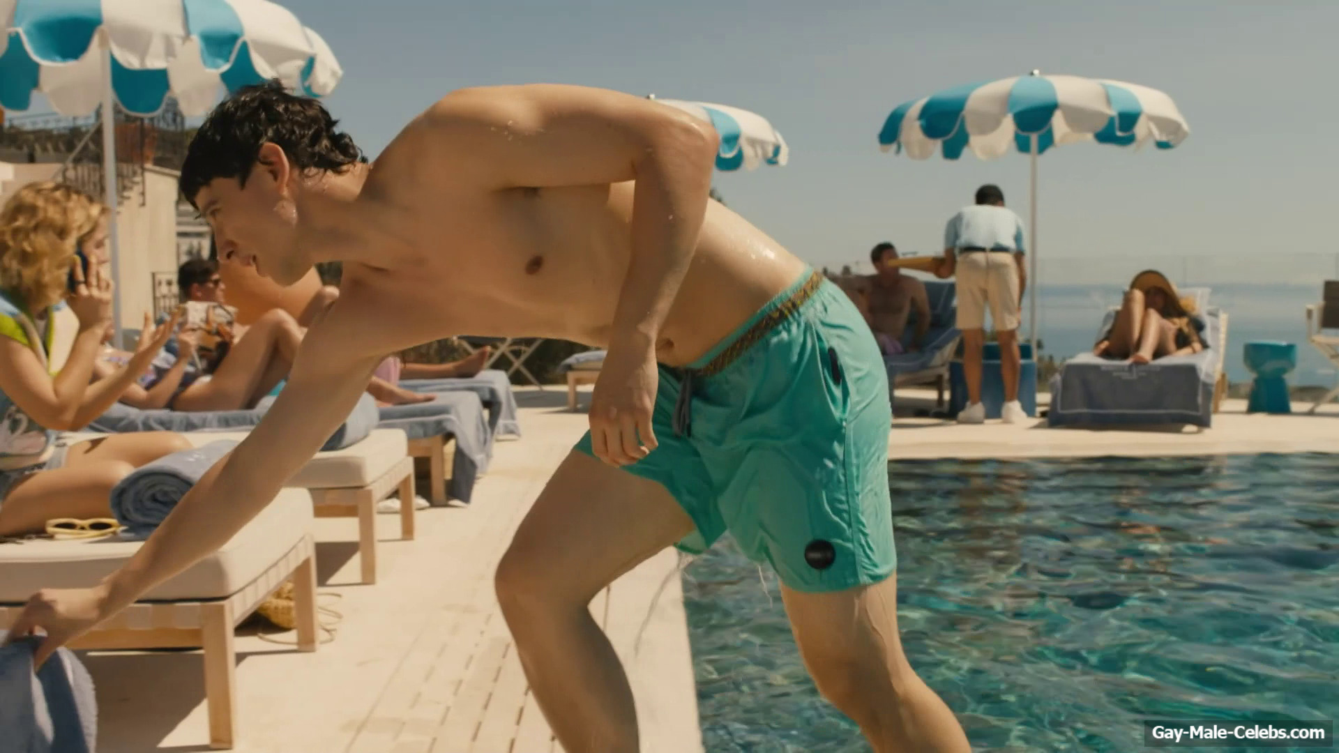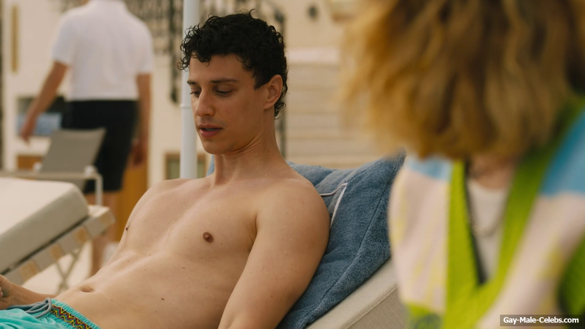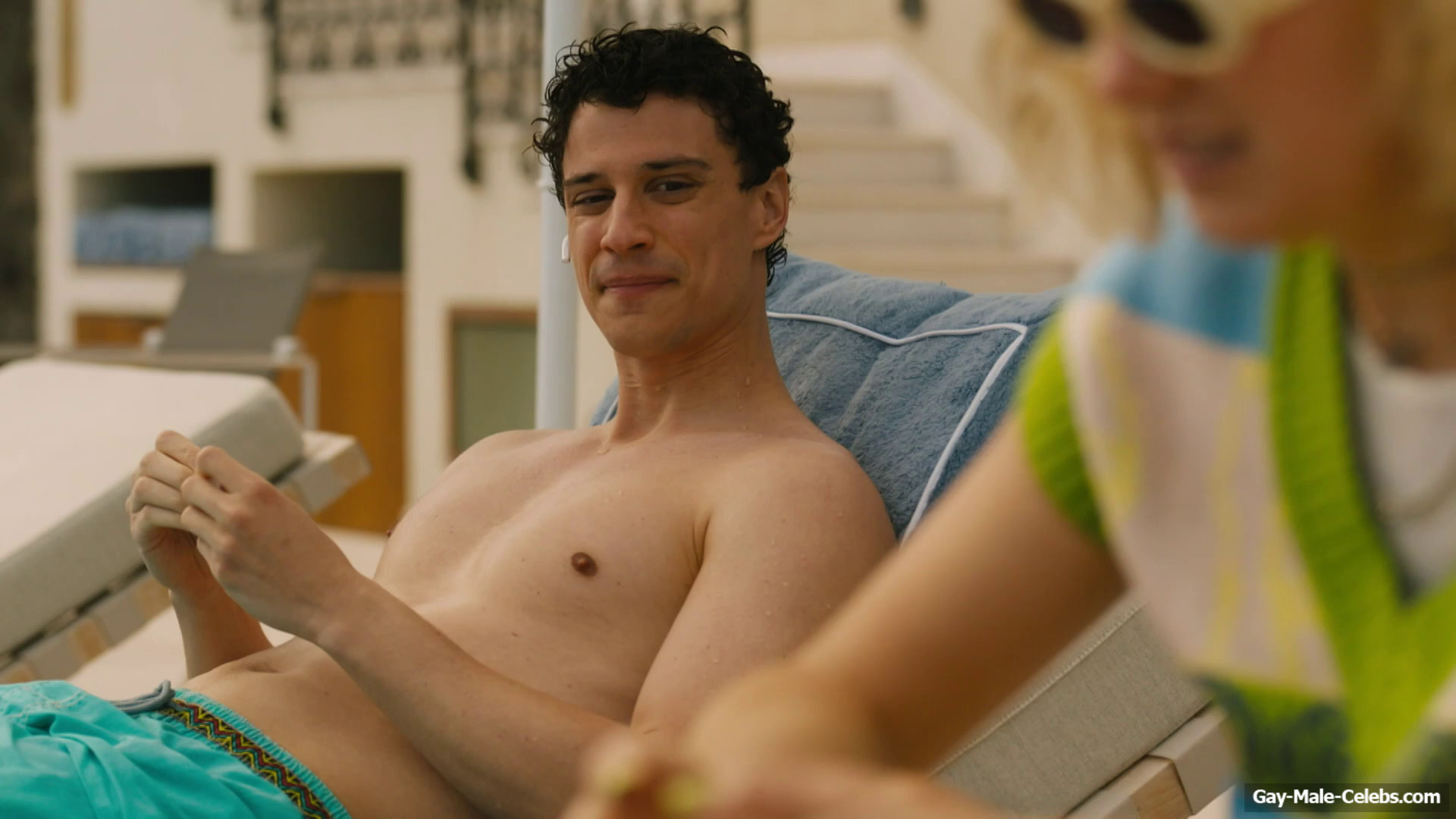 Adam DiMarco sets pulses racing in “The White Lotus”. This guy is relaxing by the pool wearing only turquoise swim trunks that clearly outline his butt. But what really catches our attention is his pumped-up muscular torso, which looks divine when he’s lying on a sun lounger.