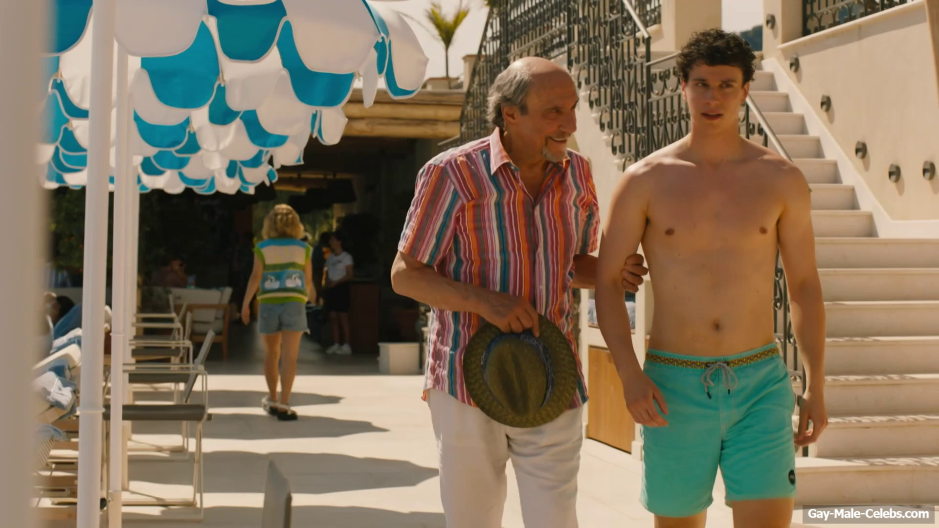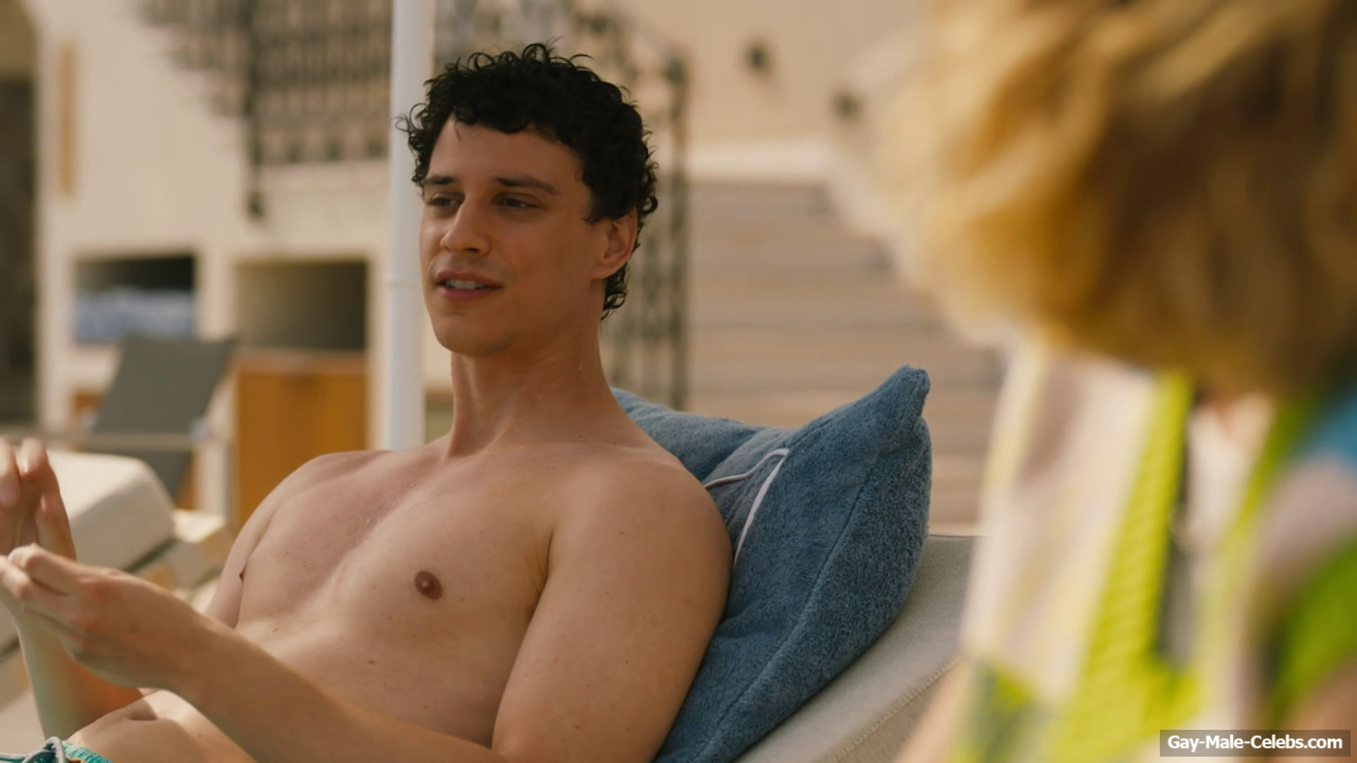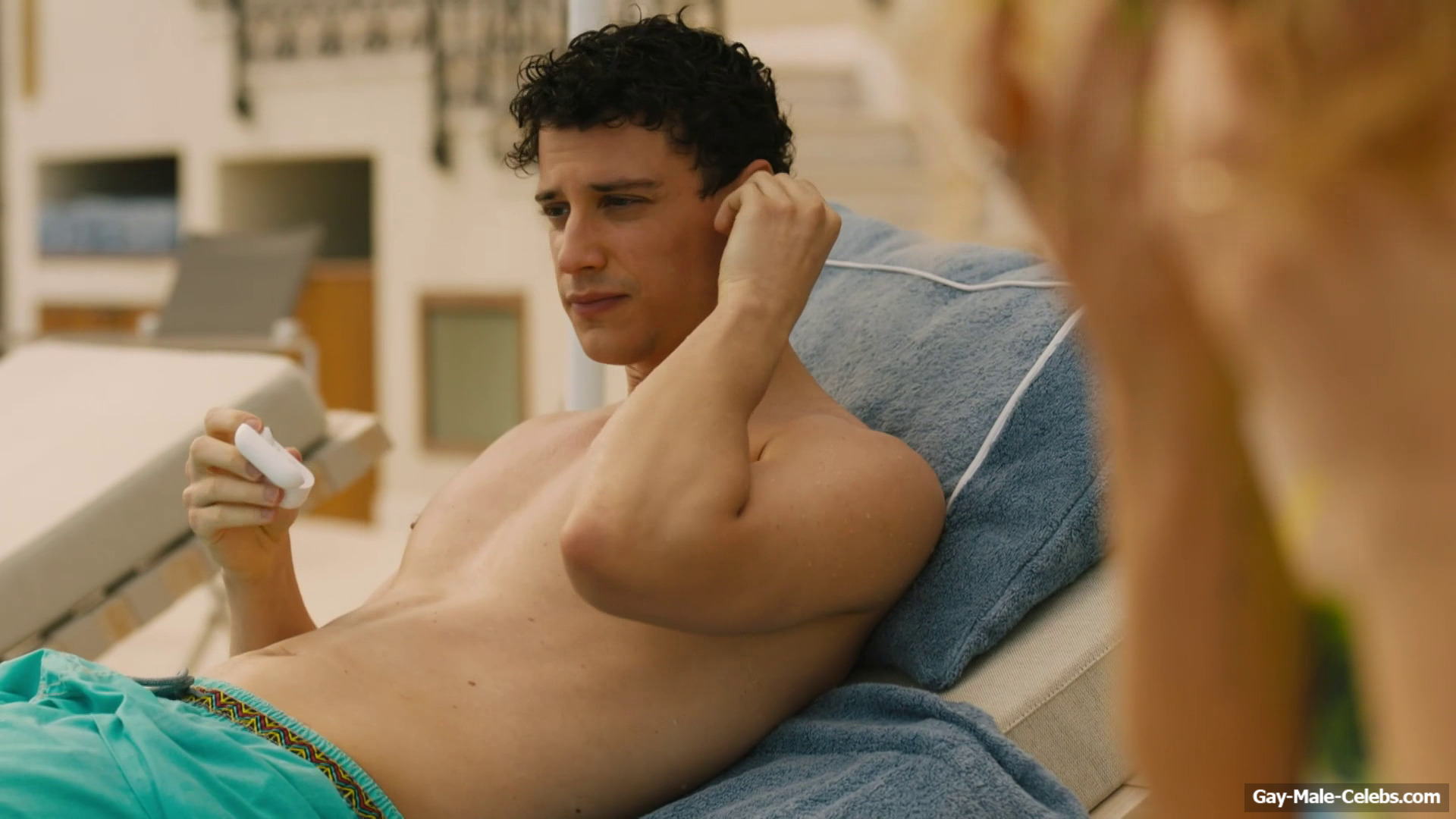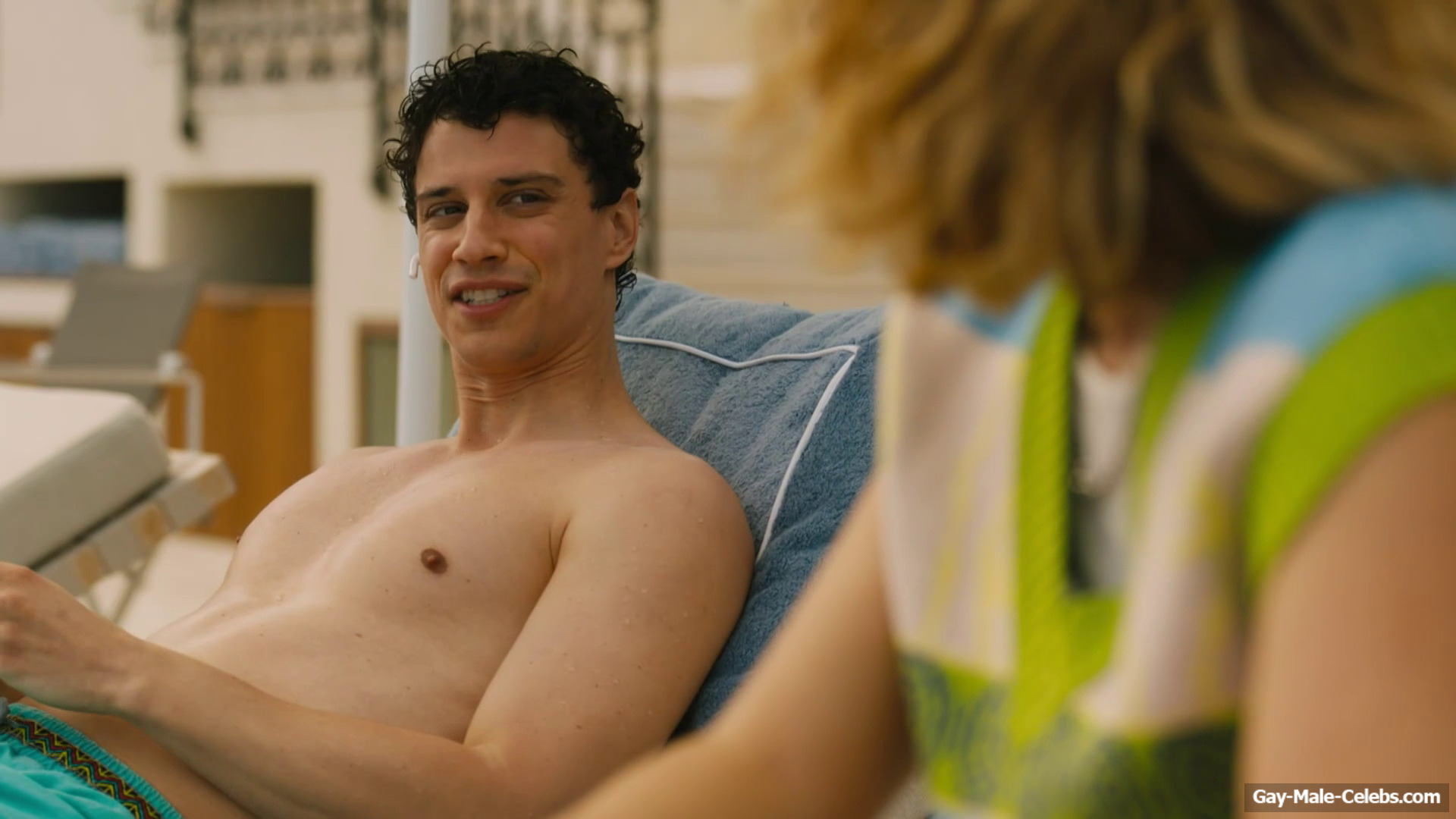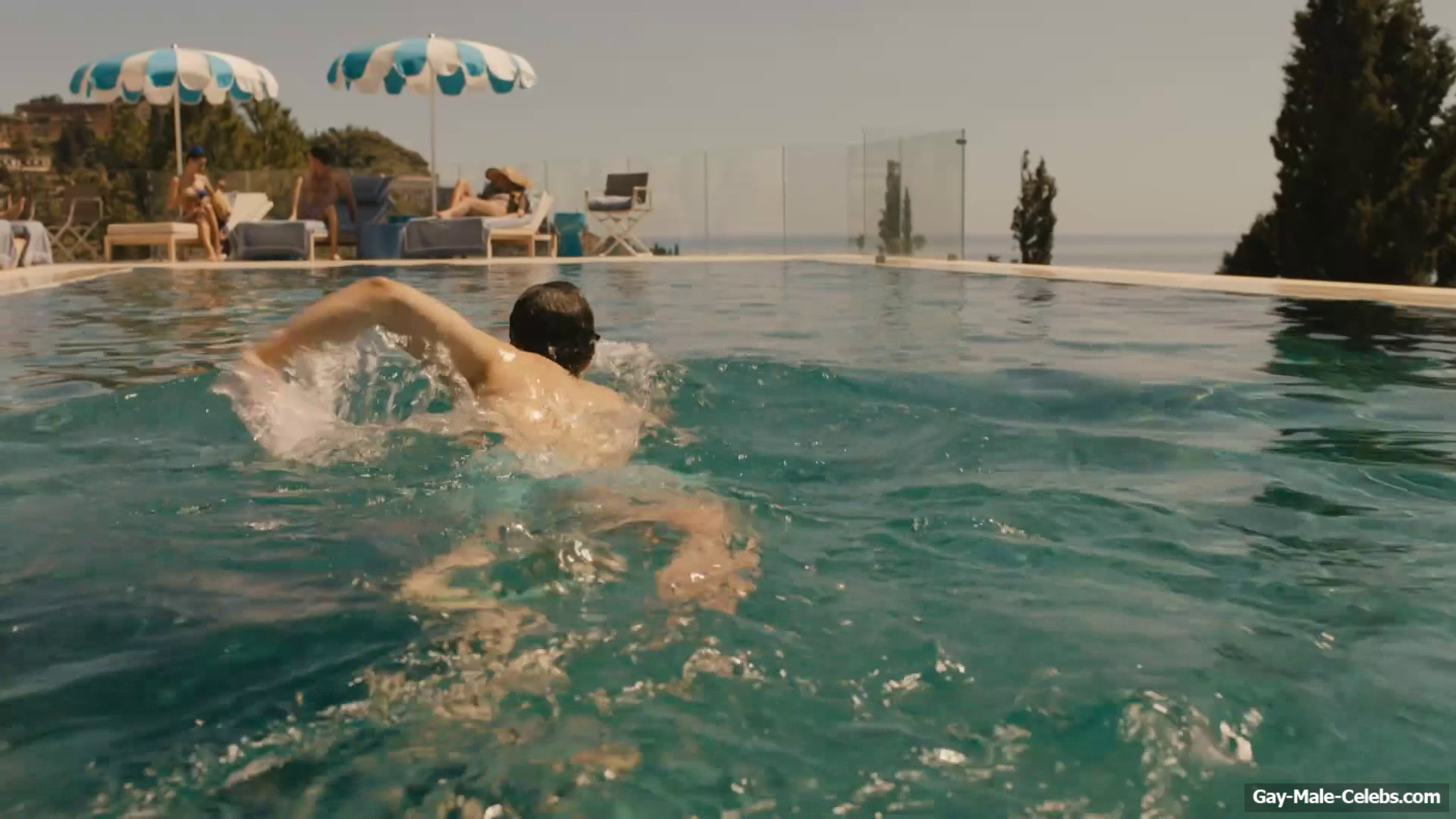 Adam DiMarco sets pulses racing in “The White Lotus”. This guy is relaxing by the pool wearing only turquoise swim trunks that clearly outline his butt. But what really catches our attention is his pumped-up muscular torso, which looks divine when he’s lying on a sun lounger.
