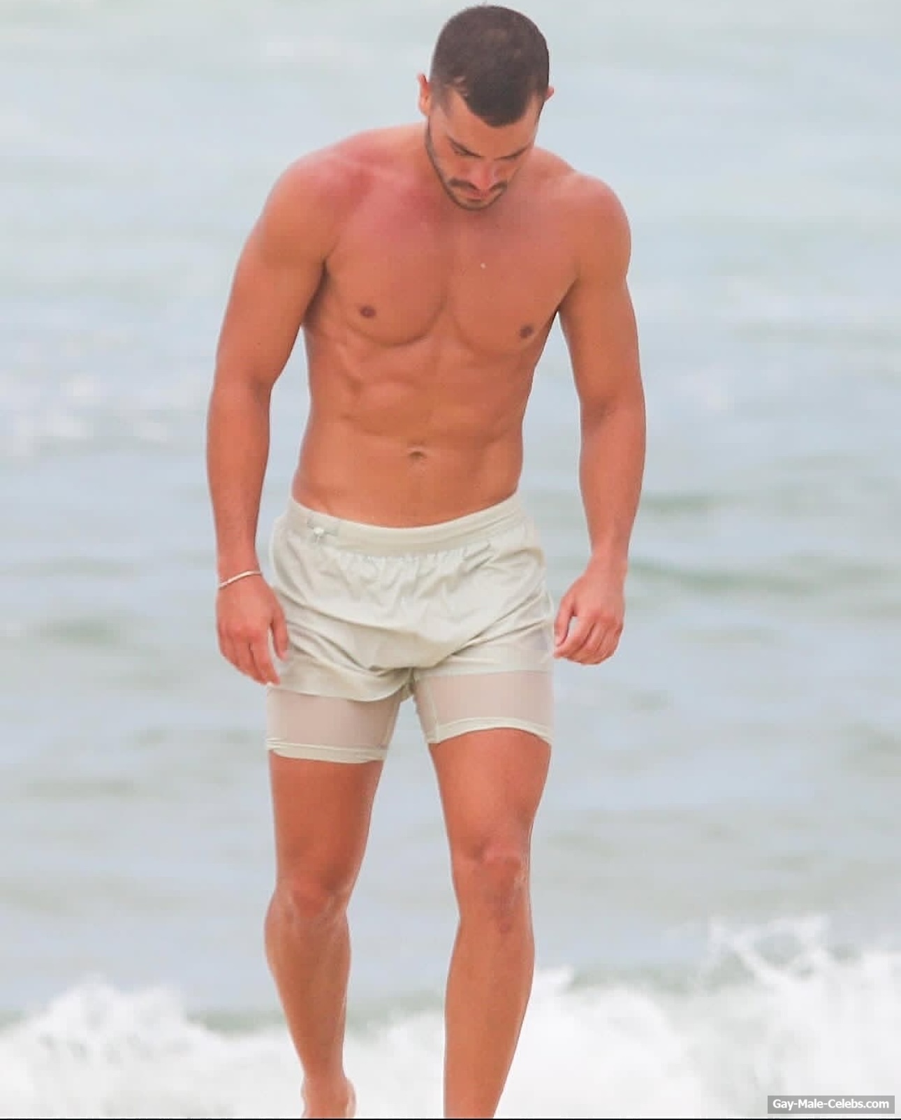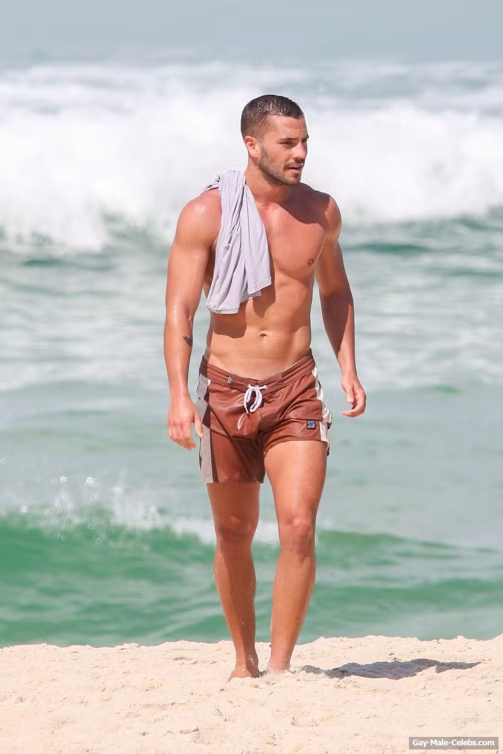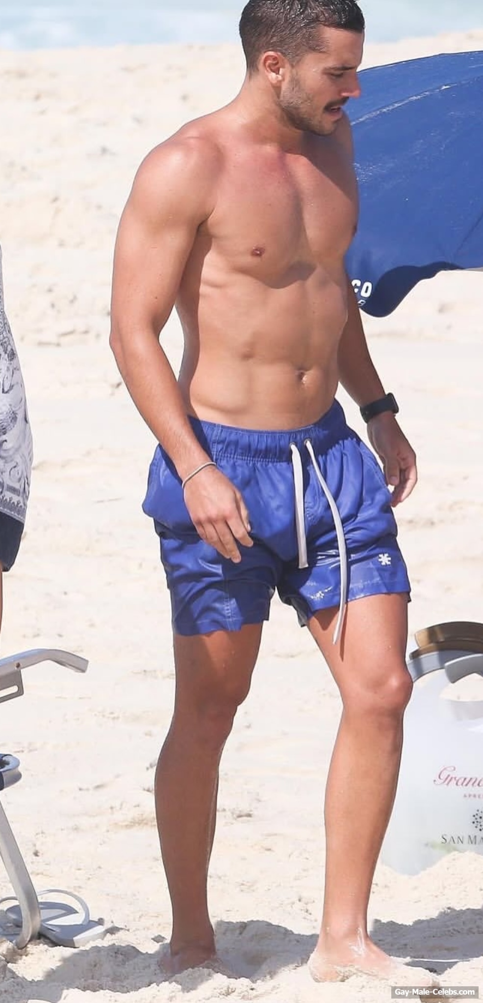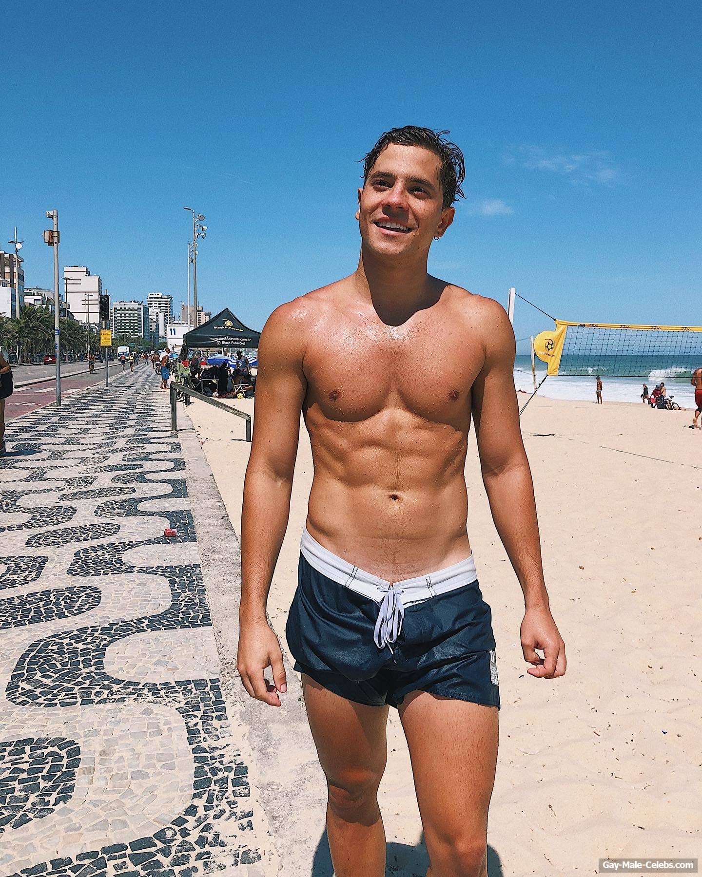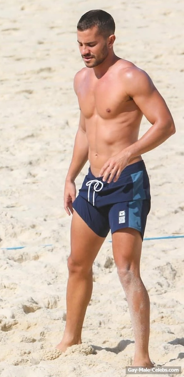 André Lamoglia has a sexy and muscular body and it is good that this hunk is not shy to show it. While he is relaxing on the beach, we can admire his naked torso. And even though his swim trunks are not very tight, his impressive bulge is visible through them.
