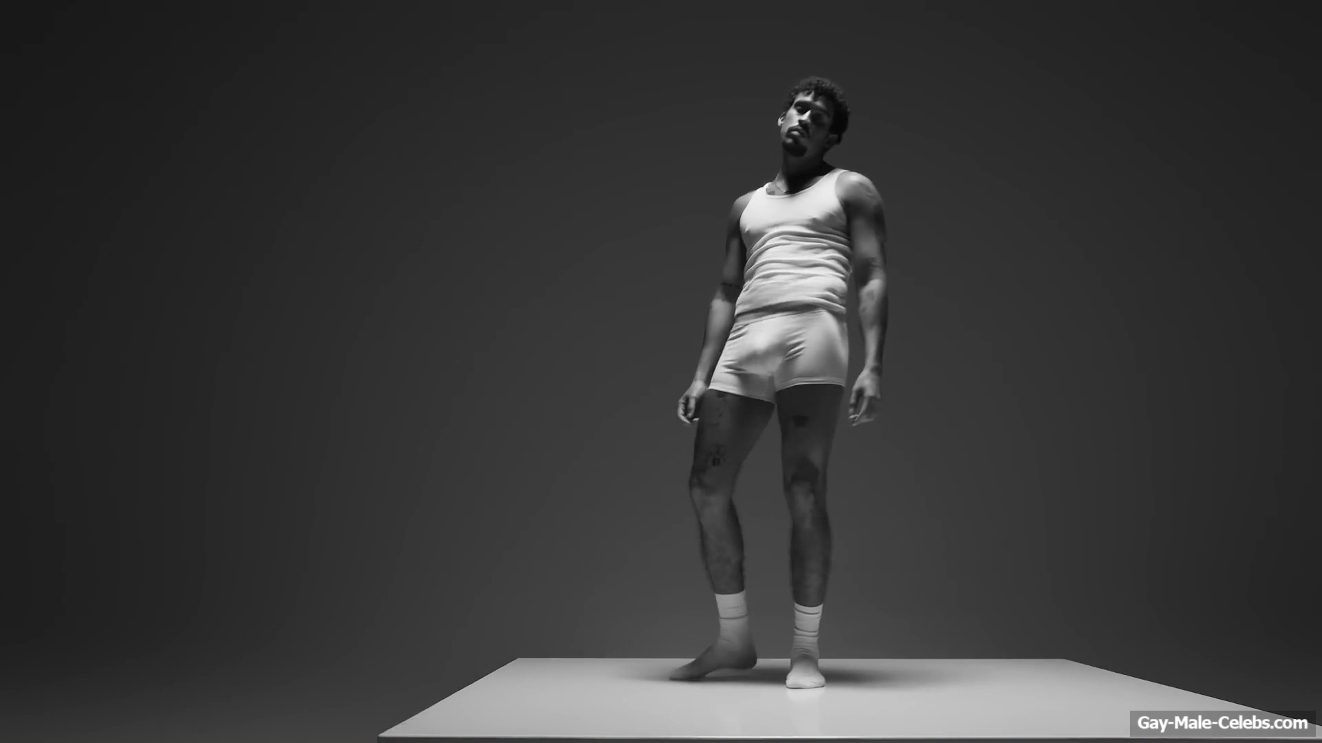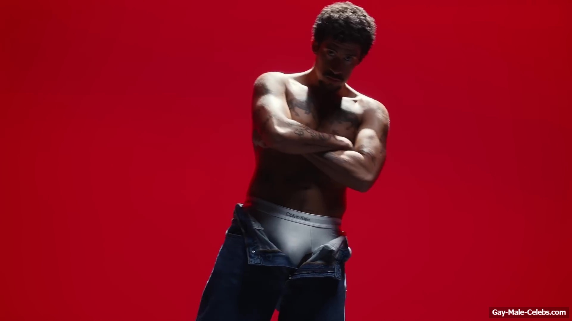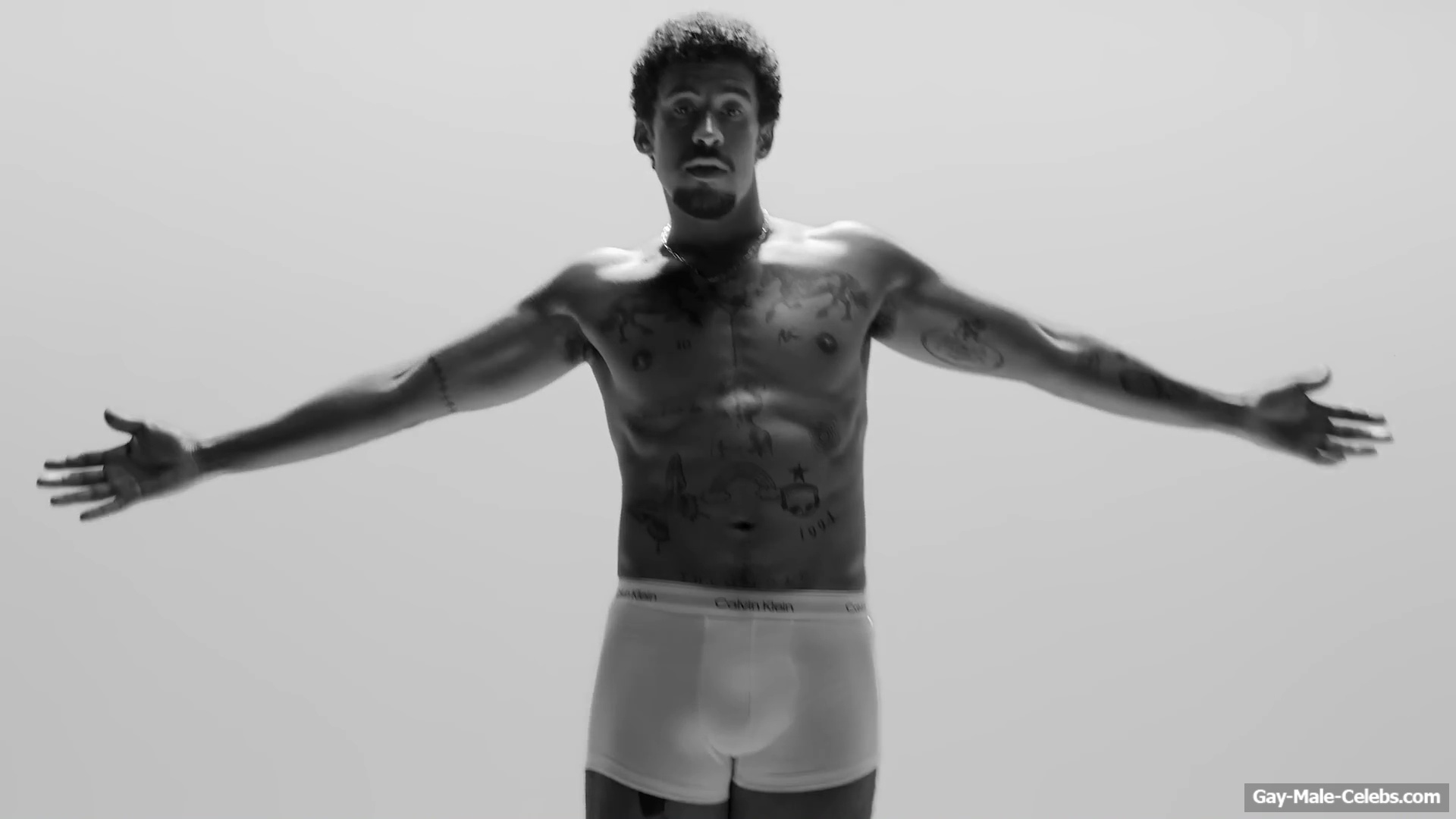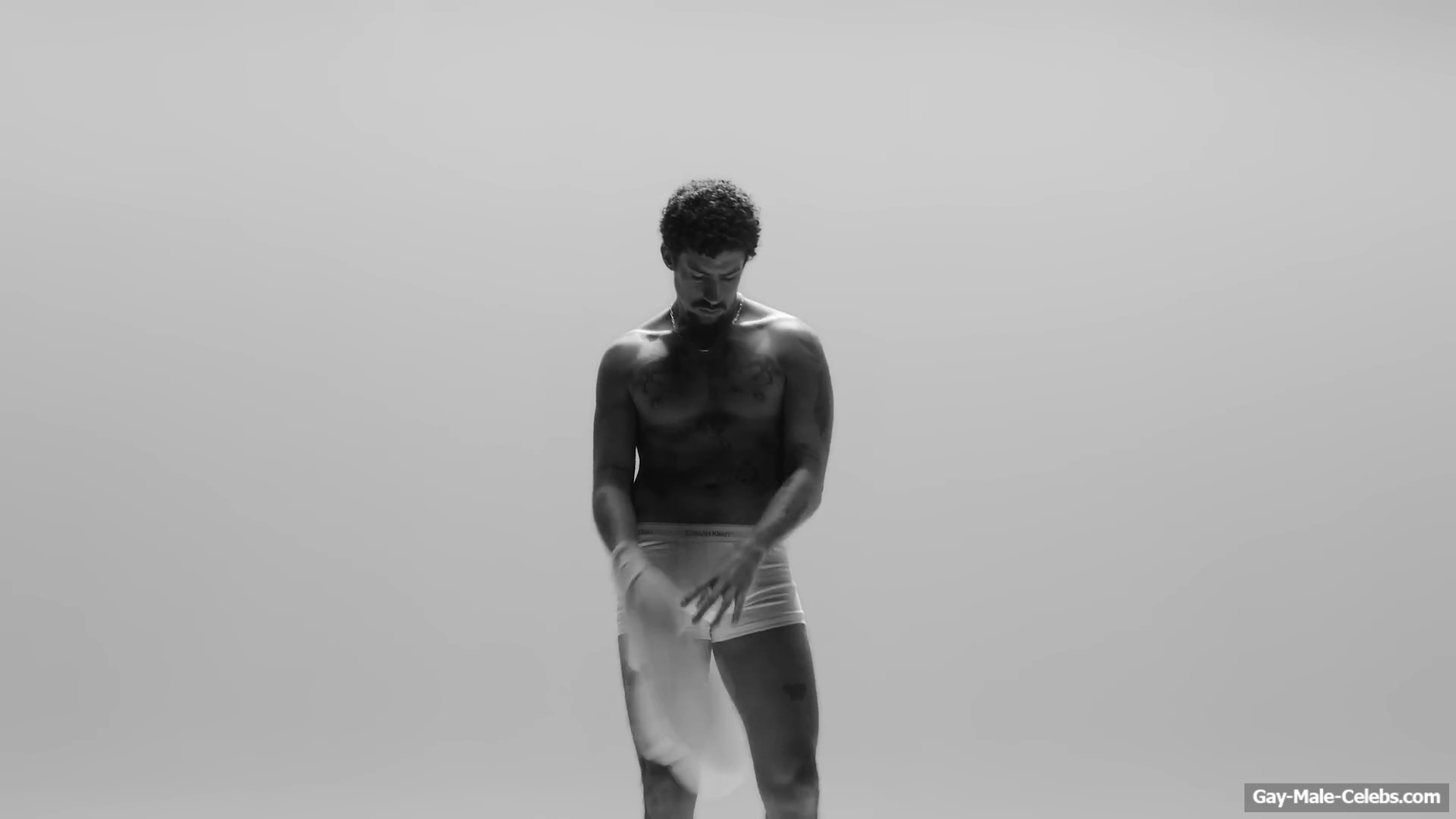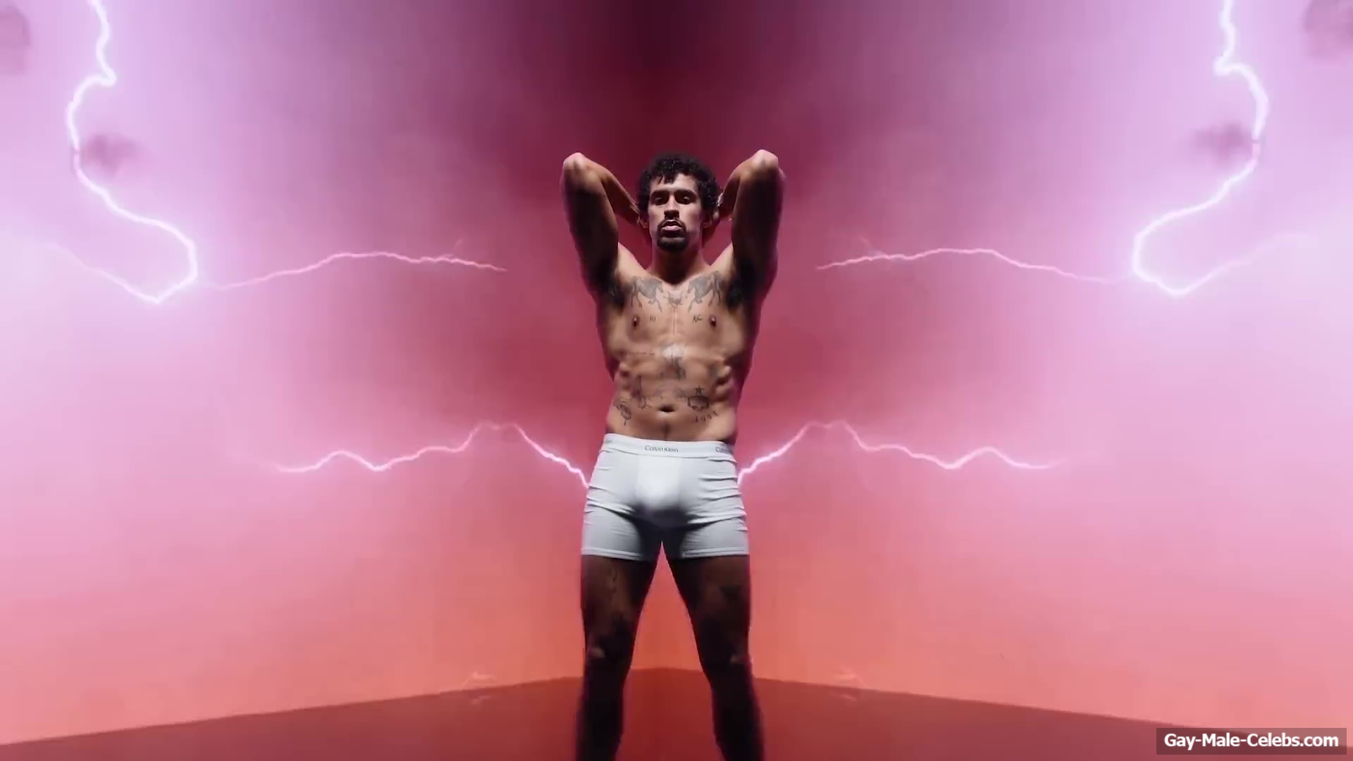 Calvin Klein knows exactly who to choose for their for underwear advertisements. This time Bad Bunny only in white boxers shows off his sexy body. Everything about this stud is perfect. Bad Bunny has a muscular torso. Moreover, we can admire his impressive bulge forever.