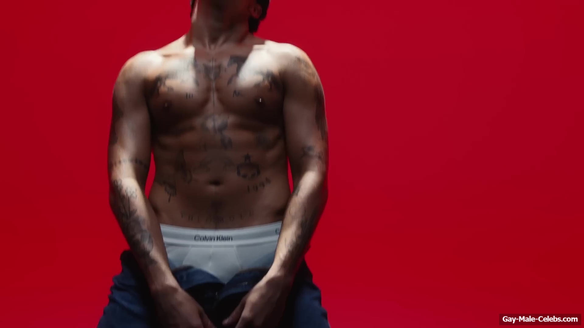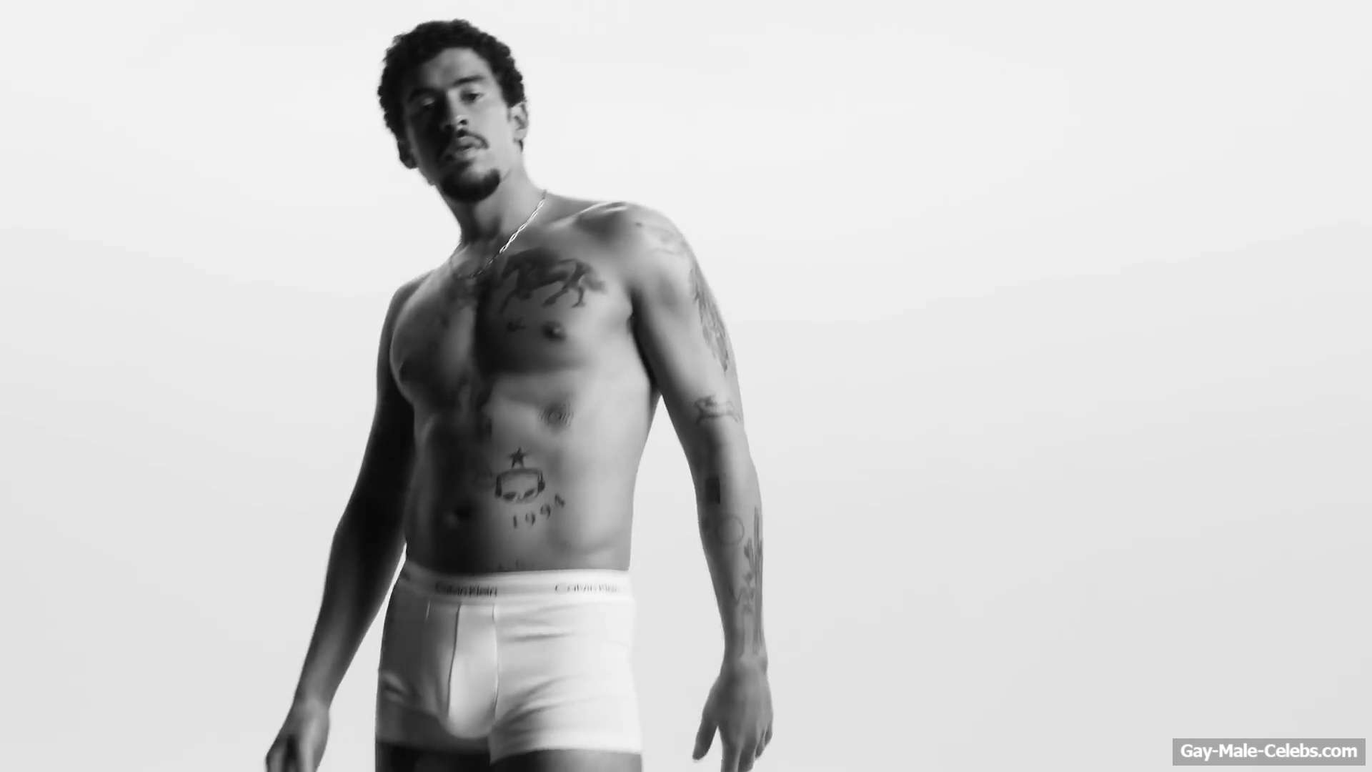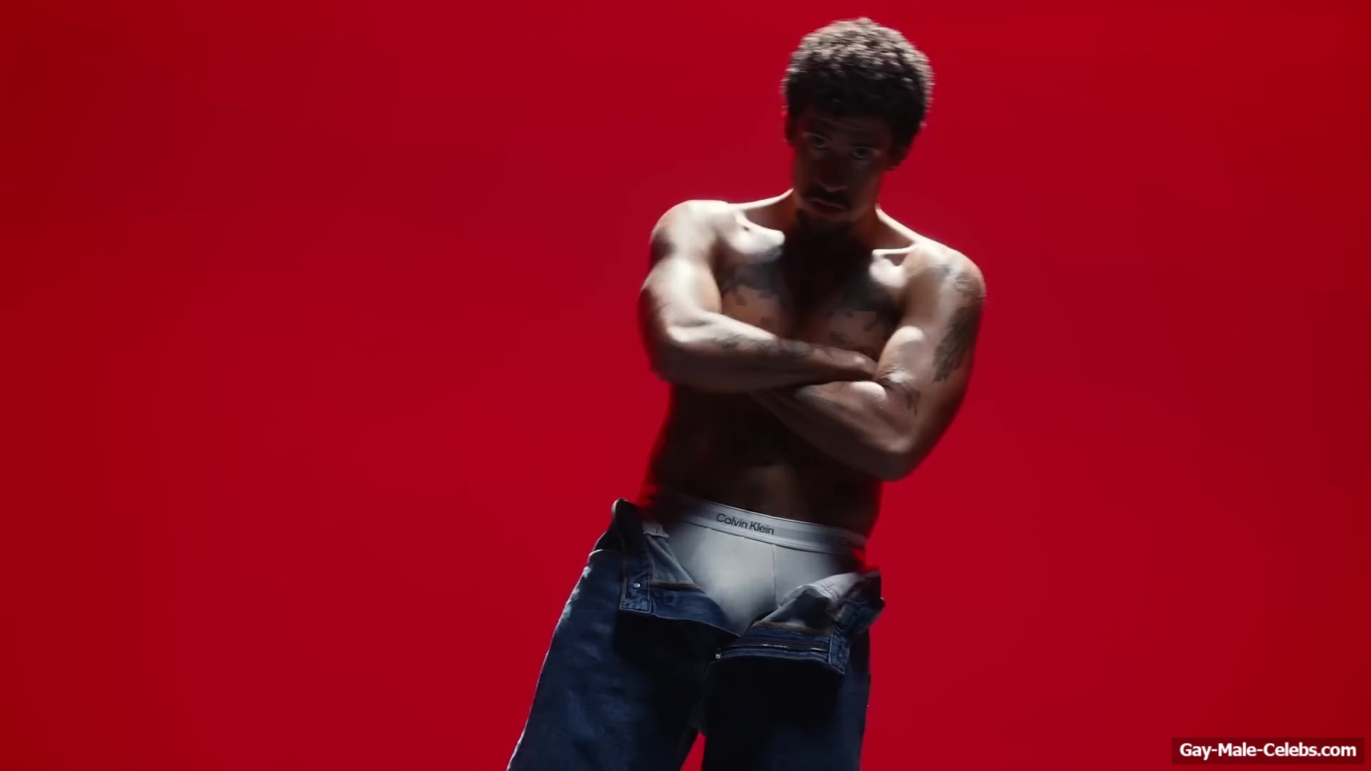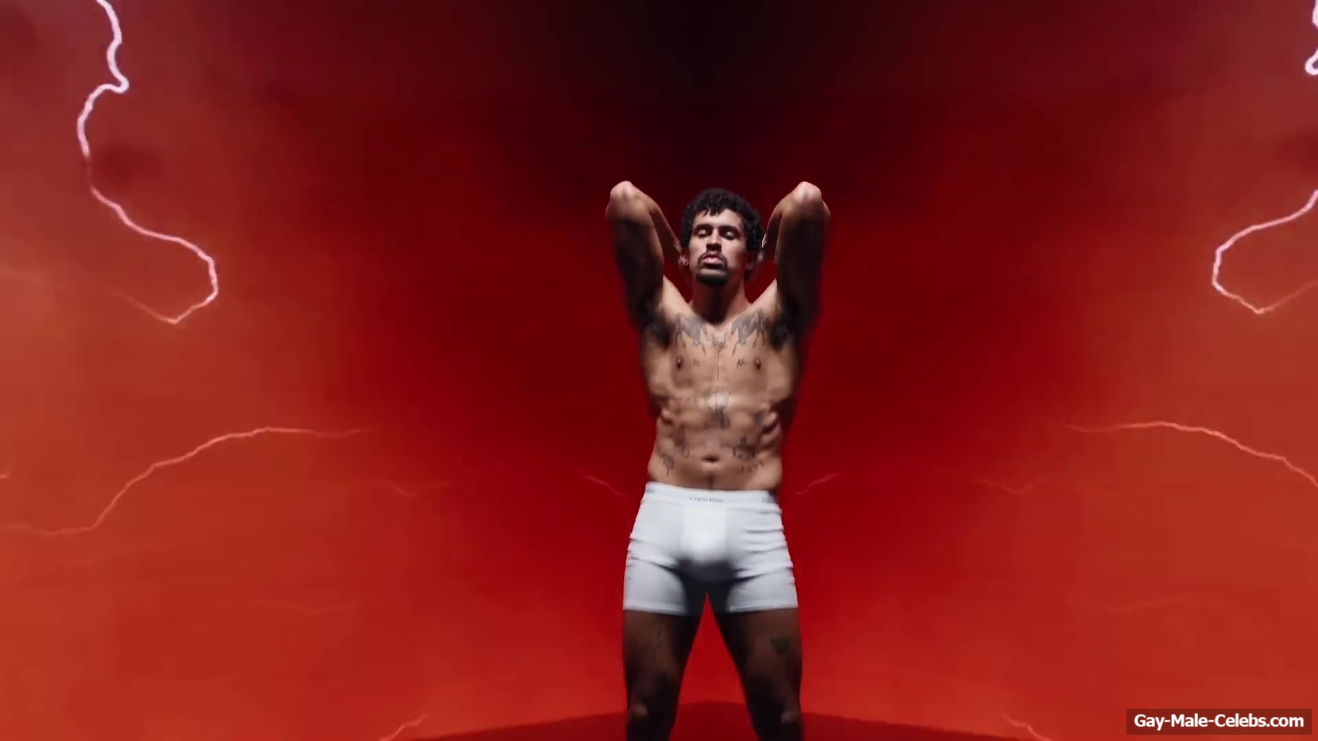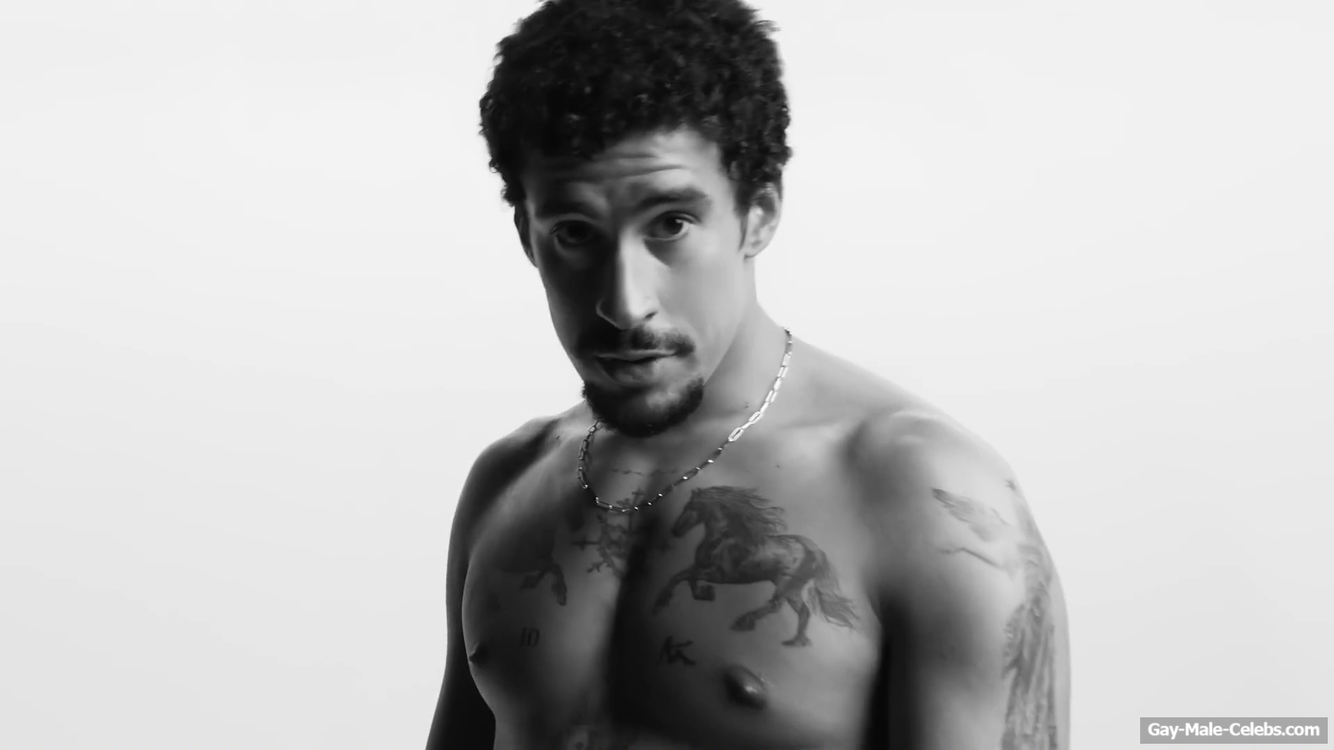 Calvin Klein knows exactly who to choose for their for underwear advertisements. This time Bad Bunny only in white boxers shows off his sexy body. Everything about this stud is perfect. Bad Bunny has a muscular torso. Moreover, we can admire his impressive bulge forever.