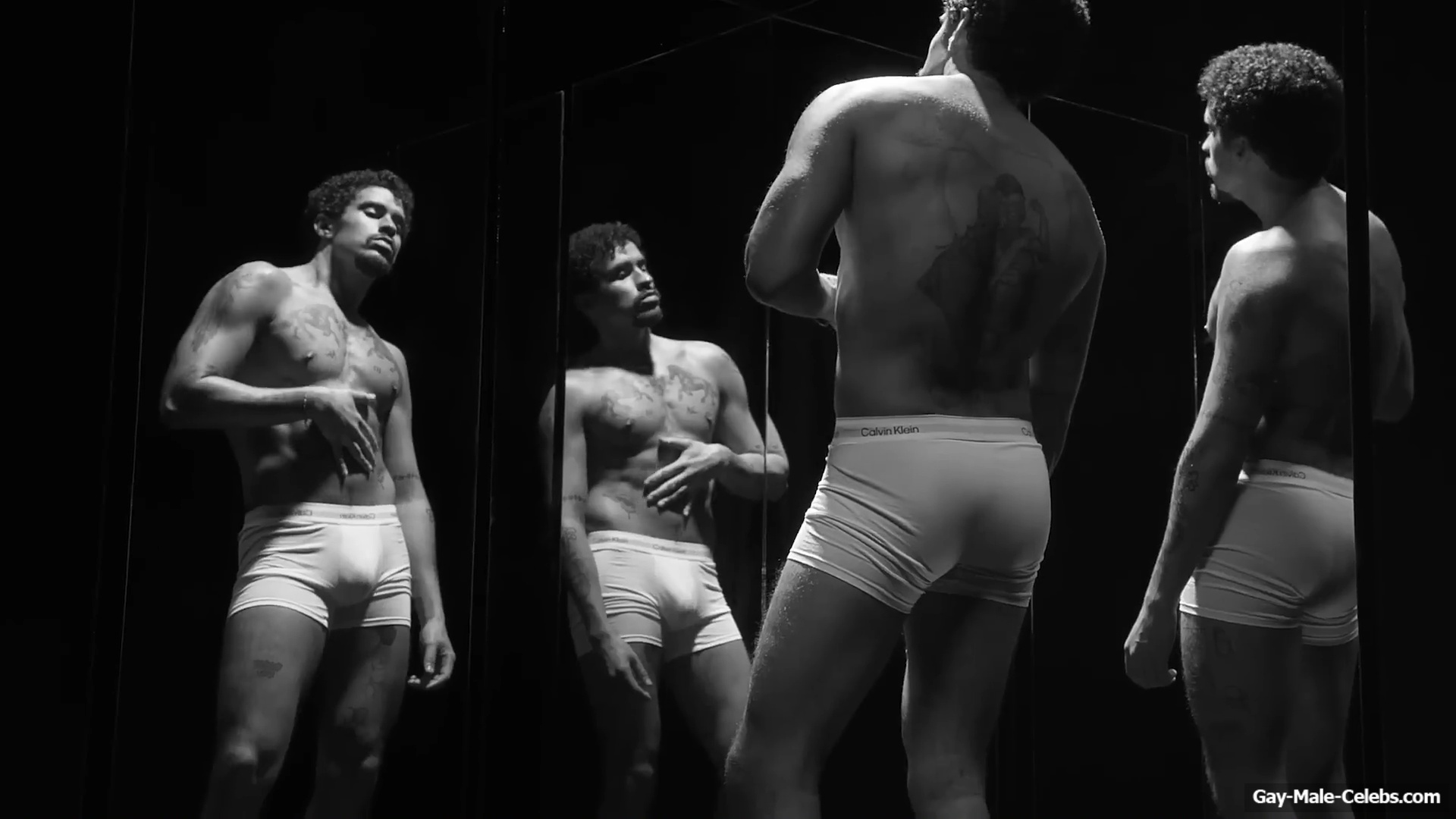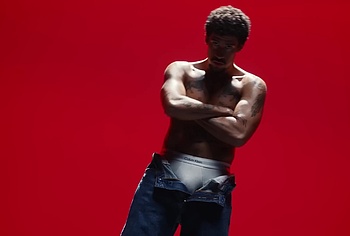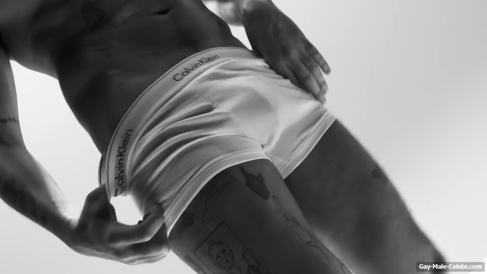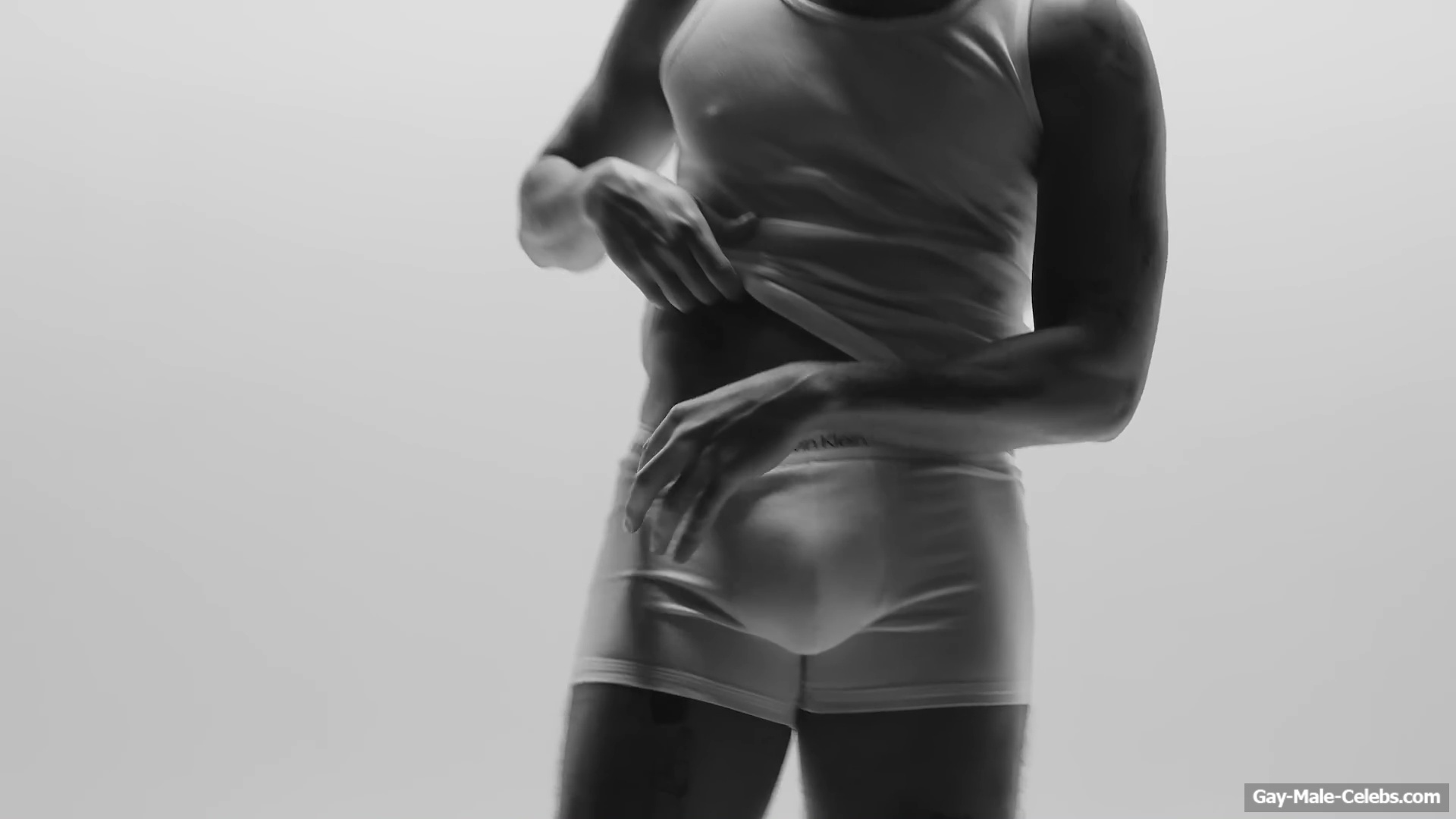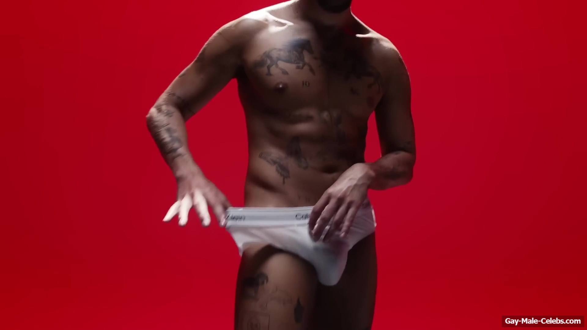 Calvin Klein knows exactly who to choose for their for underwear advertisements. This time Bad Bunny only in white boxers shows off his sexy body. Everything about this stud is perfect. Bad Bunny has a muscular torso. Moreover, we can admire his impressive bulge forever.