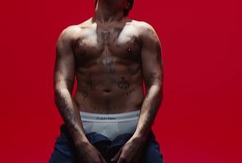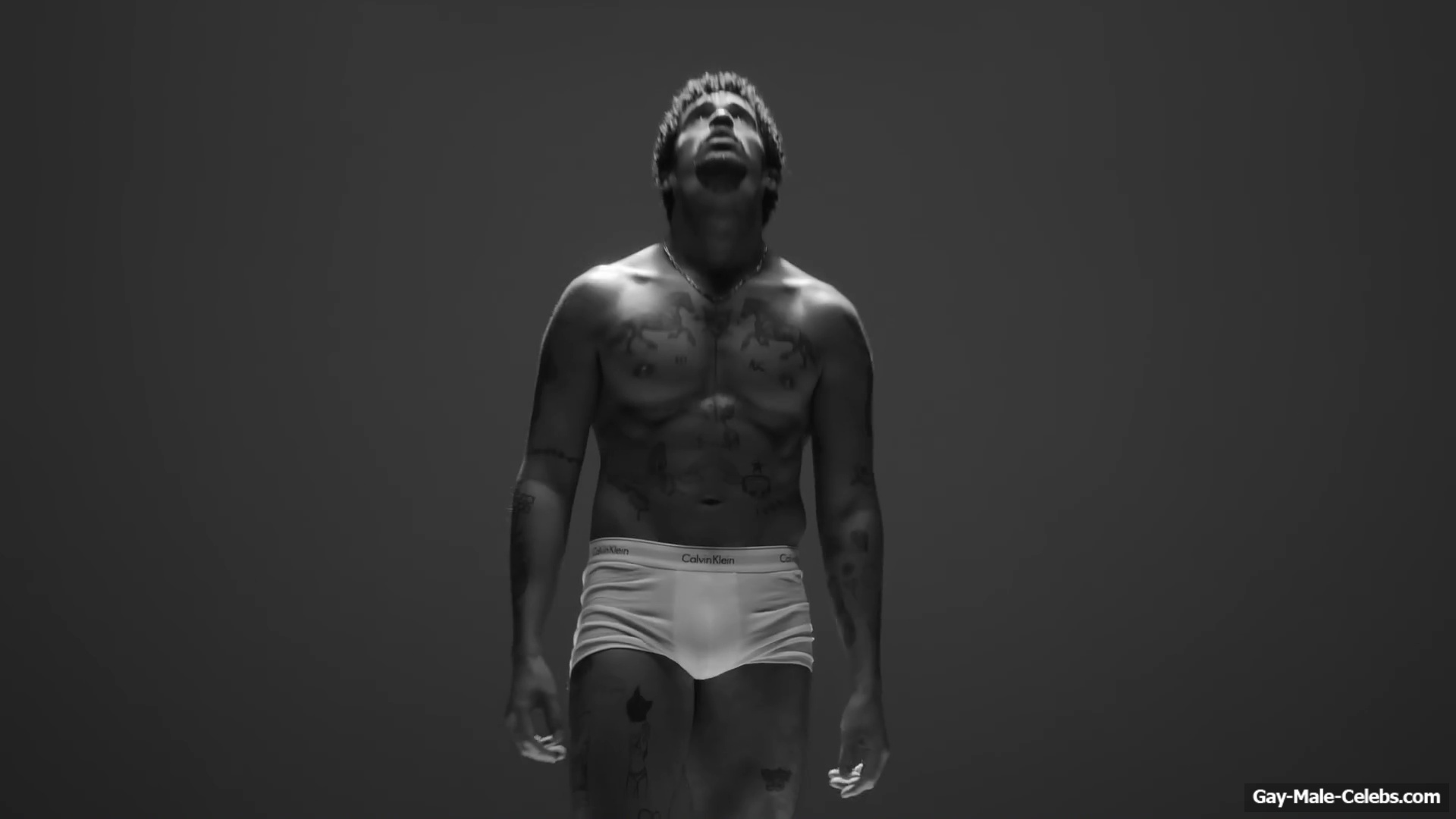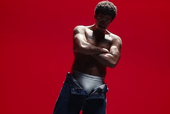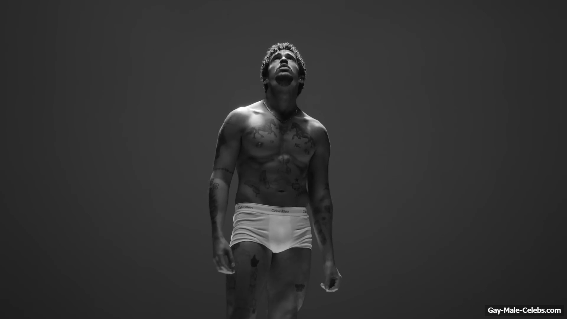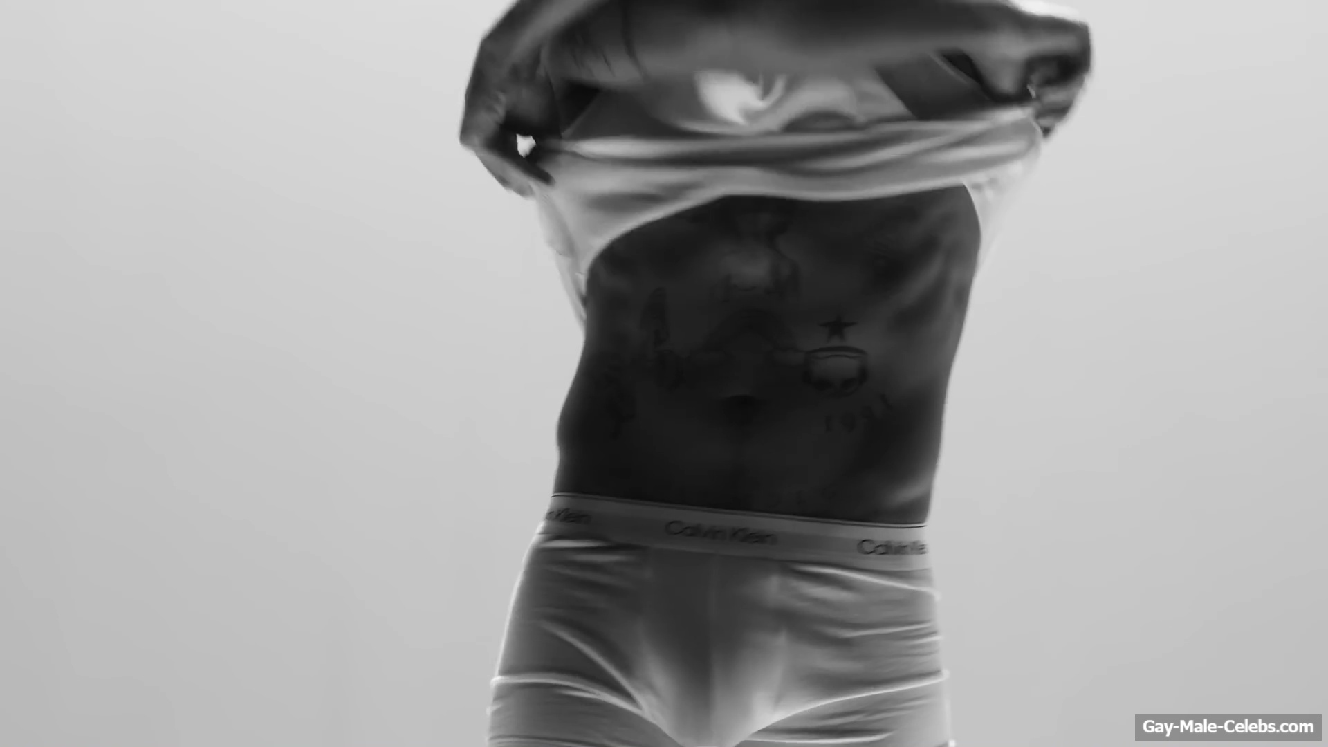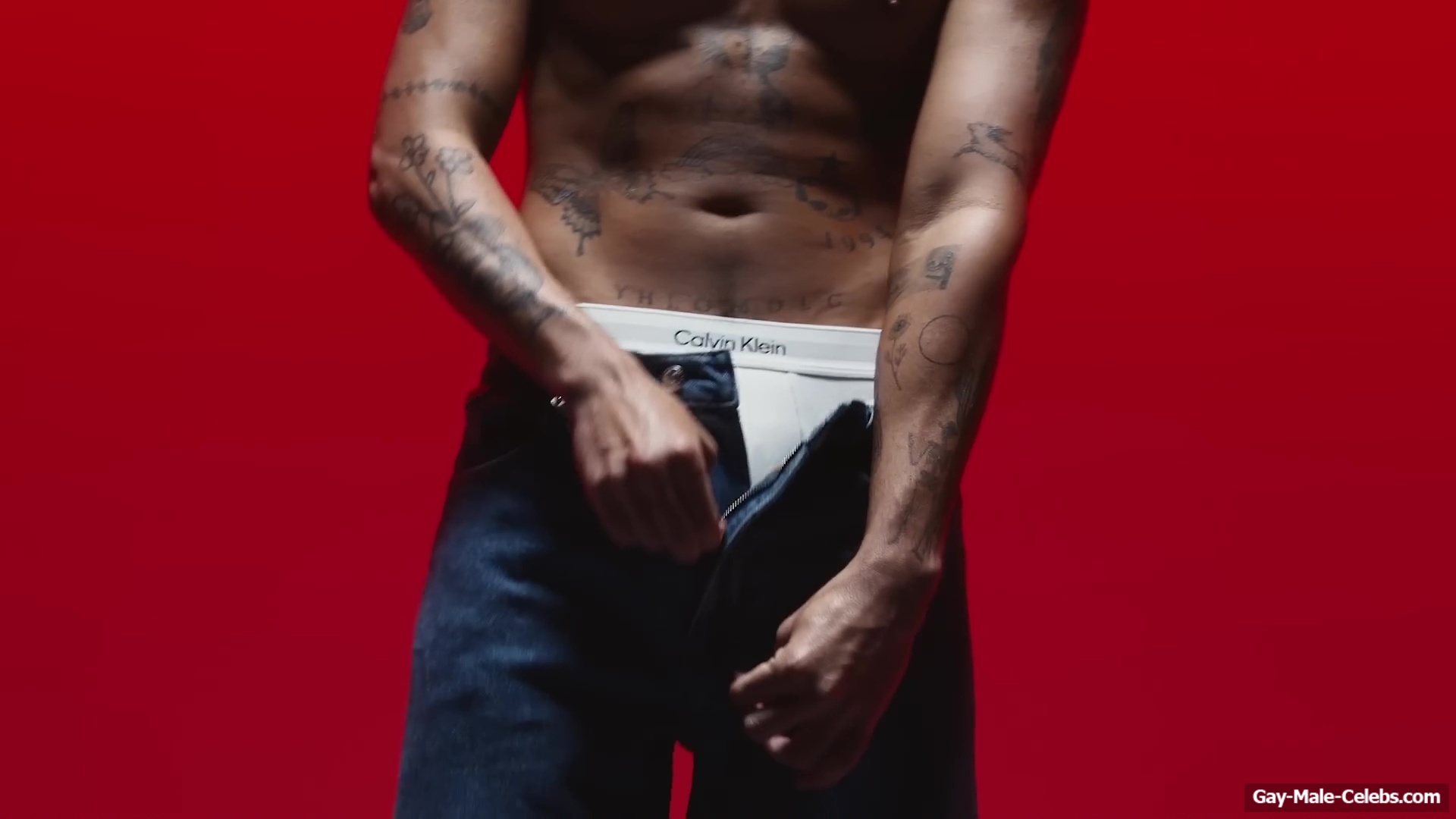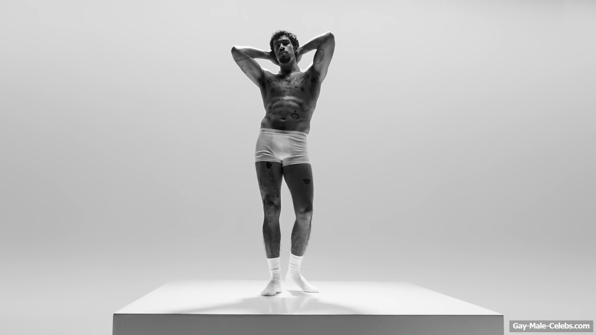 Calvin Klein knows exactly who to choose for their for underwear advertisements. This time Bad Bunny only in white boxers shows off his sexy body. Everything about this stud is perfect. Bad Bunny has a muscular torso. Moreover, we can admire his impressive bulge forever.