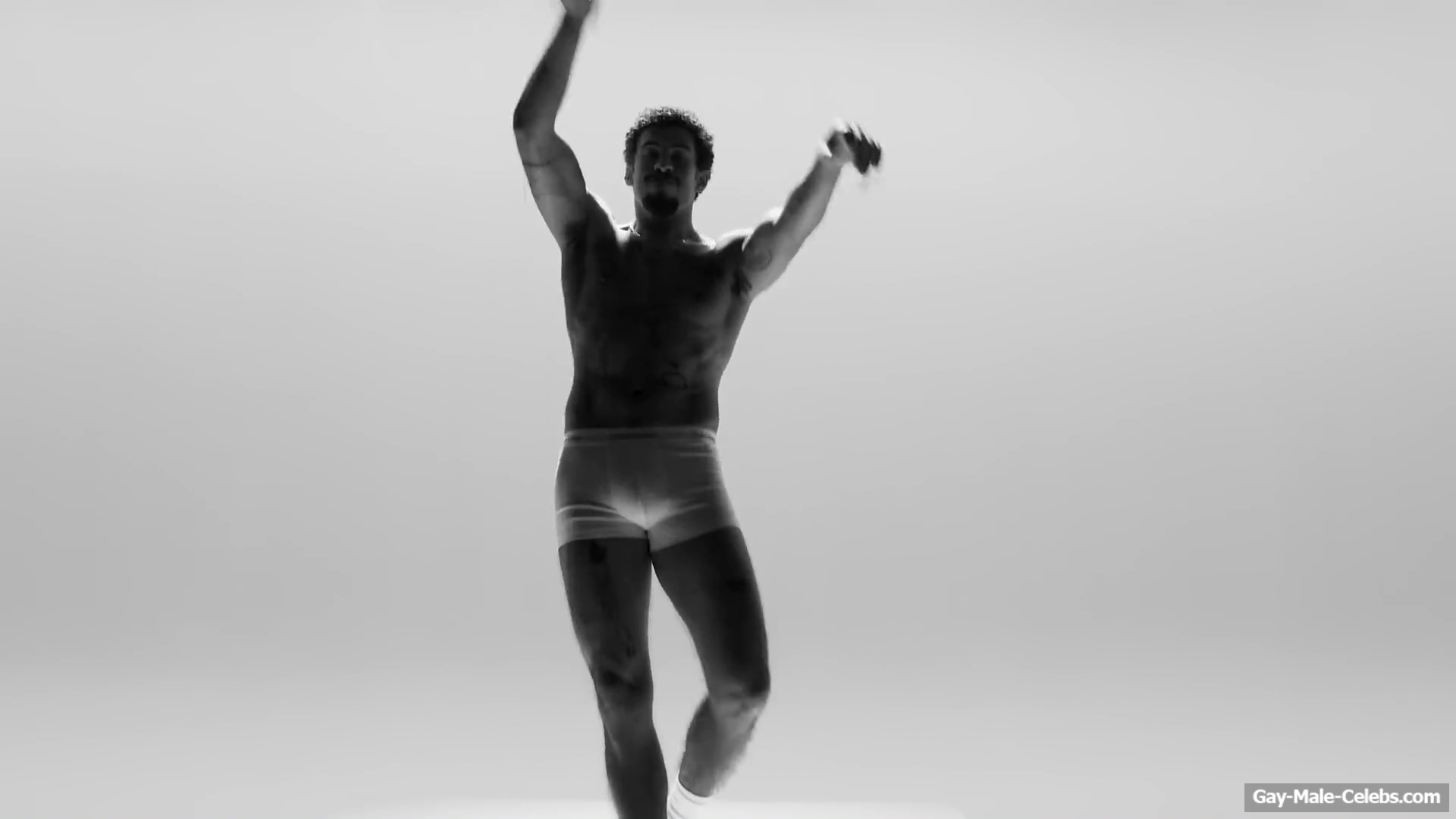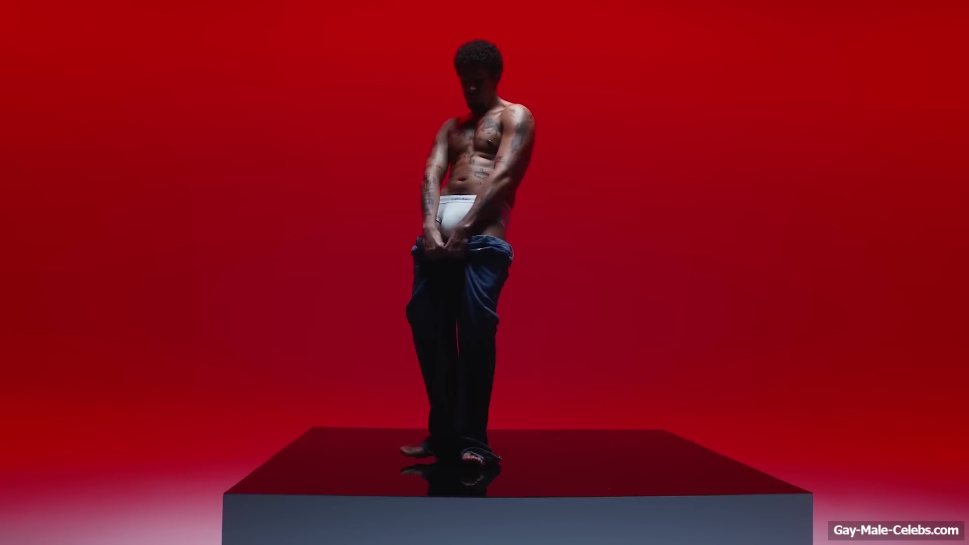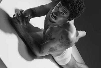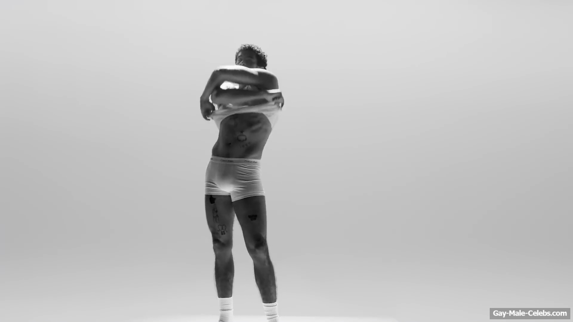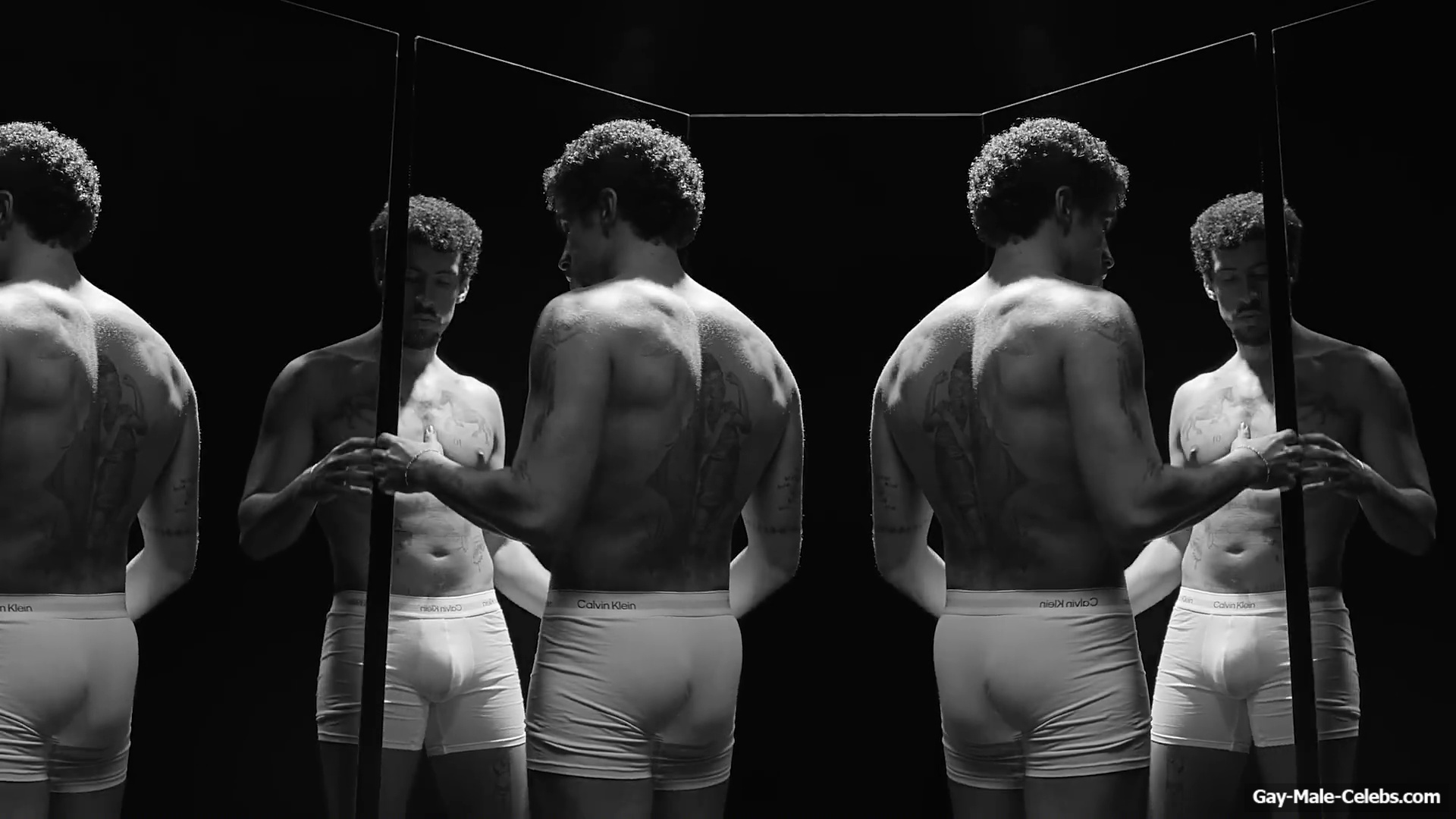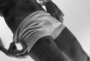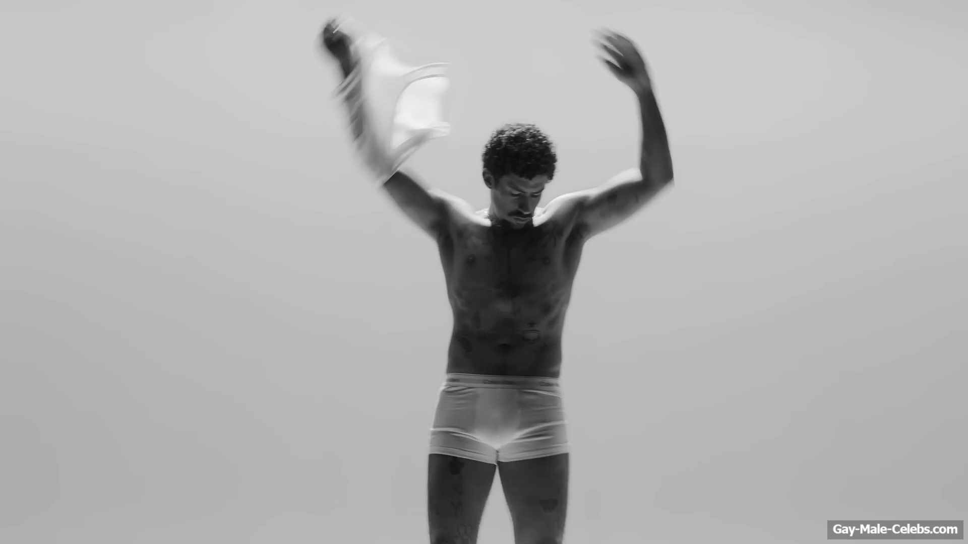Calvin Klein knows exactly who to choose for their for underwear advertisements. This time Bad Bunny only in white boxers shows off his sexy body. Everything about this stud is perfect. Bad Bunny has a muscular torso. Moreover, we can admire his impressive bulge forever.
