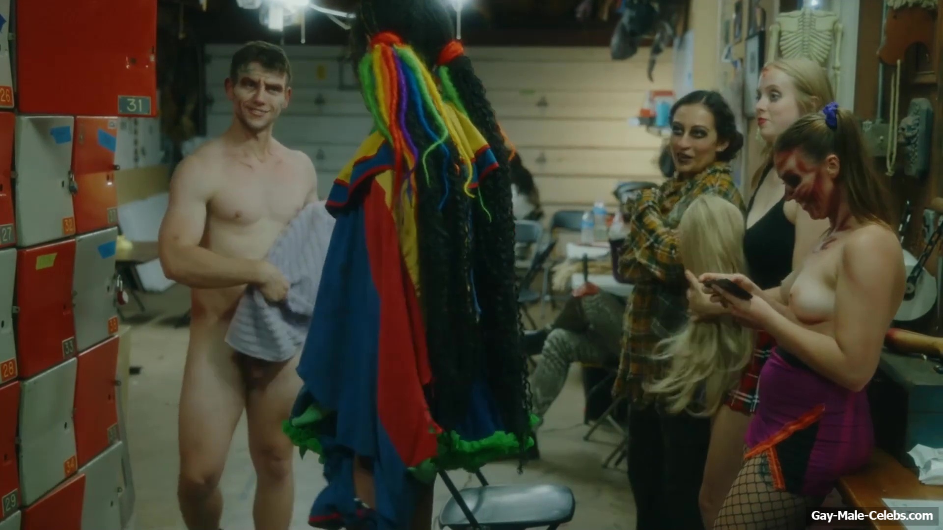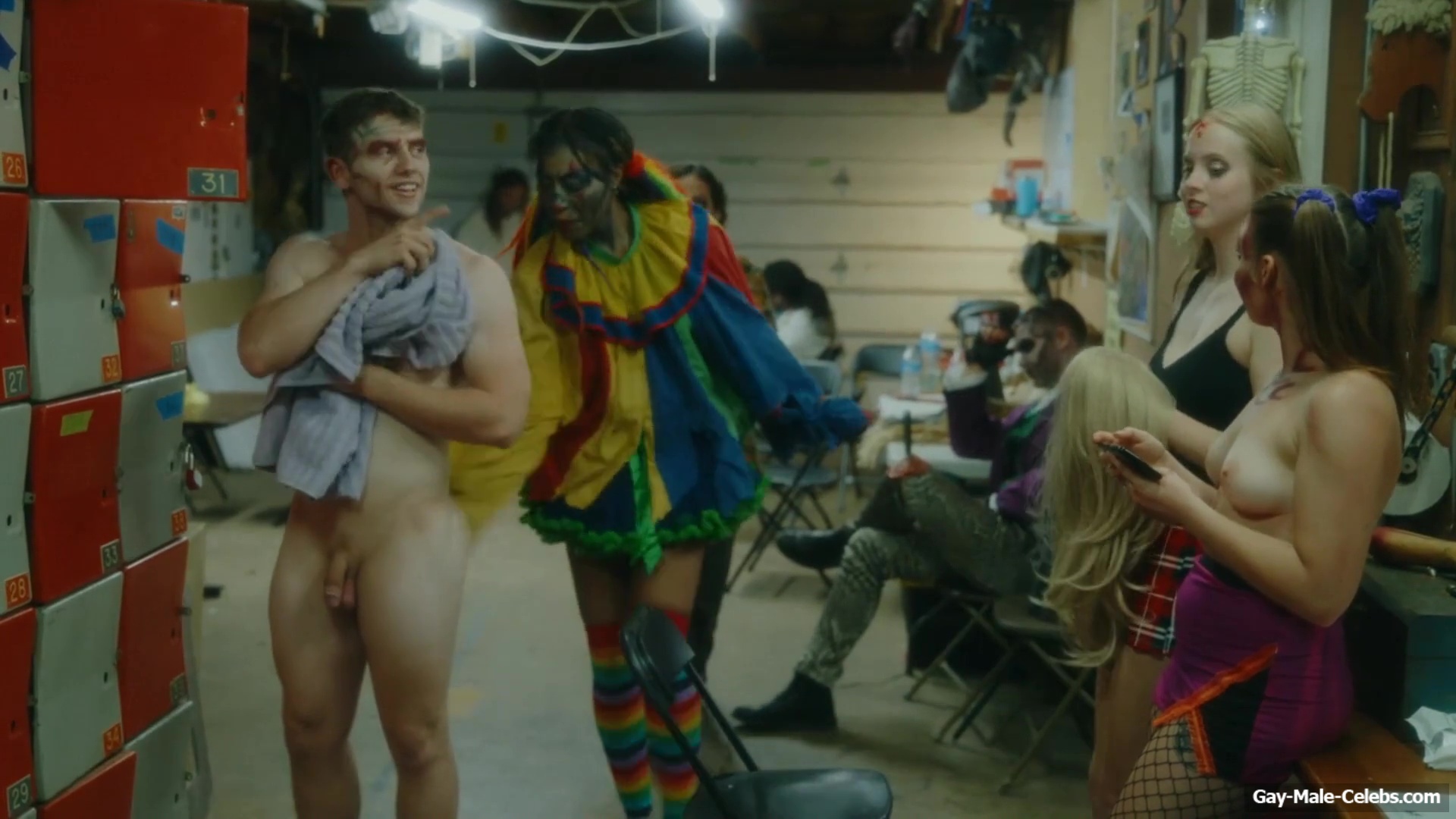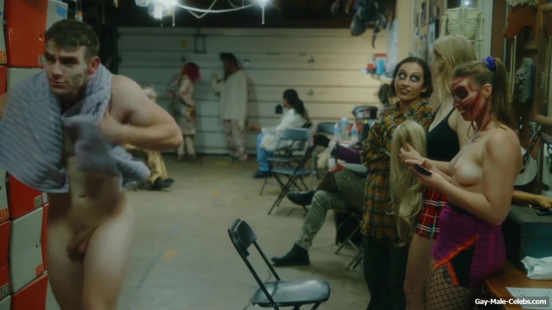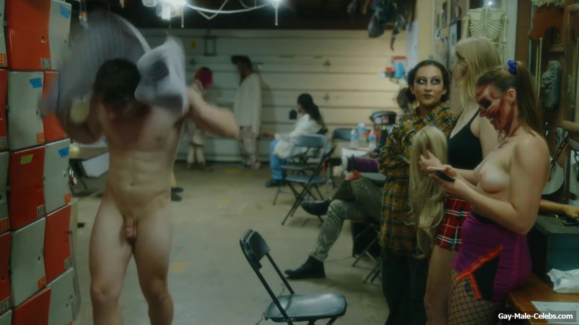 Brent Bentley flashes his cock in “Haunt Season”. The guy came to the dressing room after a shower, and he wasn’t embarrassed to walk around there completely naked and for good reason as Brent has a lot to show. The guy has a hot pumped up body and his dick and huge balls need special attention.