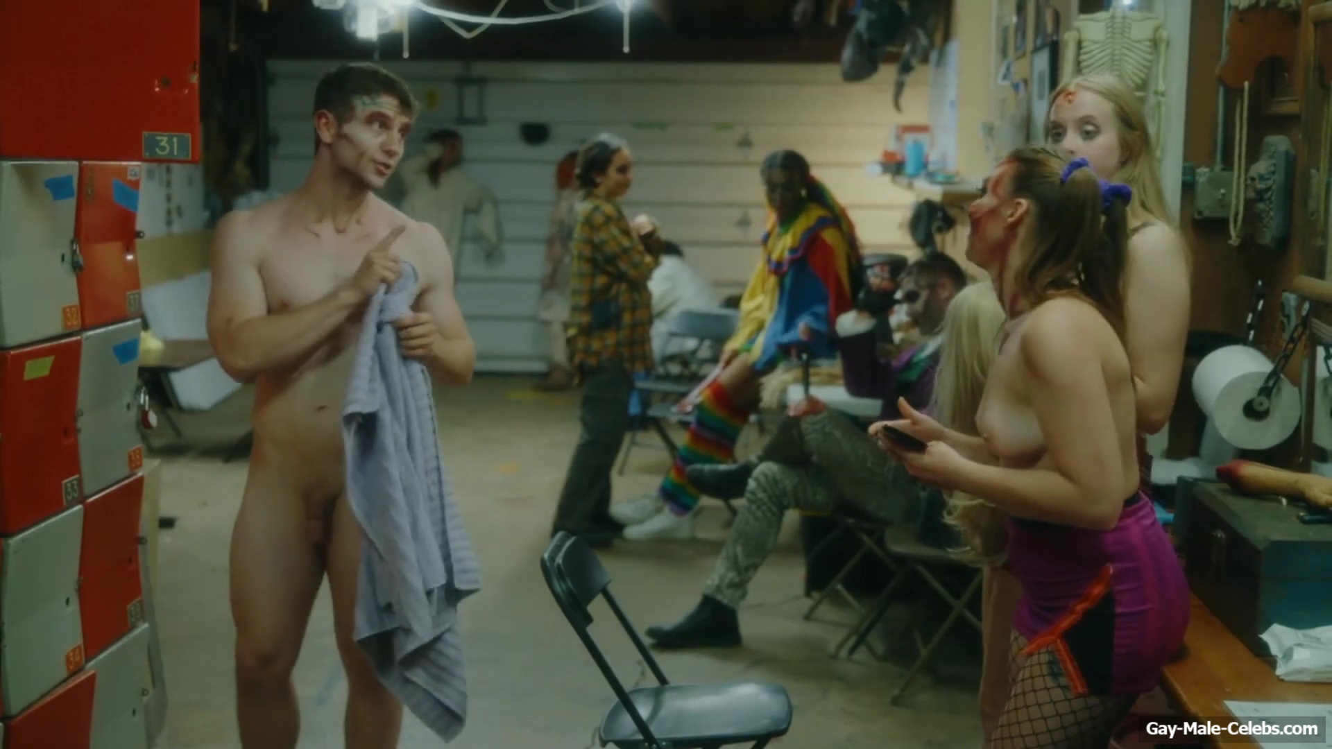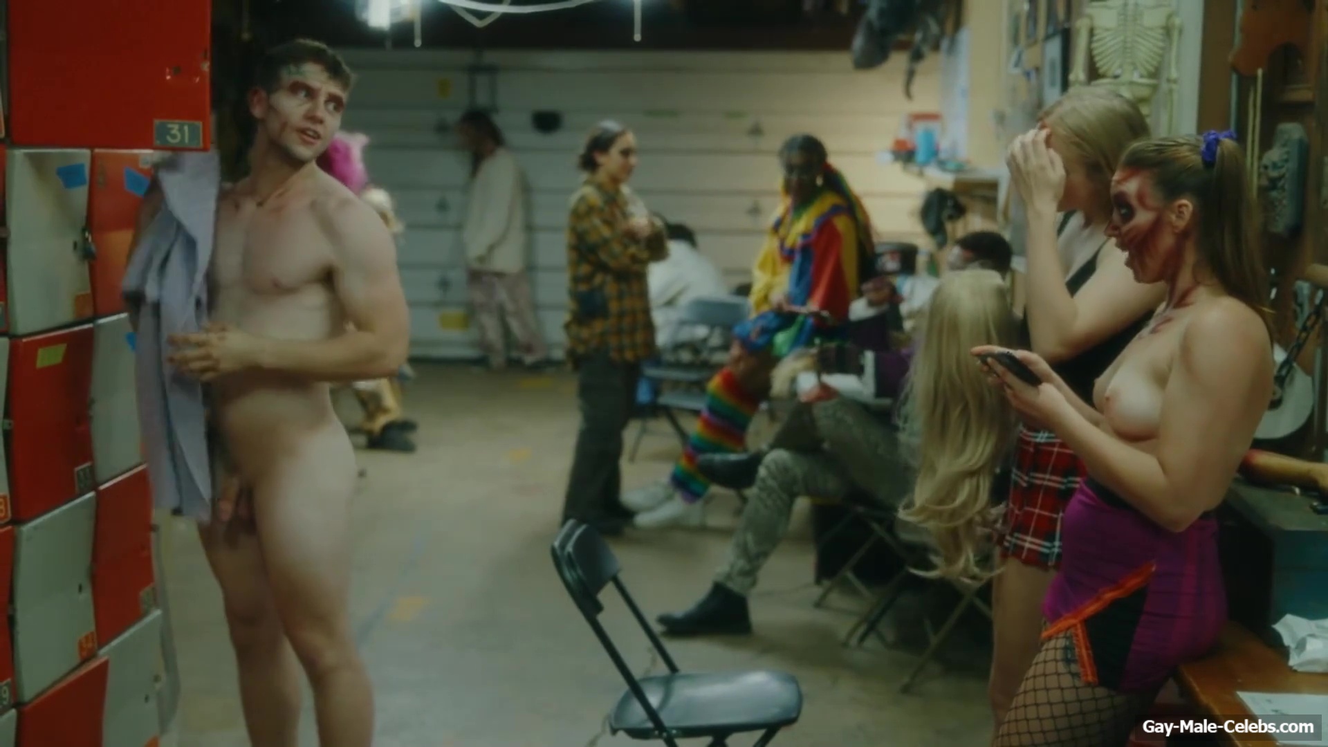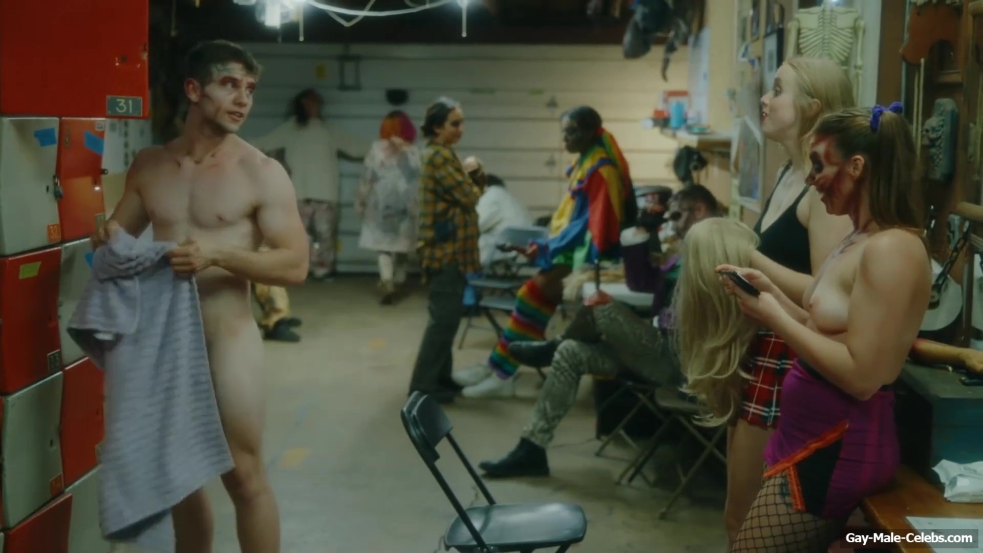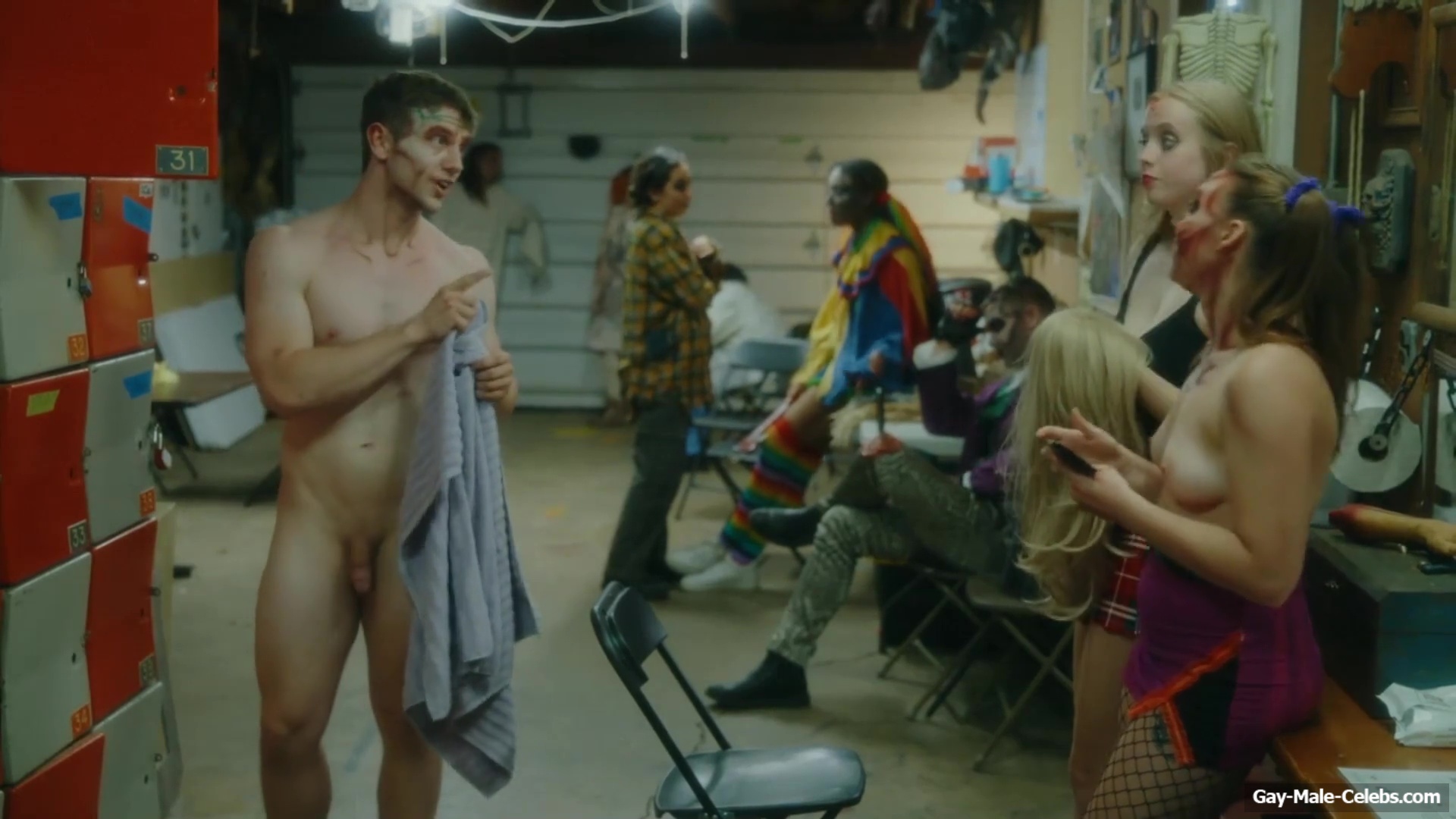 Brent Bentley flashes his cock in “Haunt Season”. The guy came to the dressing room after a shower, and he wasn’t embarrassed to walk around there completely naked and for good reason as Brent has a lot to show. The guy has a hot pumped up body and his dick and huge balls need special attention.
