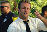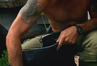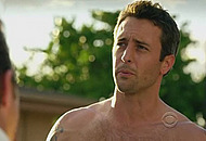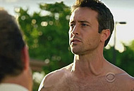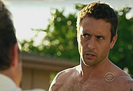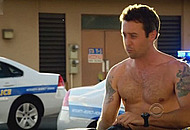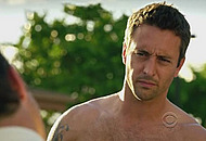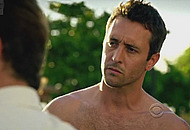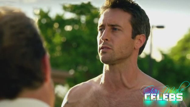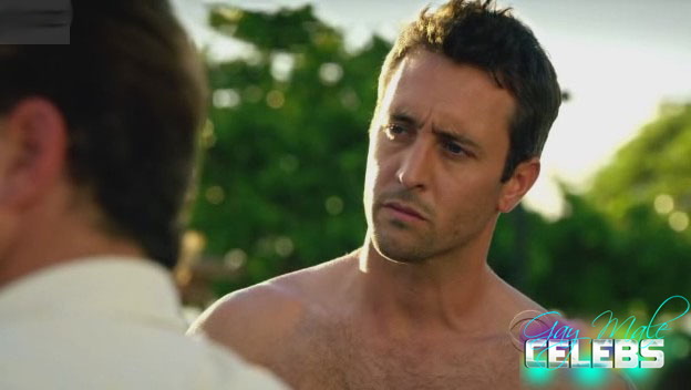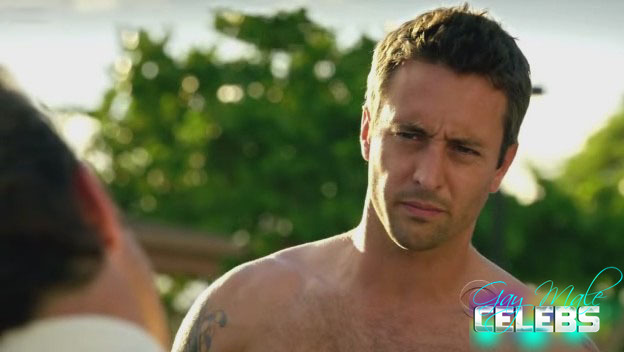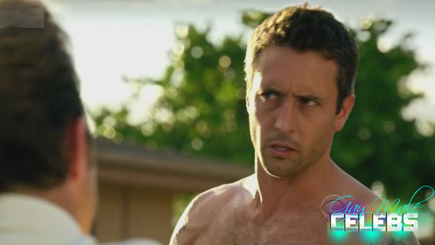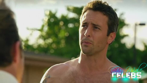 In “Hawaii Five” Alex Oloughlin removes his shirt and stands there in the sun shirtless and flexes with his hot muscles and gorgeous physique. Alex is one handsome dude and we have to see that when he equips his gear on his back and runs away like a macho. In the next scene, he dives out of the water all wet and climbs up on the ship.