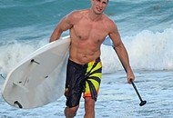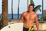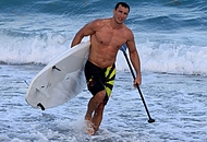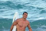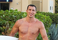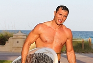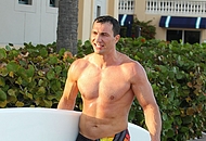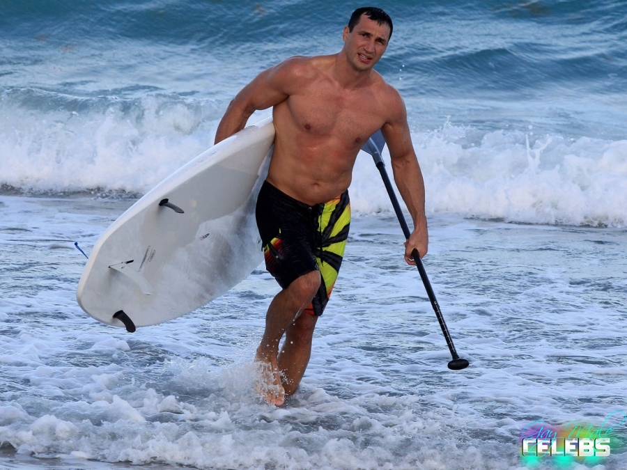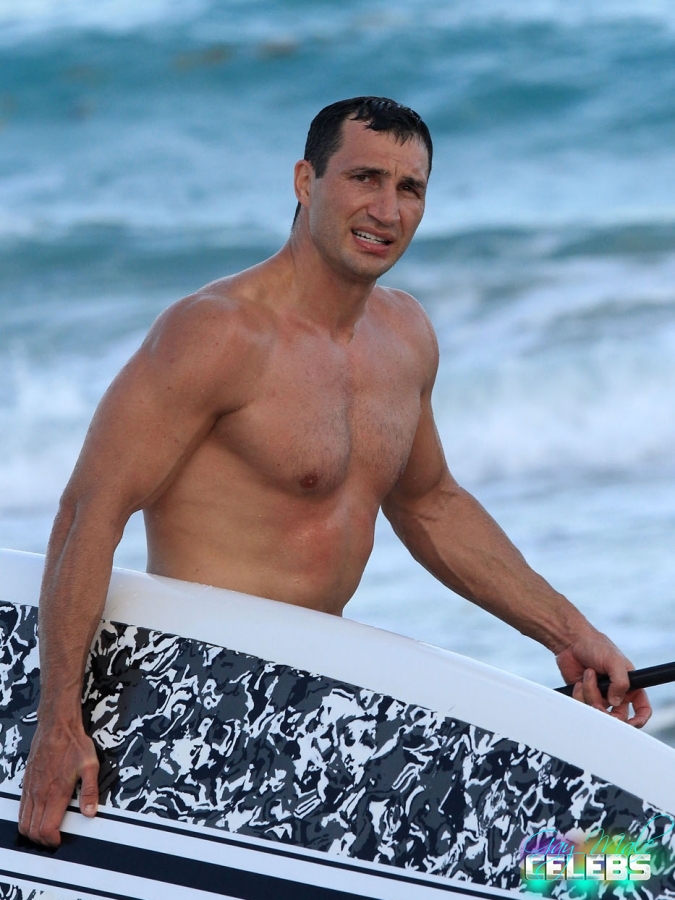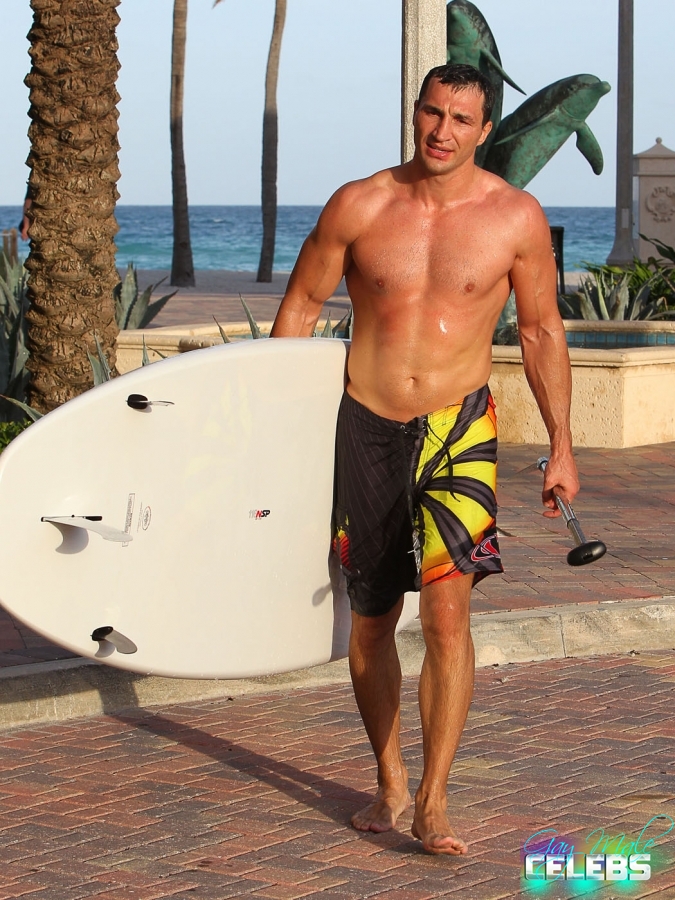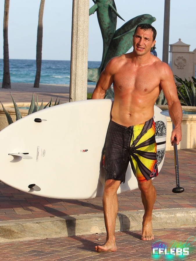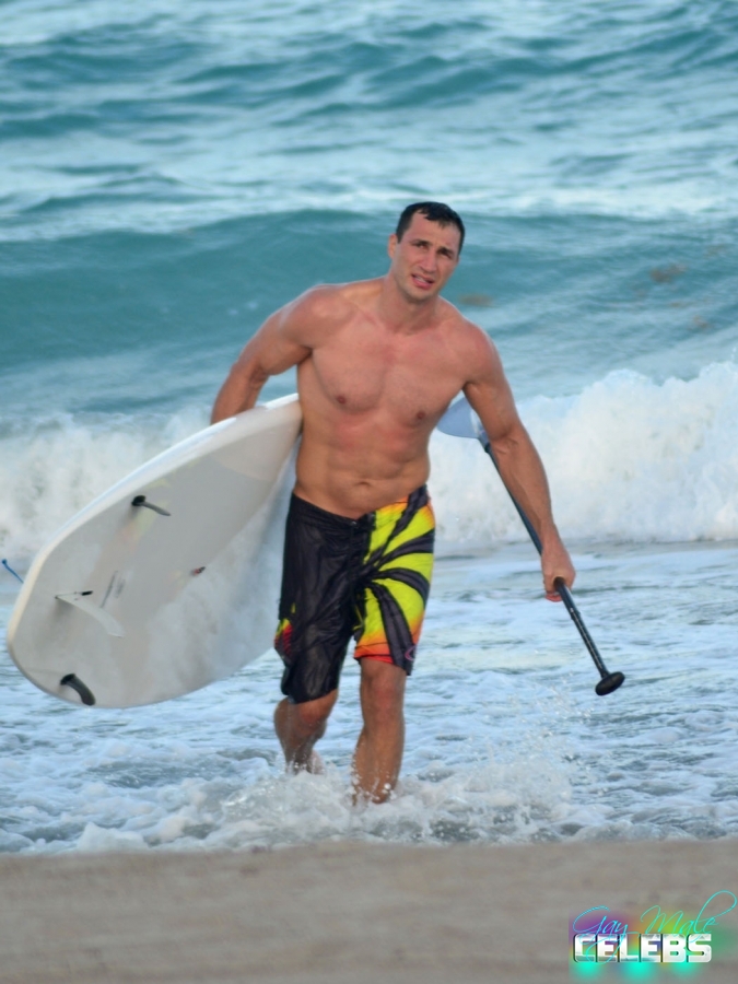 The Ukrainian boxer and heavyweight champion, Wladimir Klitschko is enjoying his days off in Miami on the beach surfing. On these pictures, you can see how hot he really is and how a good looking dude he is without the bruises. His body just simply shines in the Florida sun and we are glad that we have a macho man like him on our website to tickle our imagination.