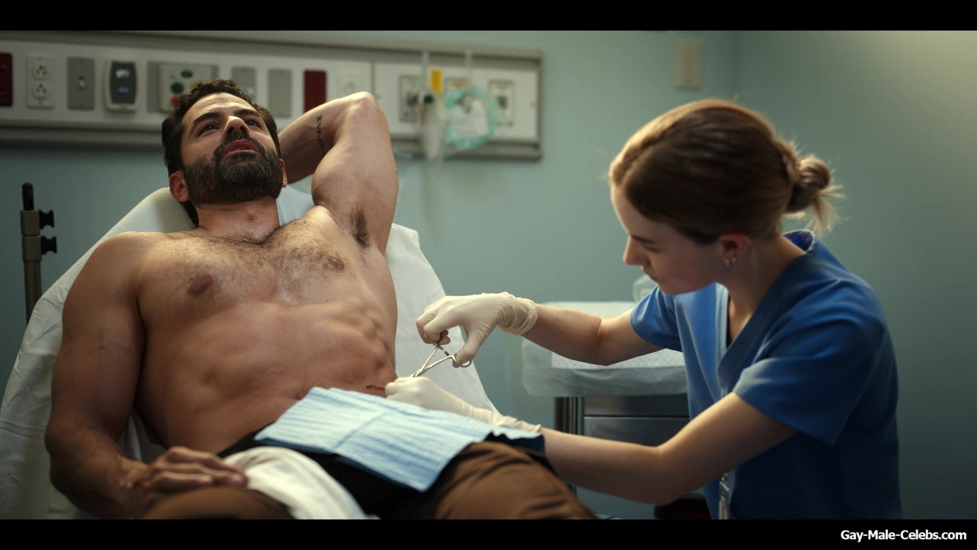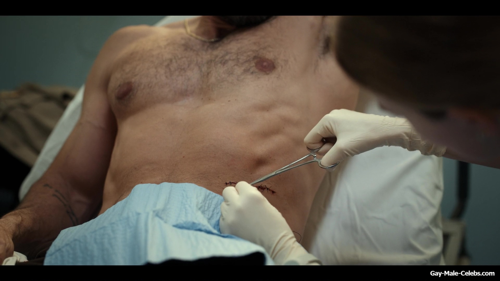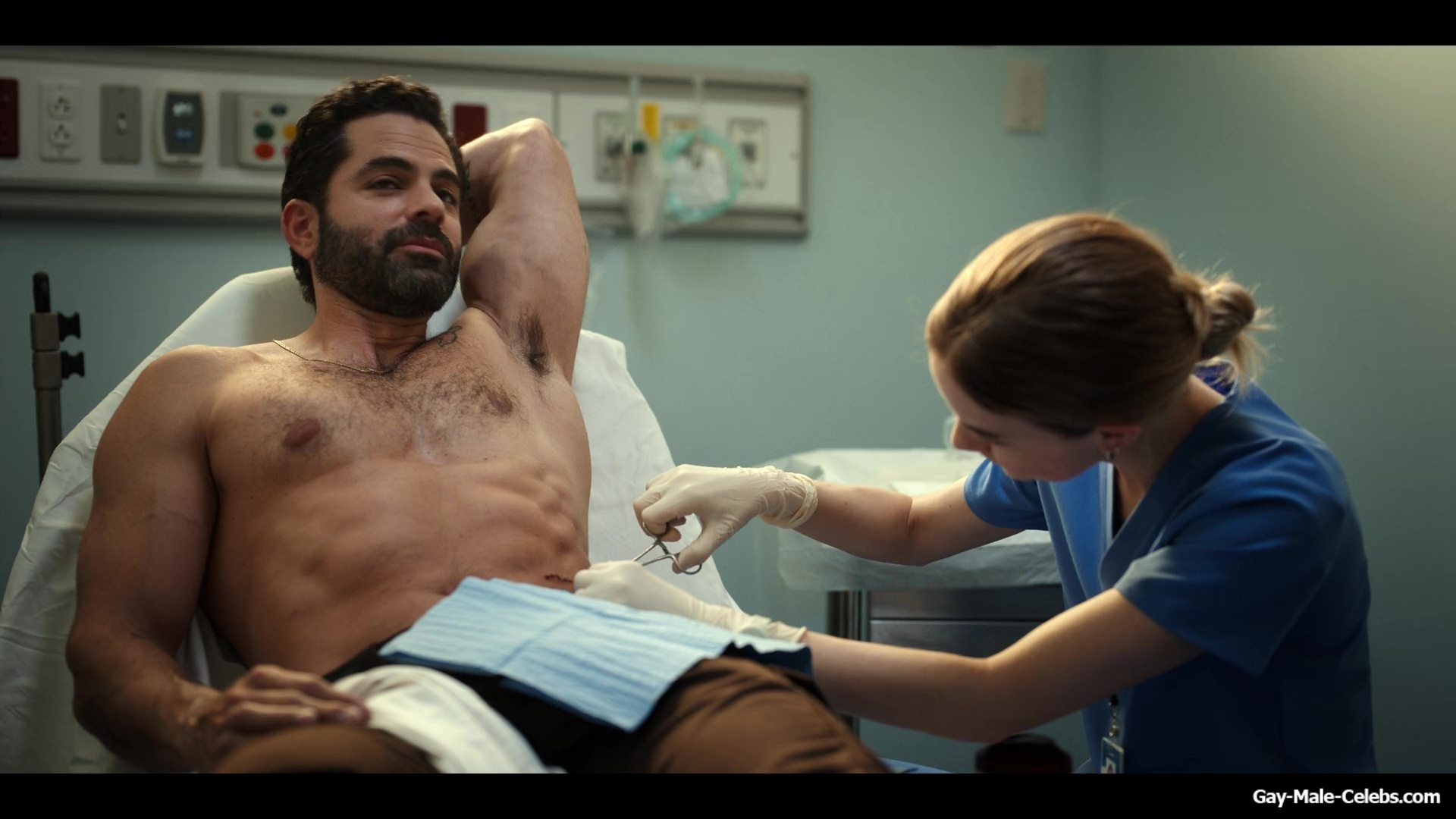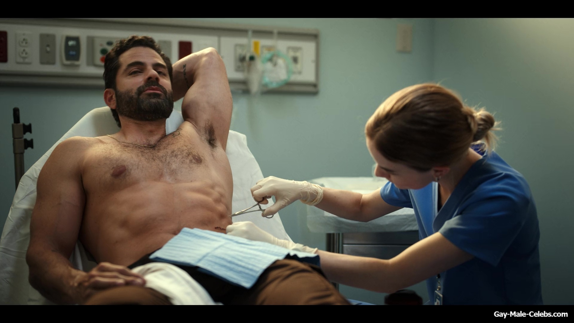 Gerardo Celasco has already shown us a lot, but you can still watch this hunk nude forever. This time Gerardo turns up the heat in “Pulse”. While a woman treats his wounds, we can admire his nude celeb torso. Gerardo obviously spends a lot of time in the gym, because his body is very juicy.