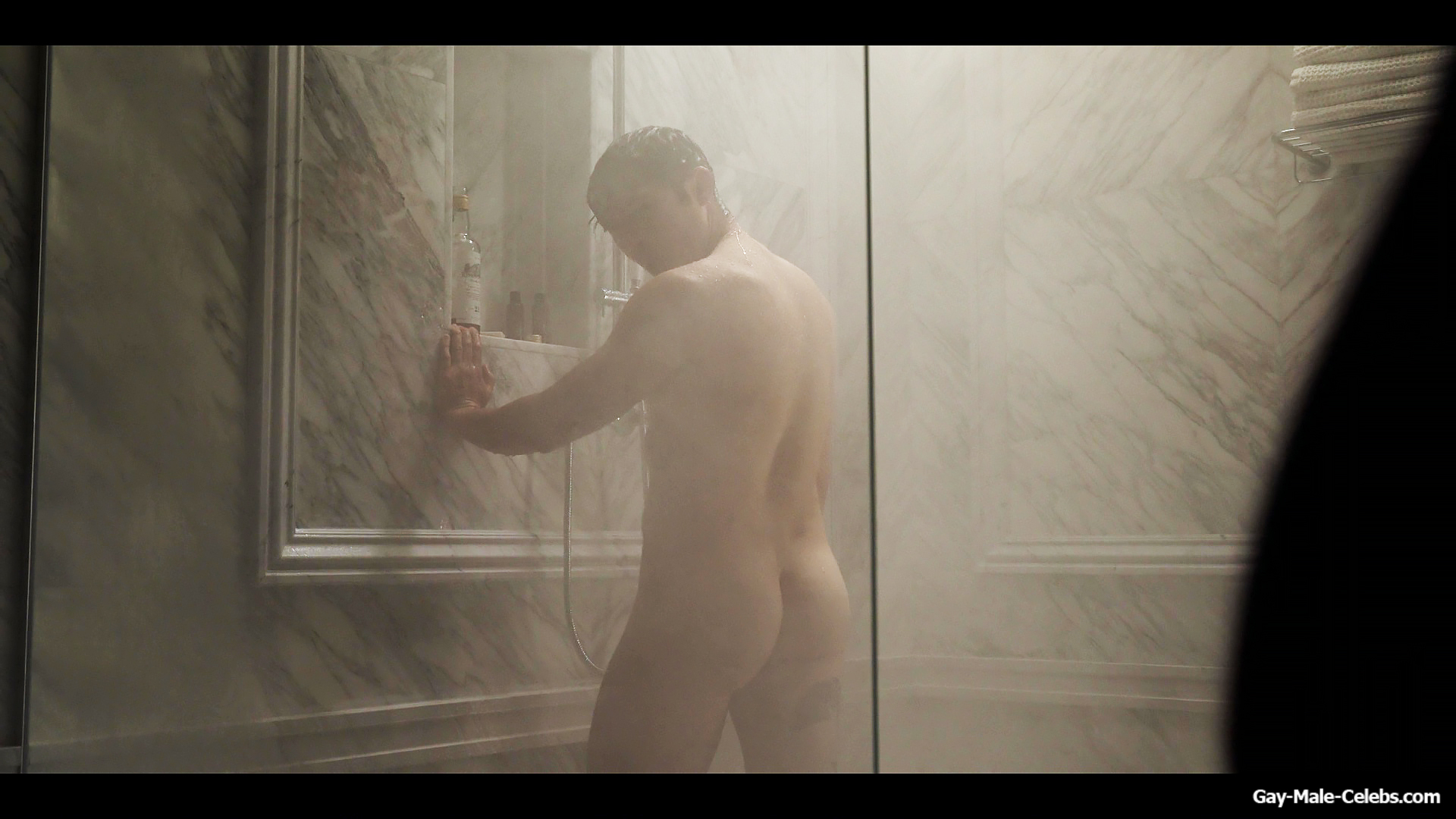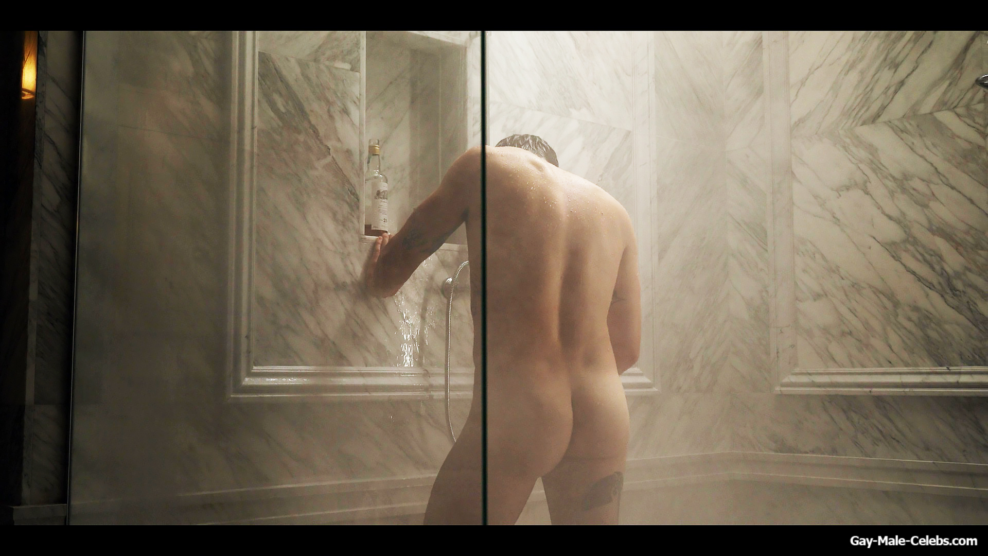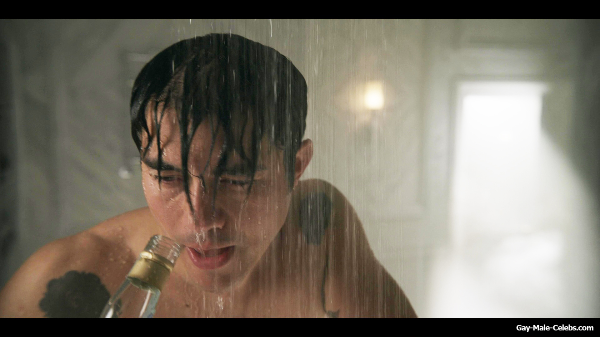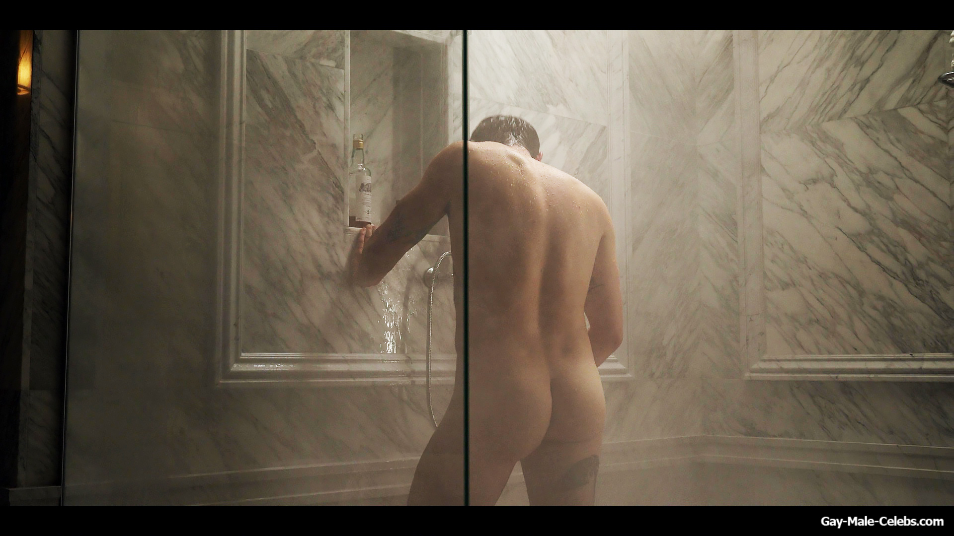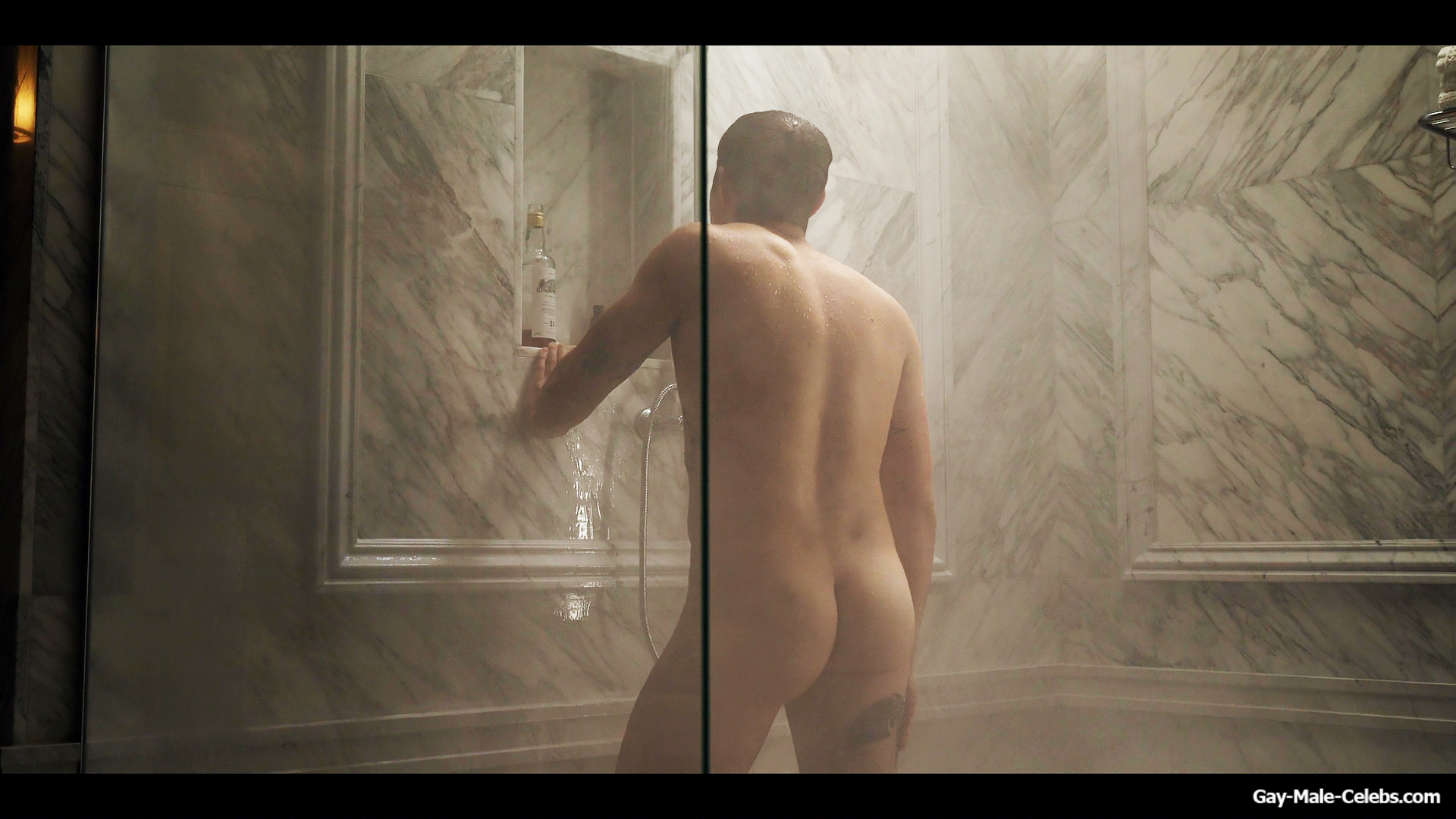 Henry Golding exposes in “Another Simple Favour”. Henry was sad, so he decided to get drunk while taking a shower. While he enjoys the alcohol, we can admire the naked figure of this hunk. Although he stands backwards and his penis is hidden from our eyes, but his tight ass is on full display.