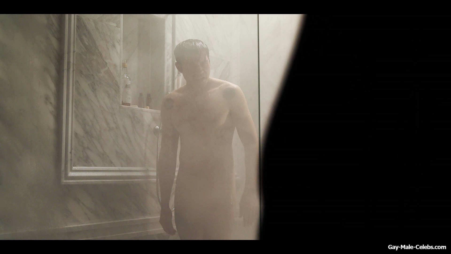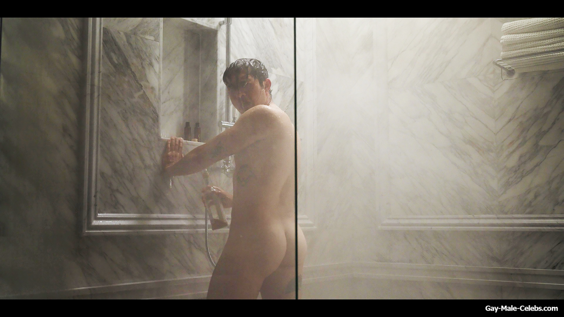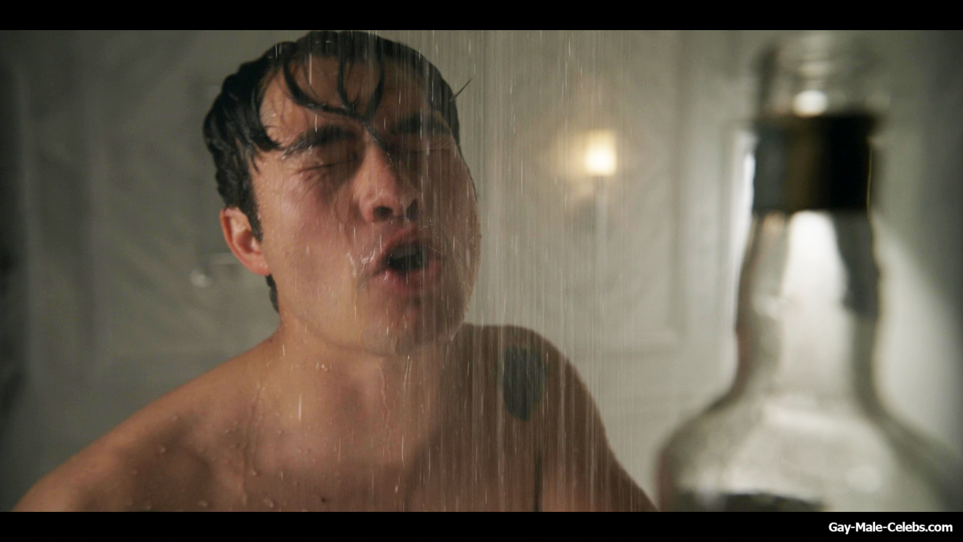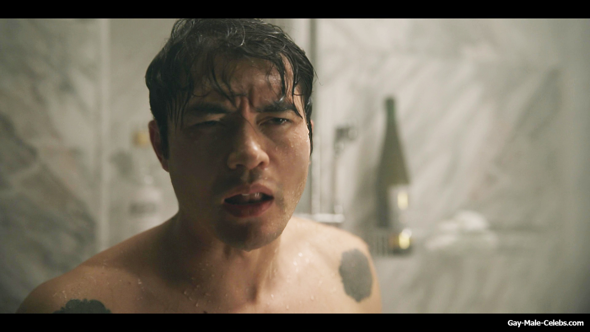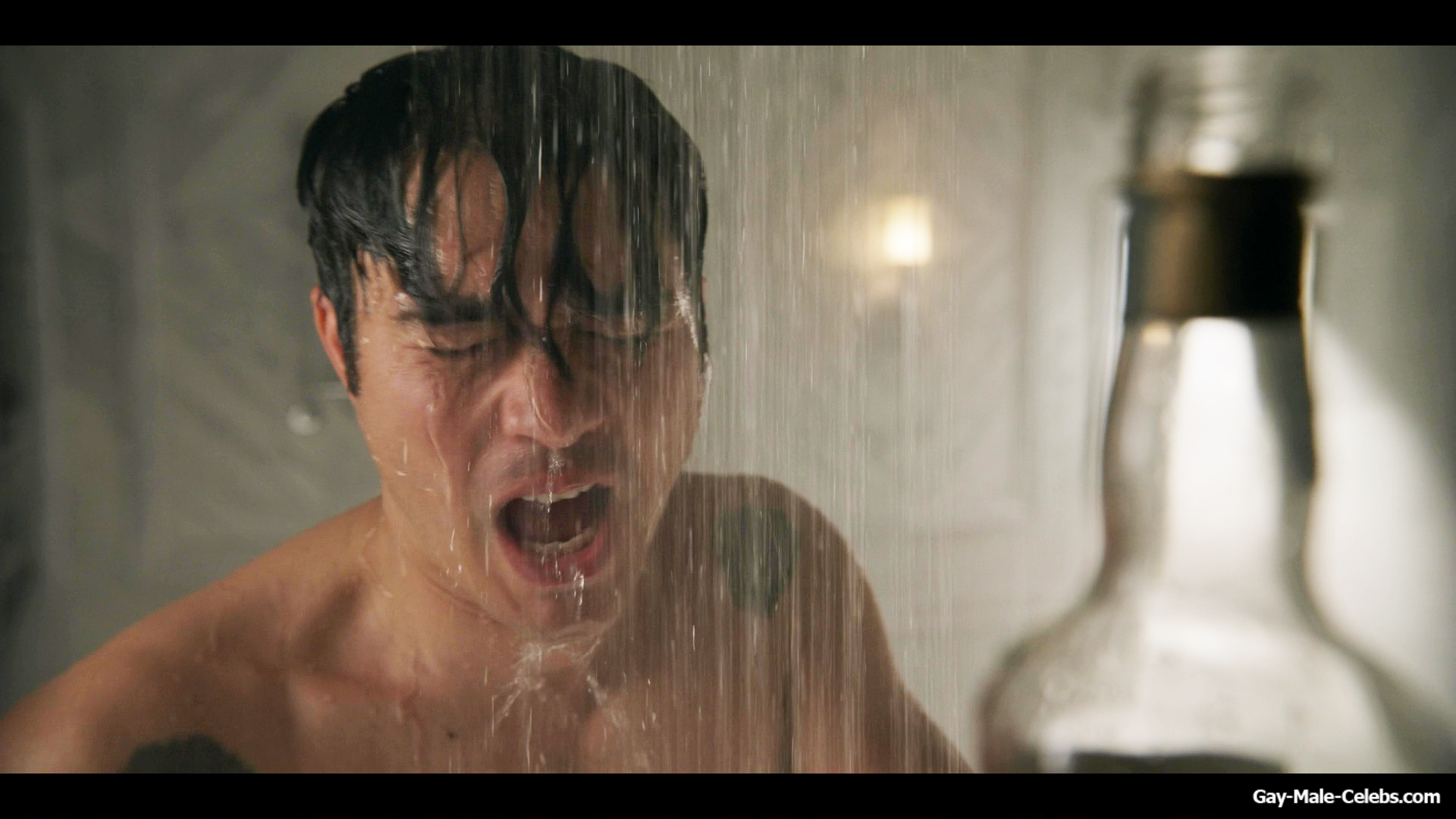 Henry Golding exposes in “Another Simple Favour”. Henry was sad, so he decided to get drunk while taking a shower. While he enjoys the alcohol, we can admire the naked figure of this hunk. Although he stands backwards and his penis is hidden from our eyes, but his tight ass is on full display.