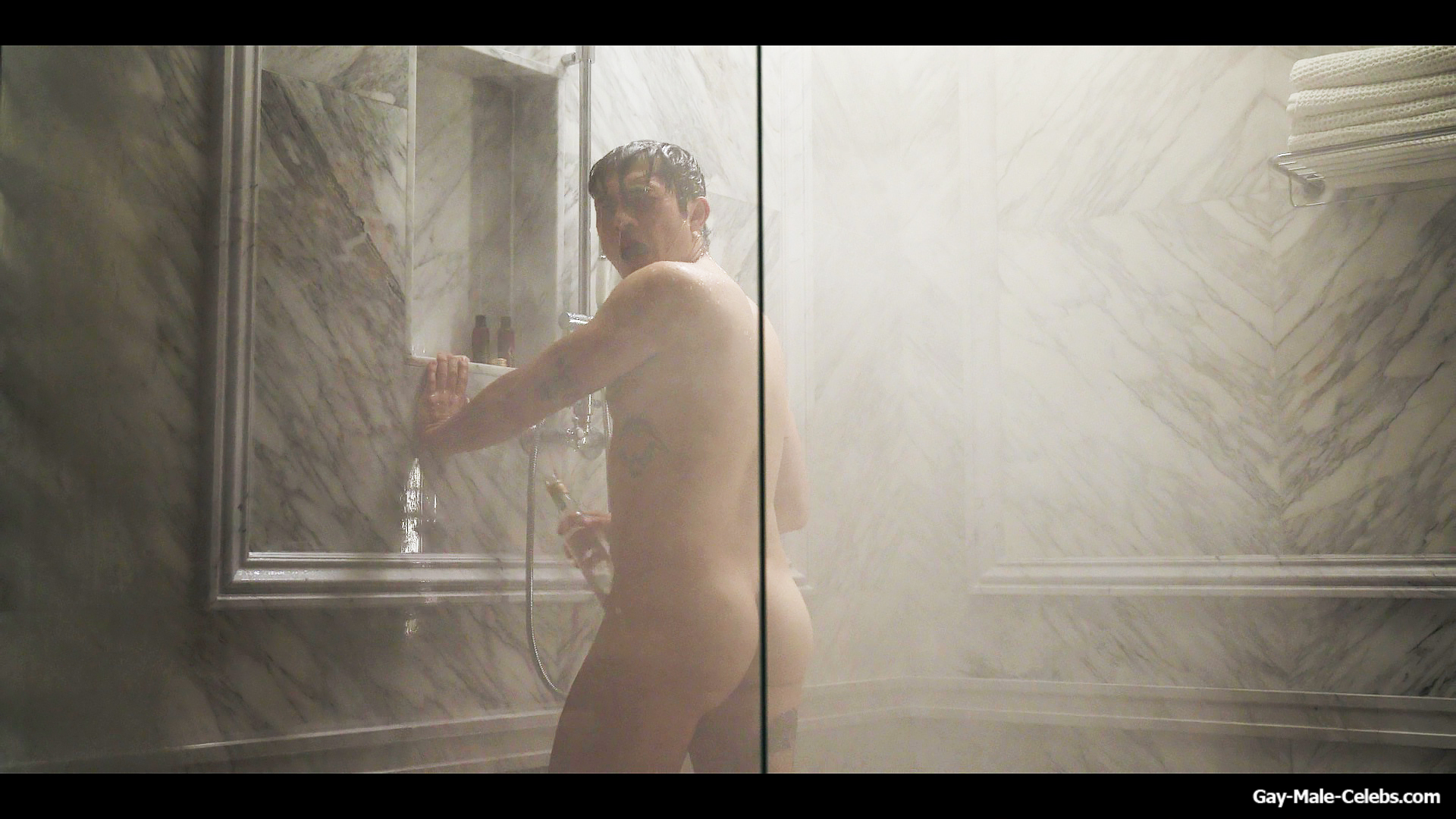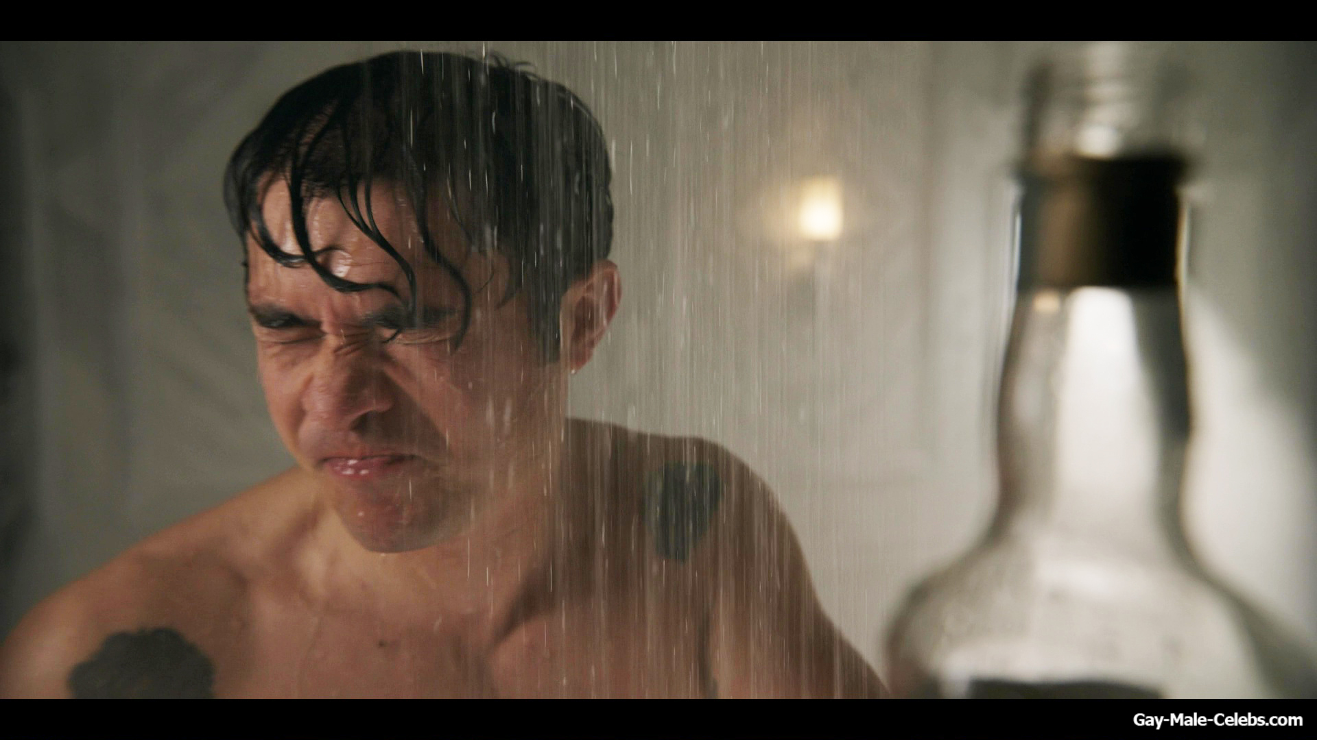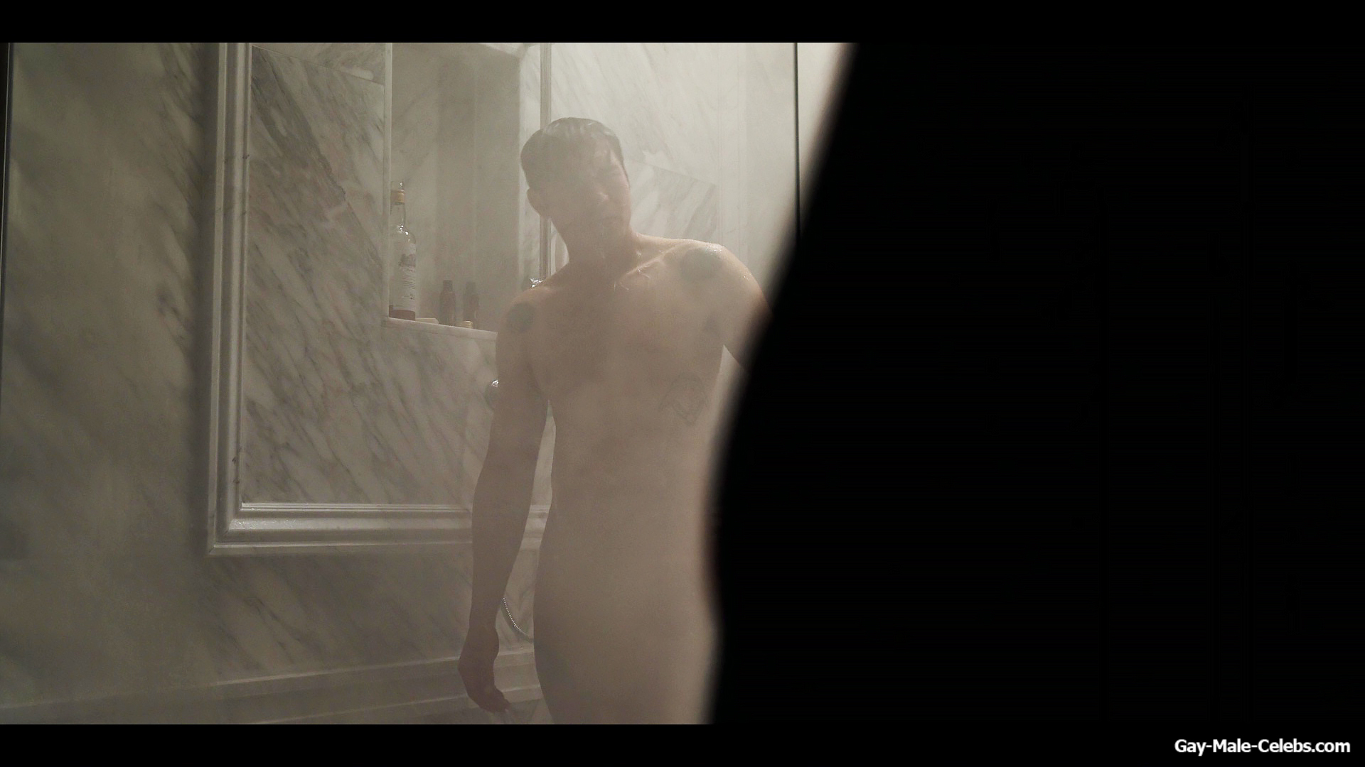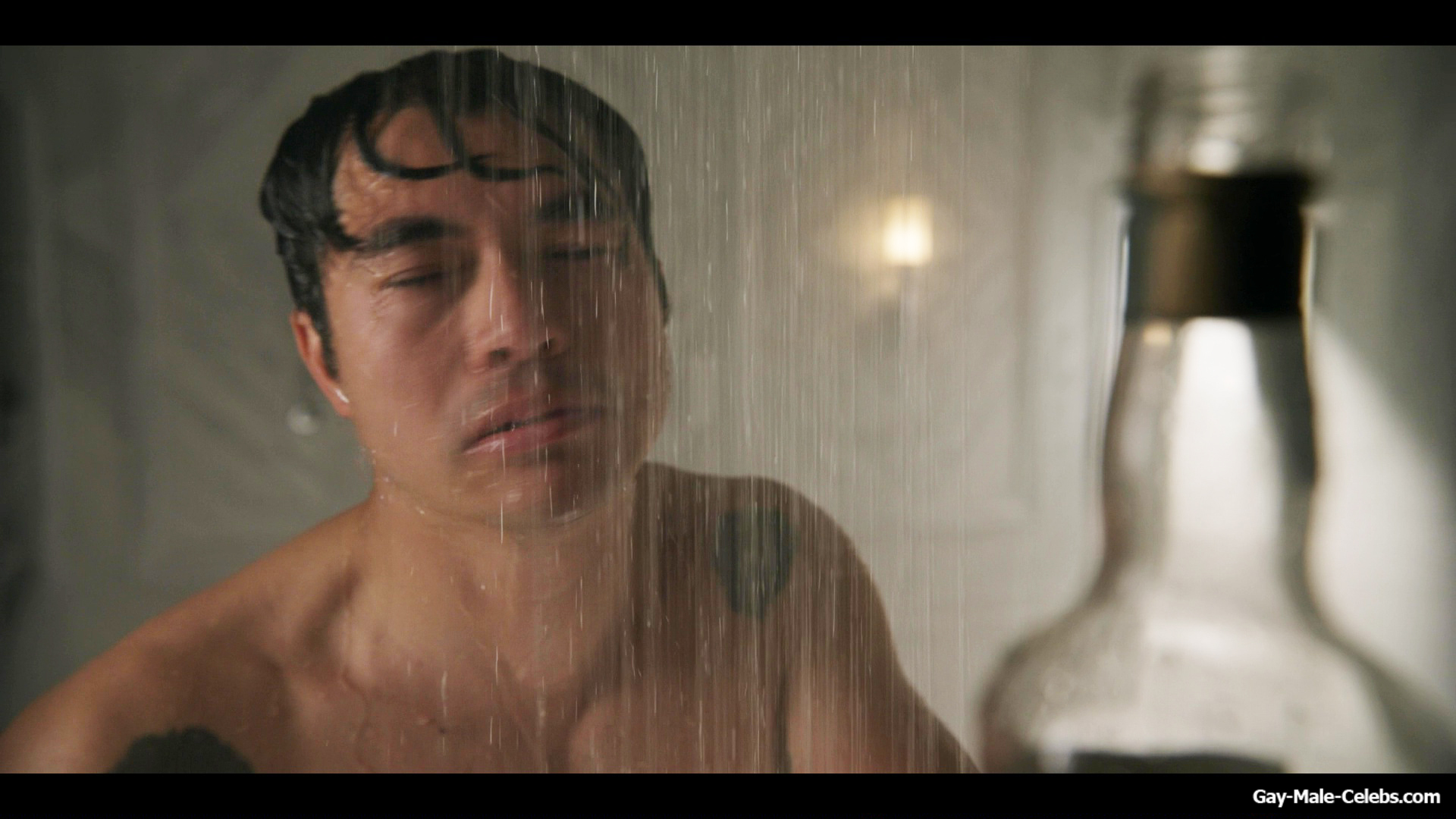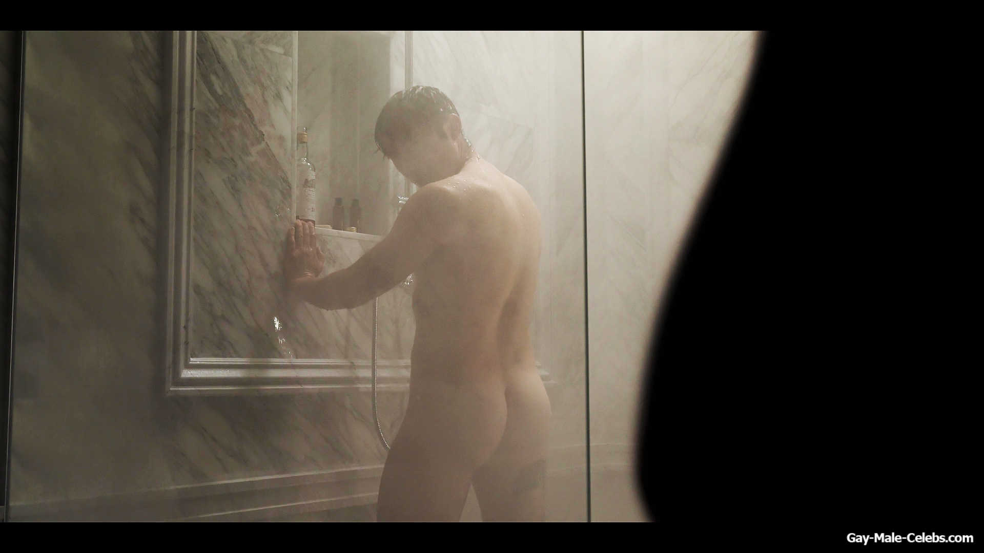 Henry Golding exposes in “Another Simple Favour”. Henry was sad, so he decided to get drunk while taking a shower. While he enjoys the alcohol, we can admire the naked figure of this hunk. Although he stands backwards and his penis is hidden from our eyes, but his tight ass is on full display.