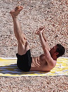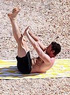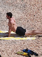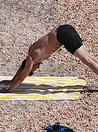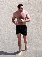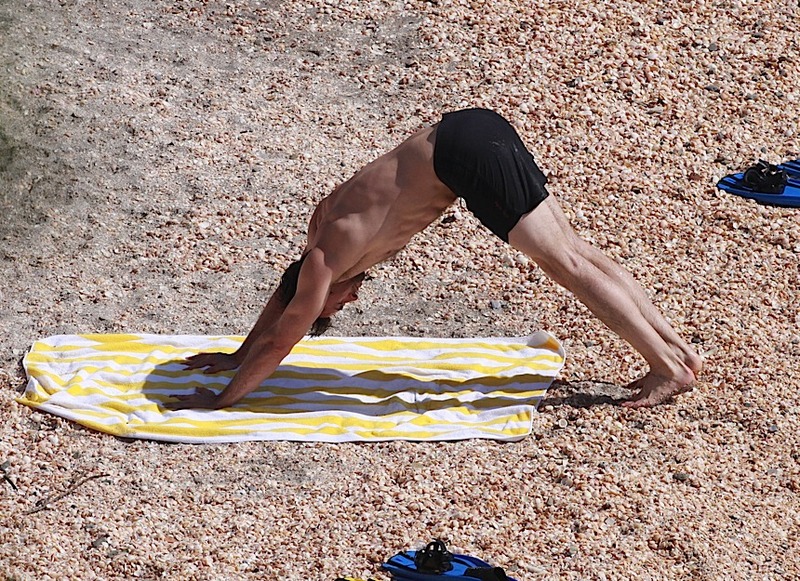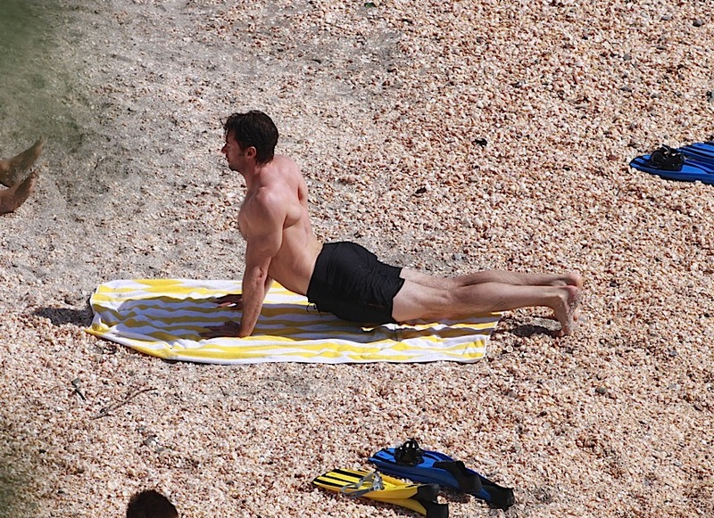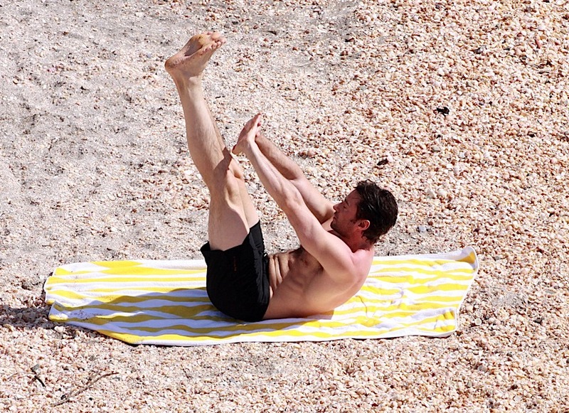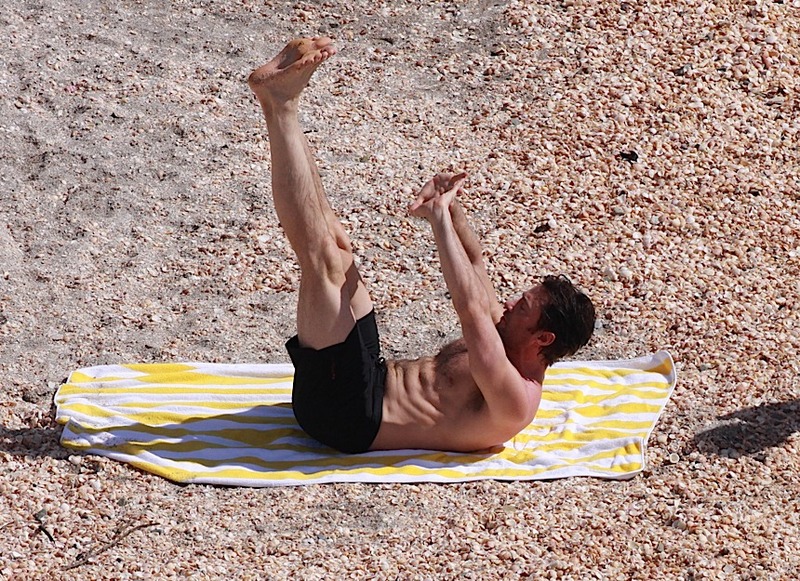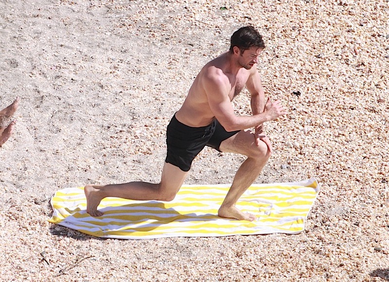 World class actor who played in blockbusters like the X-Men series, The Prestige or Les Misérables Hugh Michael Jackman is an Australian actor and with his determination to have a flawless physique for his next movie role we came into possession of some photos where he is stretching his muscular body and hairy chest on the beach. He demonstrated his enviable level of flexing in various yoga positions.