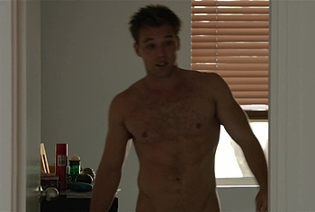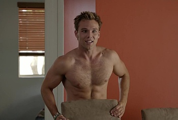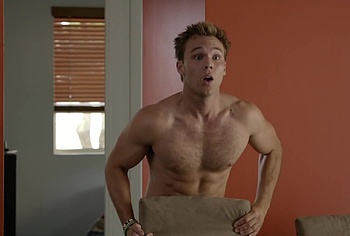 Lincoln Lewis demonstrates his pumped up body in “Tricky Business”. Lincoln walks out of the bedroom as if nothing had happened and suddenly notices that there is someone in the bedroom. Everything would be fine if it weren’t for one thing – Lincoln Lewis was completely naked. And we can admire not only his nude torso but also his hairy pubis. It’s a pity that this handsome guy managed to cover his penis with a chair. But no doubts that Lincoln’s penis is quite impressive.