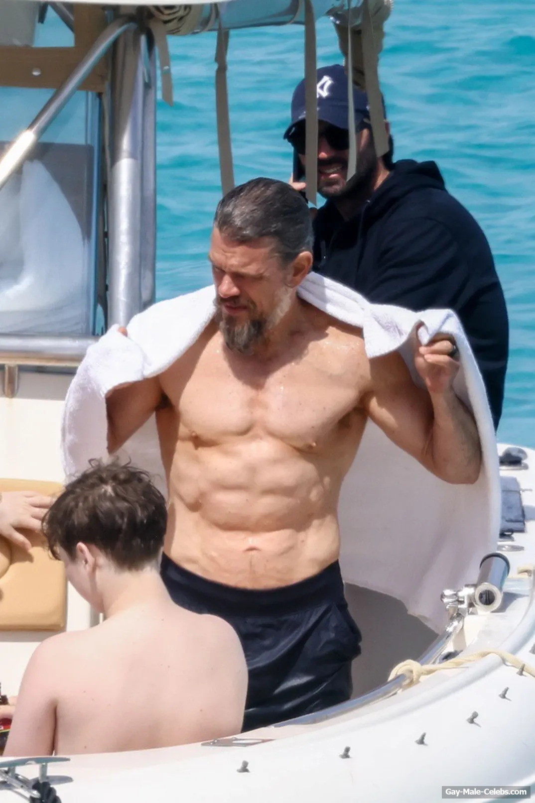 At 54 years old Matt Damon has a stunning body and he clearly should not be shy to bare it. In this post there are paparazzi photos of this handsome man on vacation. While Matt is having fun on the yacht swimming and sunbathing, we can admire his pumped up torso and small nipples.