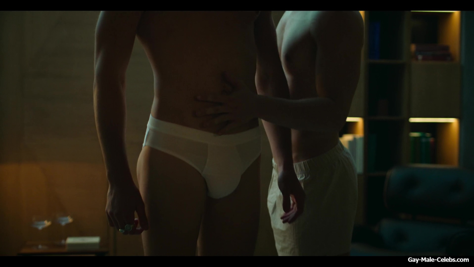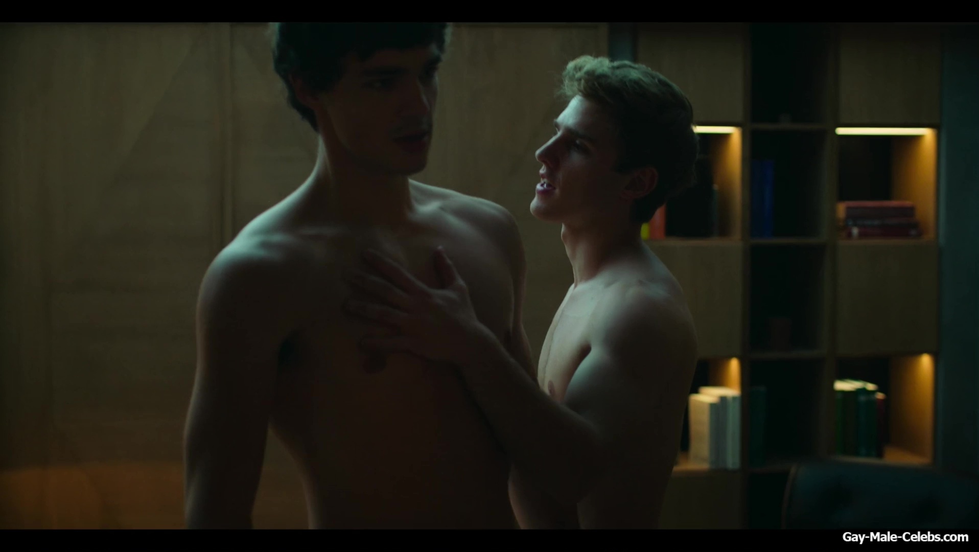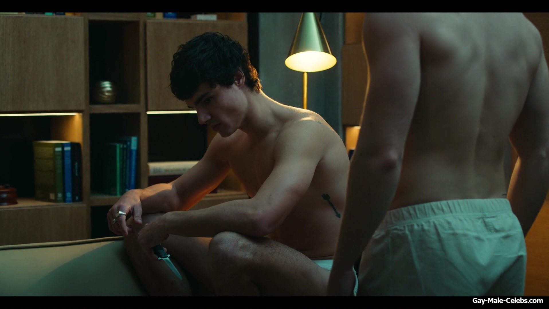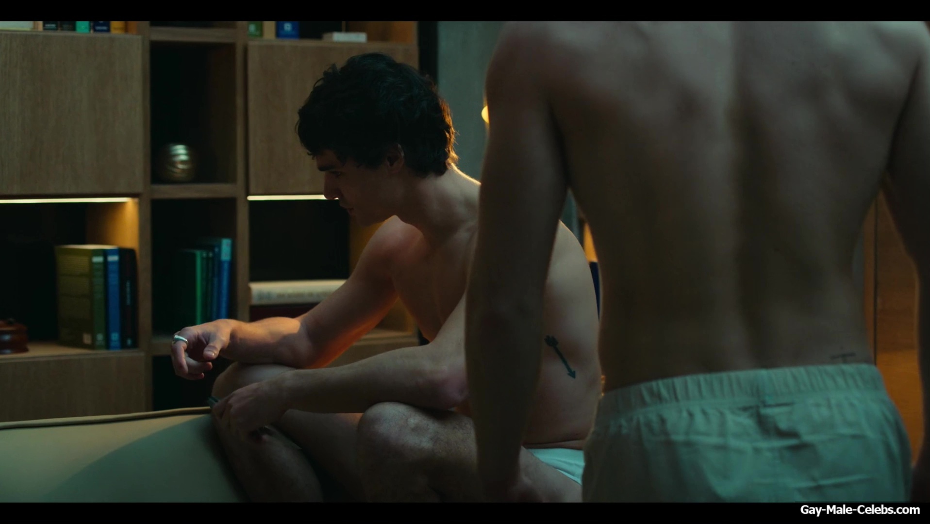 You can’t miss this hot scene with Nuno Gallego and Fernando Lindez from “Elite”! These two had a great time together. Shirtless Nuno Gallego pounced on Fernando and began covering his body with kisses. This hunk has an amazing body, just look at those pink nipples! And Nuno Gallego’s bare butt deserves special attention. Fernando Lindez doesn’t stay on the sidelines either and allows us to admire his pumped-up torso. And his impressive bulge is visible even through those white briefs.