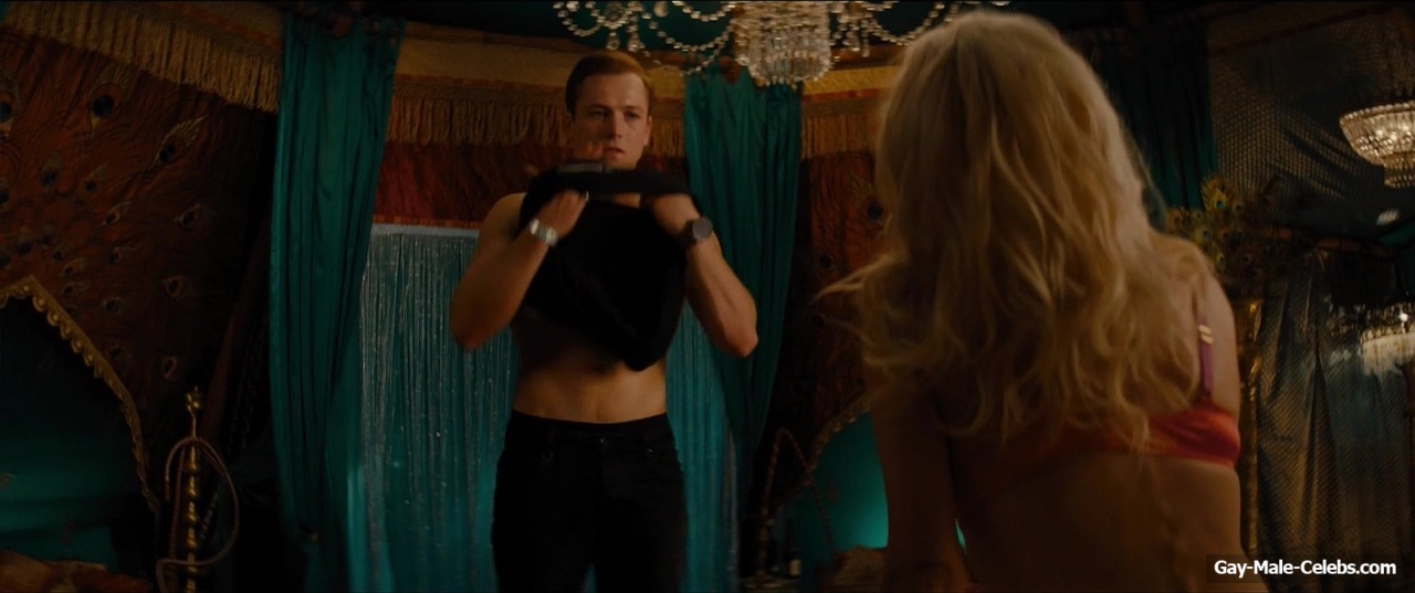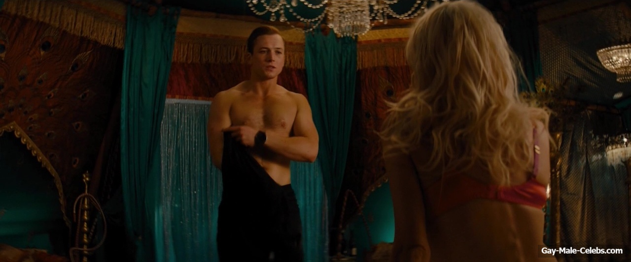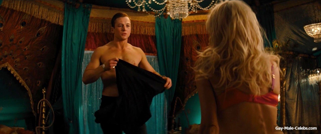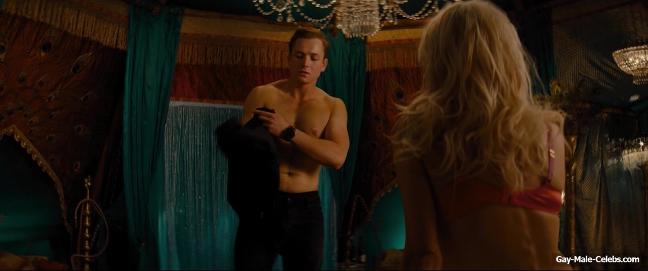 Taron Egerton reveals his naked torso in “Kingsman: The Golden Circle”. After hot sex, Taron started to get dressed. But there was still a moment when we could admire his toned body. This handsome guy spends a lot of time in the gym to maintain such an impressive physique.