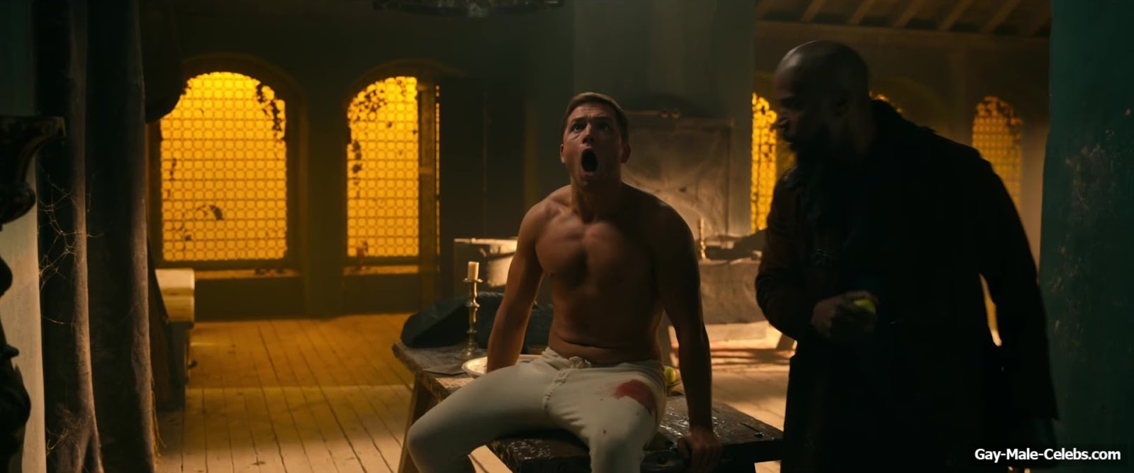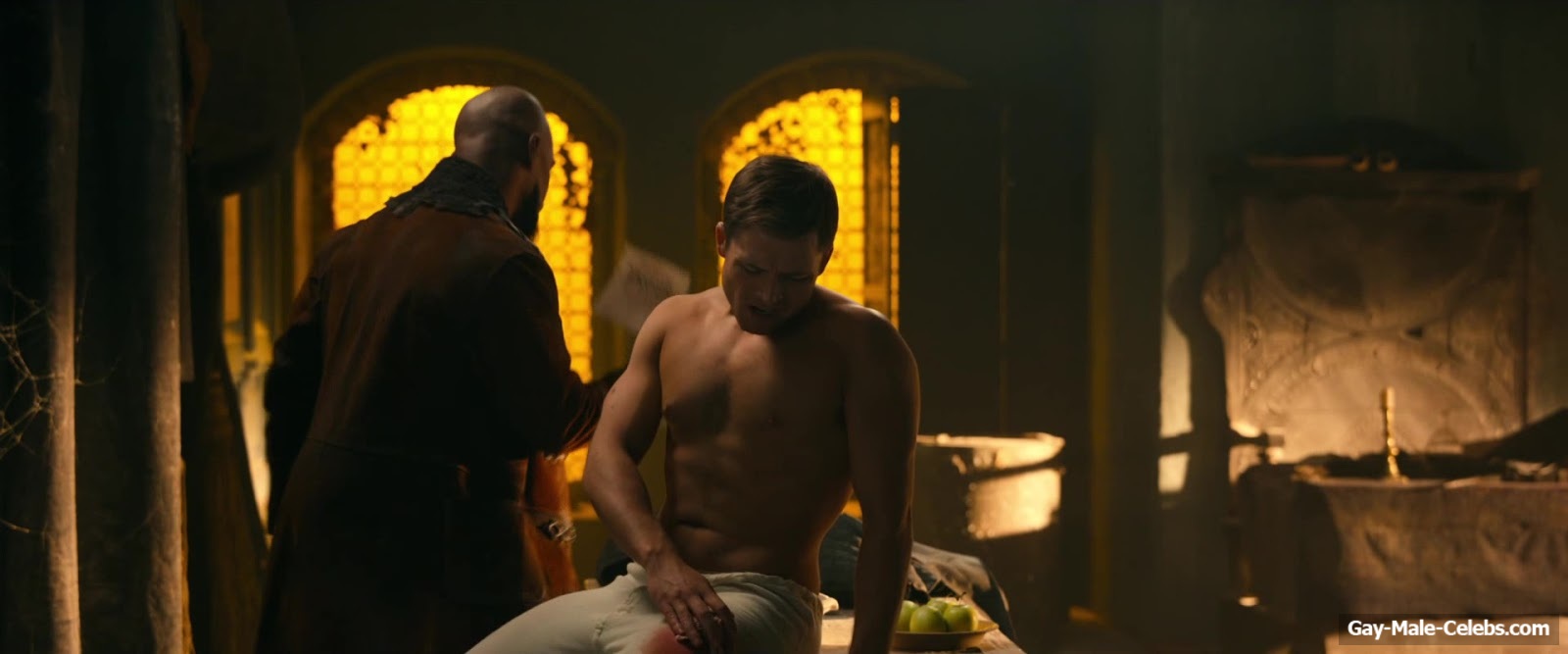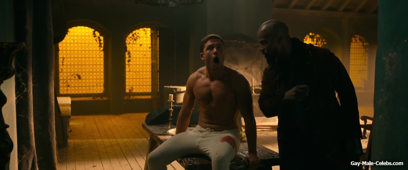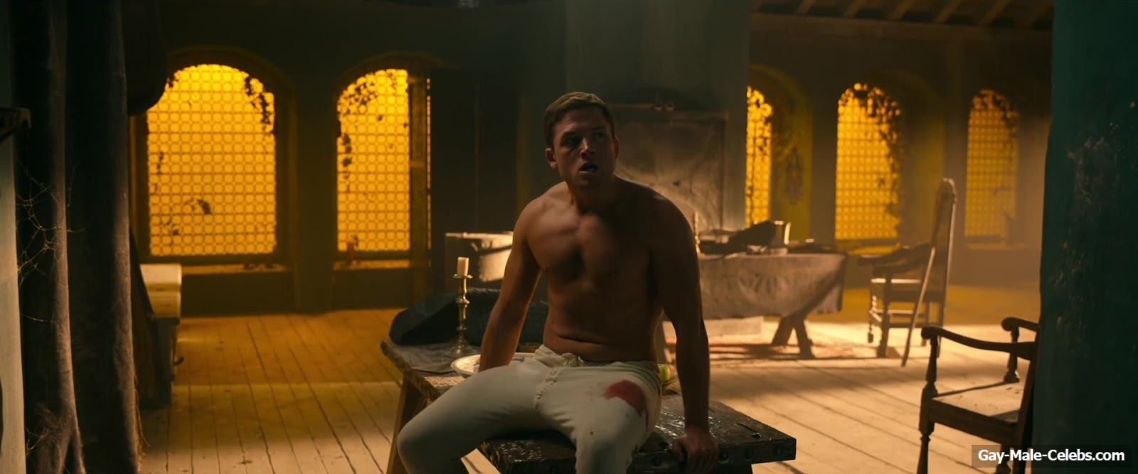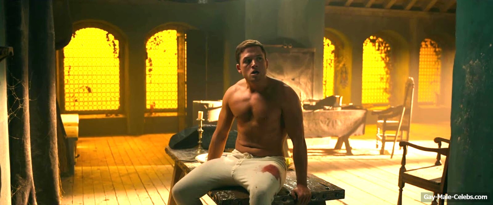 Taron Egerton revealed his naked torso in “Robin Hood”. Taron sat wounded, wearing only white pants, giving us a beautiful view of his bare upper body. It’s a shame he didn’t take off his pants, because we’re sure that Taron Egerton’s butt is a sight to behold.