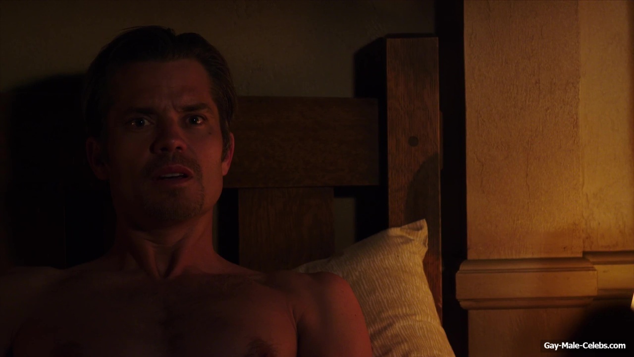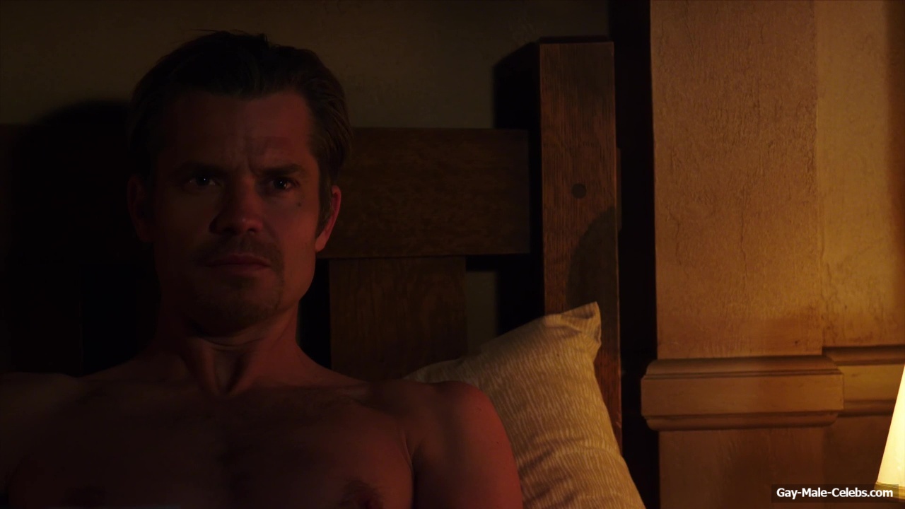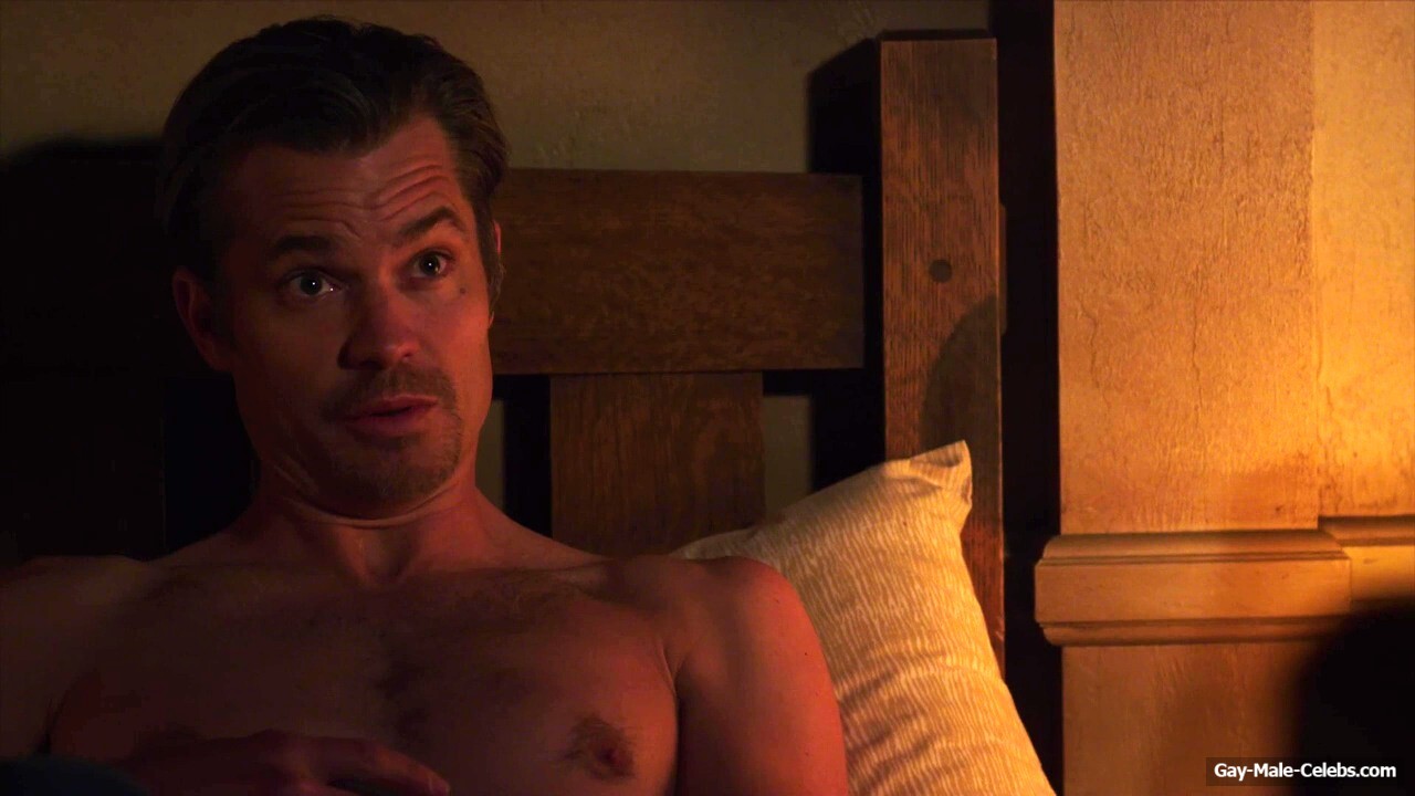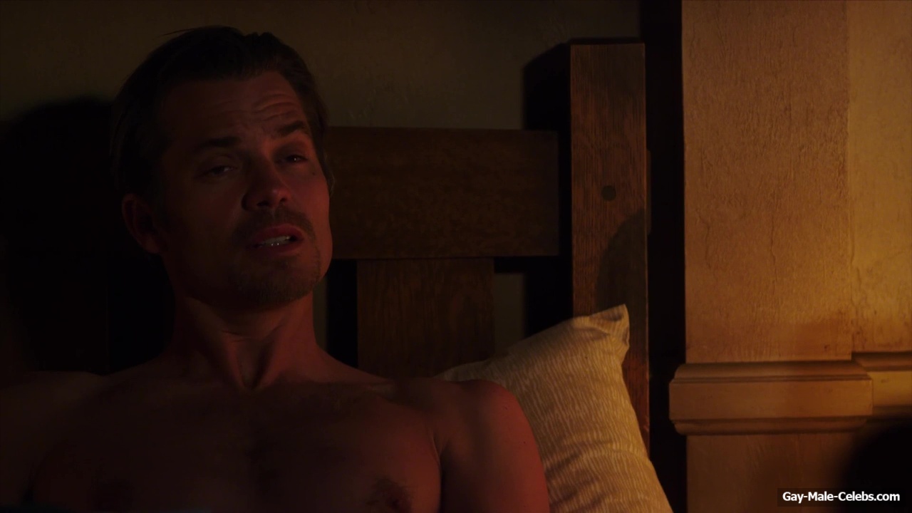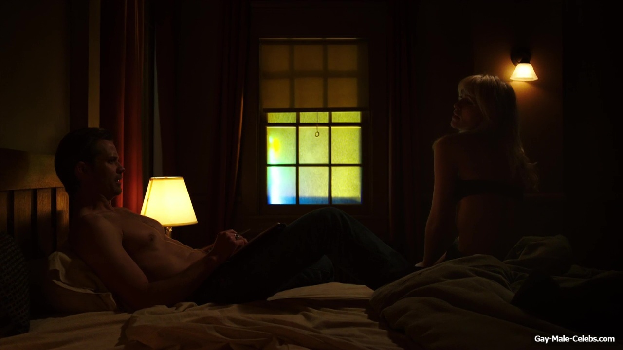 Timothy Olyphant shows off his nude celeb torso in “Justified”. Timothy lies on the bed with a girl. The dim lighting only adds to the sexiness of this scene. The girl probably wanted to feel Timothy Olyphant’s cock inside her, but unfortunately he refused her, and we can’t enjoy their passionate sex.