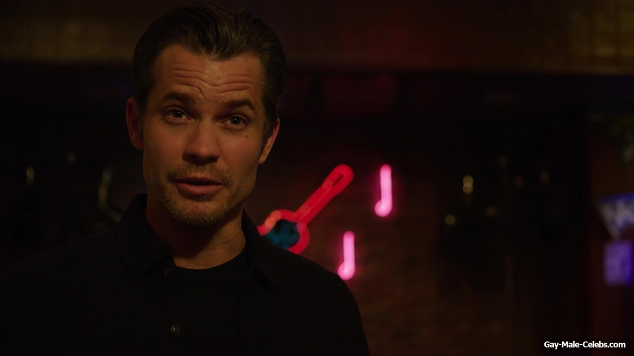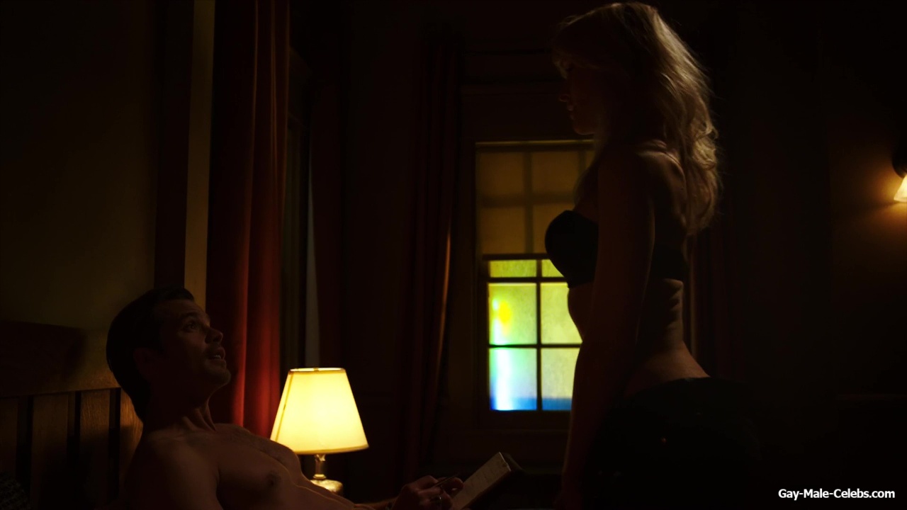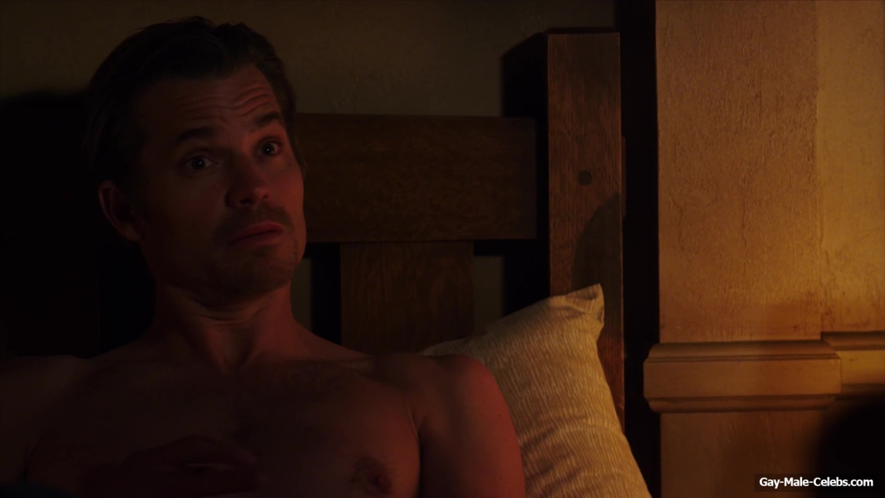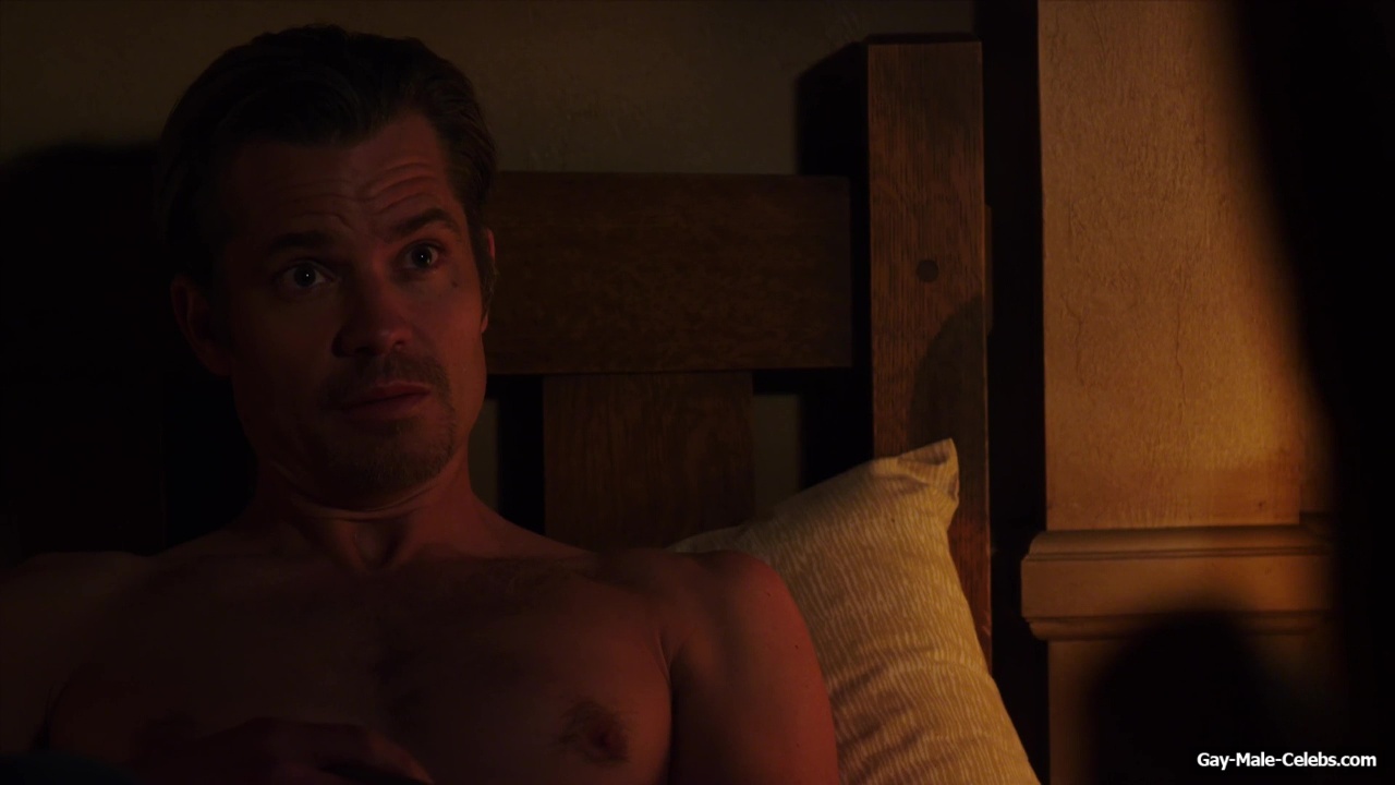Timothy Olyphant shows off his nude celeb torso in “Justified”. Timothy lies on the bed with a girl. The dim lighting only adds to the sexiness of this scene. The girl probably wanted to feel Timothy Olyphant’s cock inside her, but unfortunately he refused her, and we can’t enjoy their passionate sex.